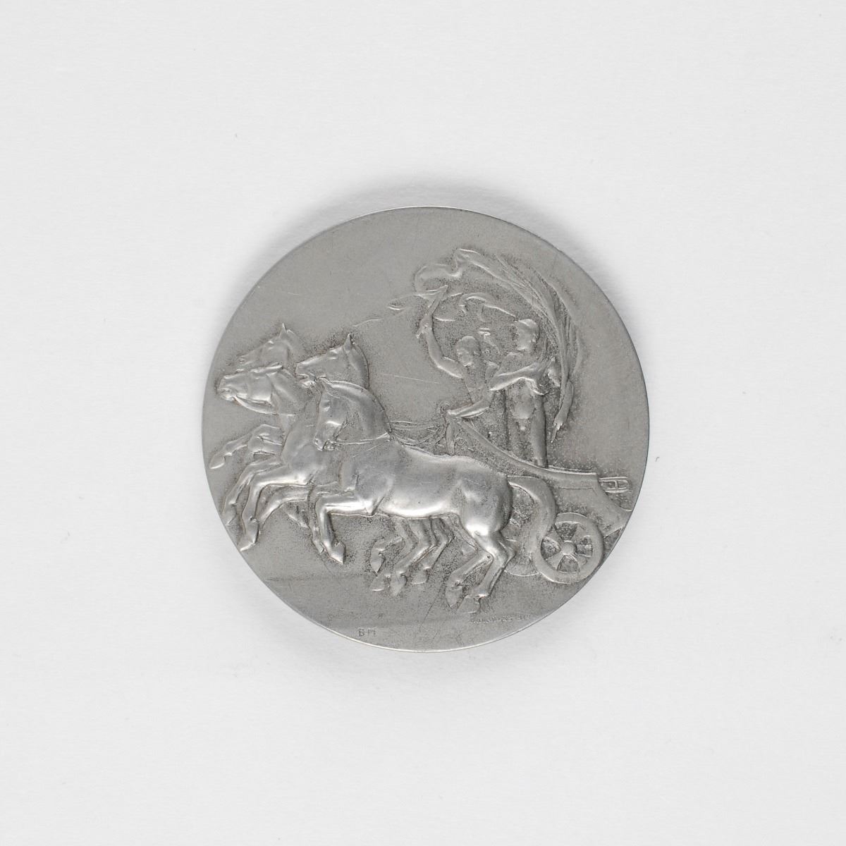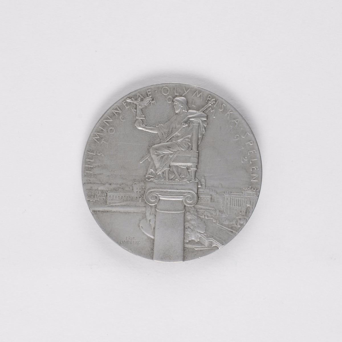 Participation medal issued for the Stockholm 1912 Summer Olympics. Pewter, 51 mm, 45 gm, by Bertram Mackennal/Erik Lindberg. The front features a raised quadriga with charioteer and judge, preparing to present an athlete with the palm of victory; the reverse bears Zeus seated on a Ionic column in relief, holding a small figure of the goddess Nike, with the city of Stockholm in the background and raised lettering along the top. A powerful example of an early Olympic participation medal.