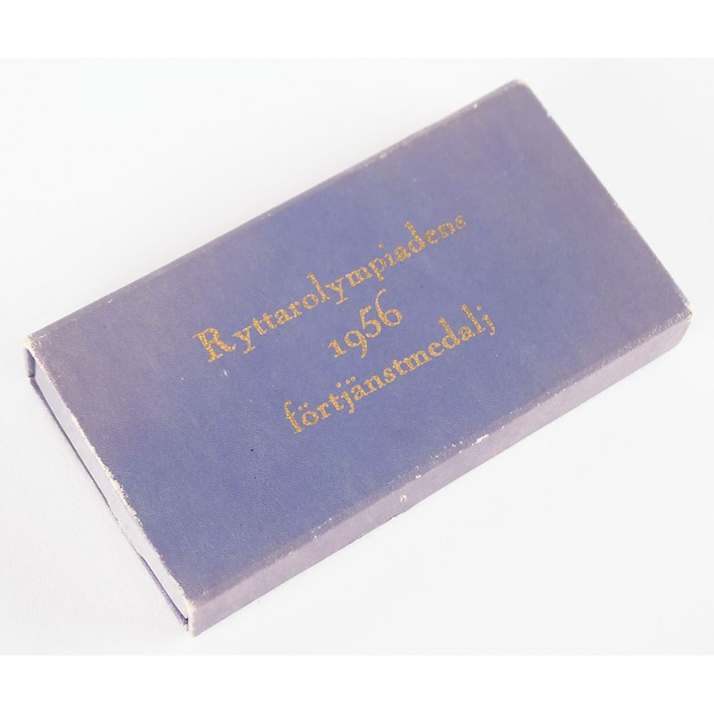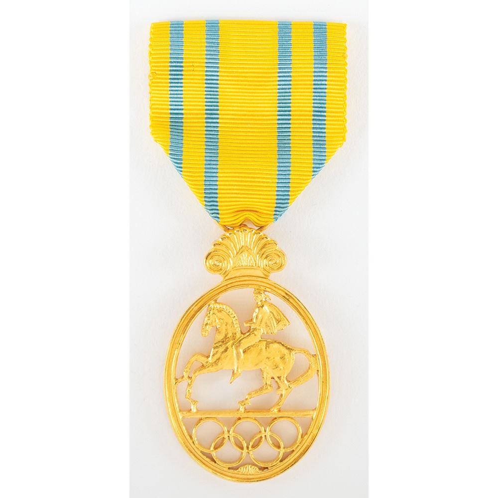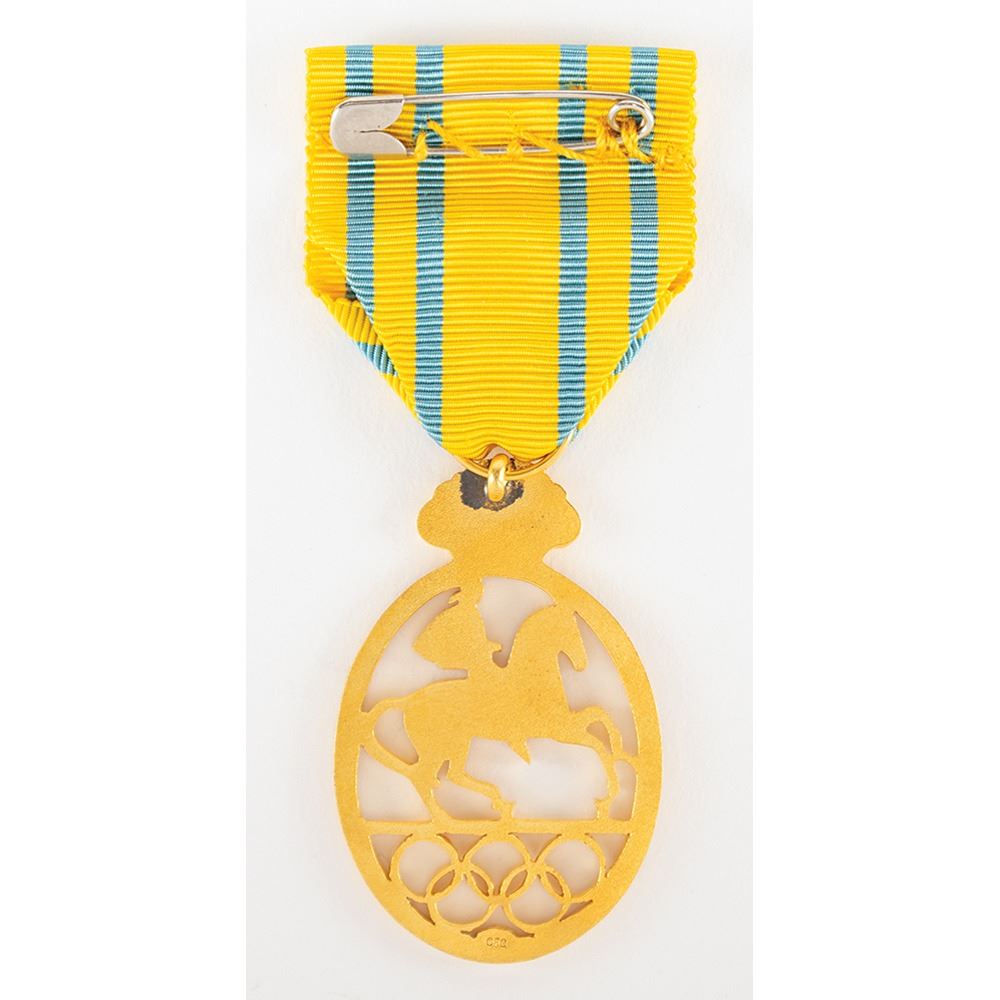 Rare official Order of Merit badge for the equestrian events held in Stockholm during the 1956 Summer Olympics. Gold-plated, 12 gm, 31 mm x 44 mm, depicting a classical horse and rider above Olympic rings. Suspended from the badge is a yellow and blue ribbon that measures 38 mm in length. Includes the original blue paper box with gilt titling to cover (translated): “Equestrian Olympics 1956 Merit Medal.†In fine condition.