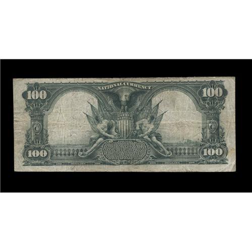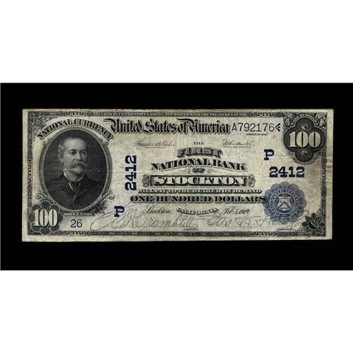 <B>Stockton, CA</B></I> - $100 1902 Plain Back Fr. 704 <B>The First NB</B></I> Ch. # (P)2412<BR>This great note is the only high denomination large size example known from Stockton. Pleasing pen signed <B>Fine+++,</B></I> a truly rare note likely to see some spirited competition. Ex. Howerdel September 2004.