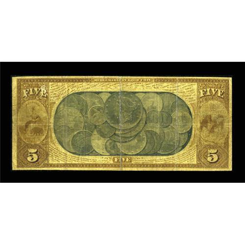<B>Stockton, CA</B></I> - $5 Original National Gold Bank Note Fr. 1140 <B>The First National Gold Bank</B></I> Ch. # 2077<BR> Just over a dozen $5 examples are reported from this scarcer National Gold Bank, with this the second finest known. The note has a few well hidden repaired splits, but the repairs are well done and barely noticeable. The appearance is of an even higher grade piece than the note's technical grade, with the paper bright, the gold coin vignette strong, and the signatures clear. <B>Fine. </B></I><BR><I>From The Thomas M. Flynn Collection</B></I><BR><BR><b>Shipping:</b> Coins & Currency (<a target="_blank" href="http://www.heritageauctions.com/common/shipping.php">view shipping information</a>)