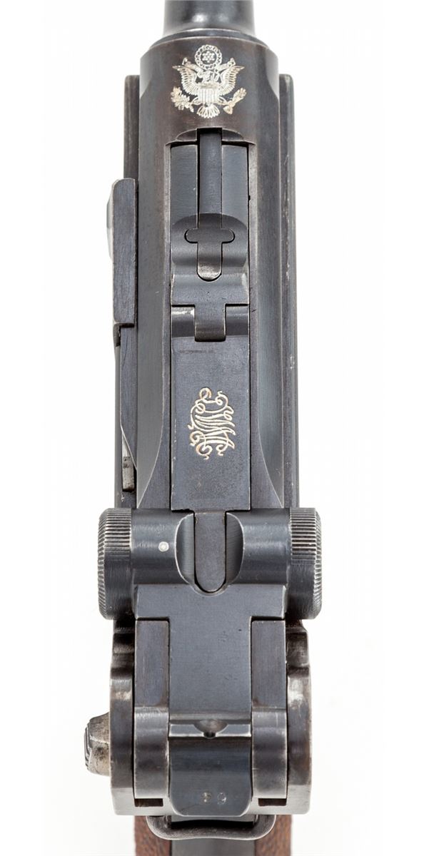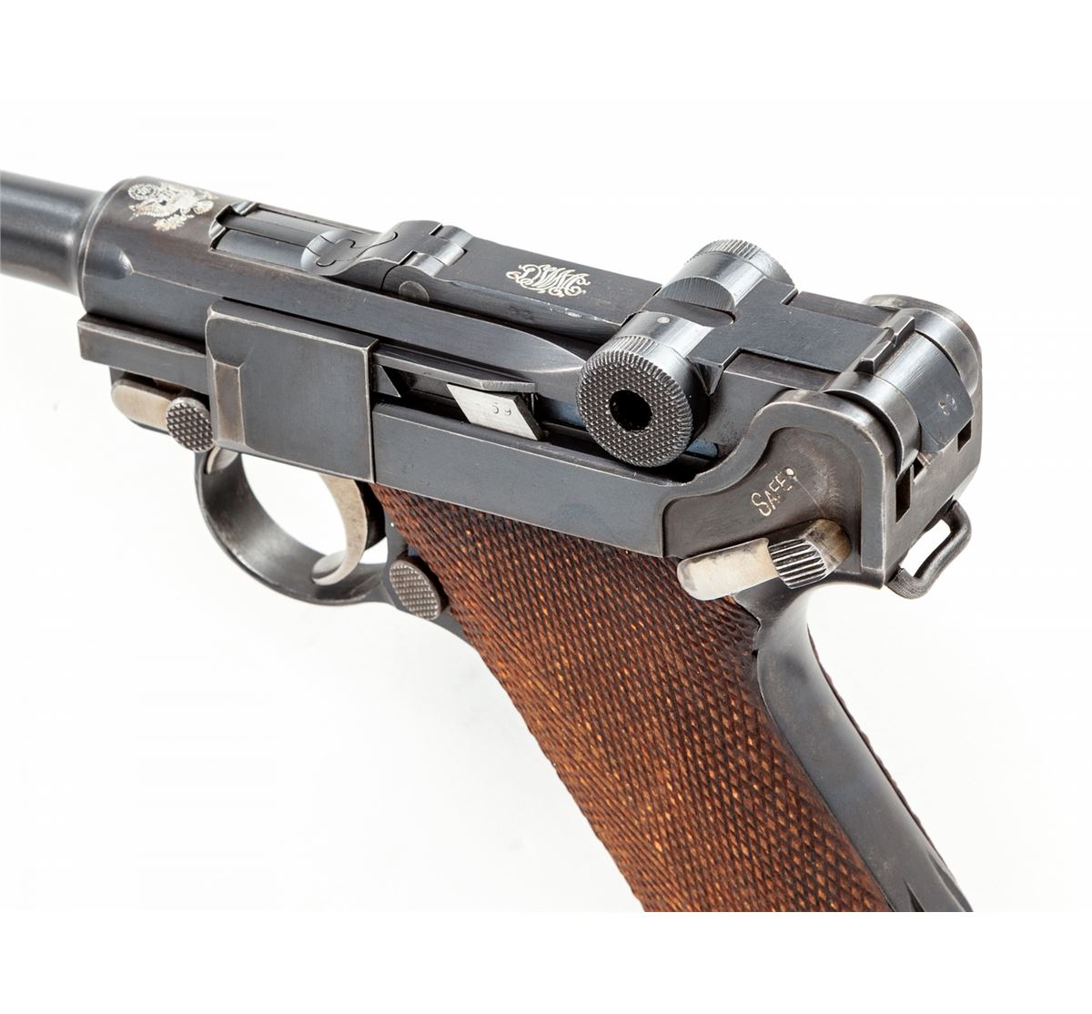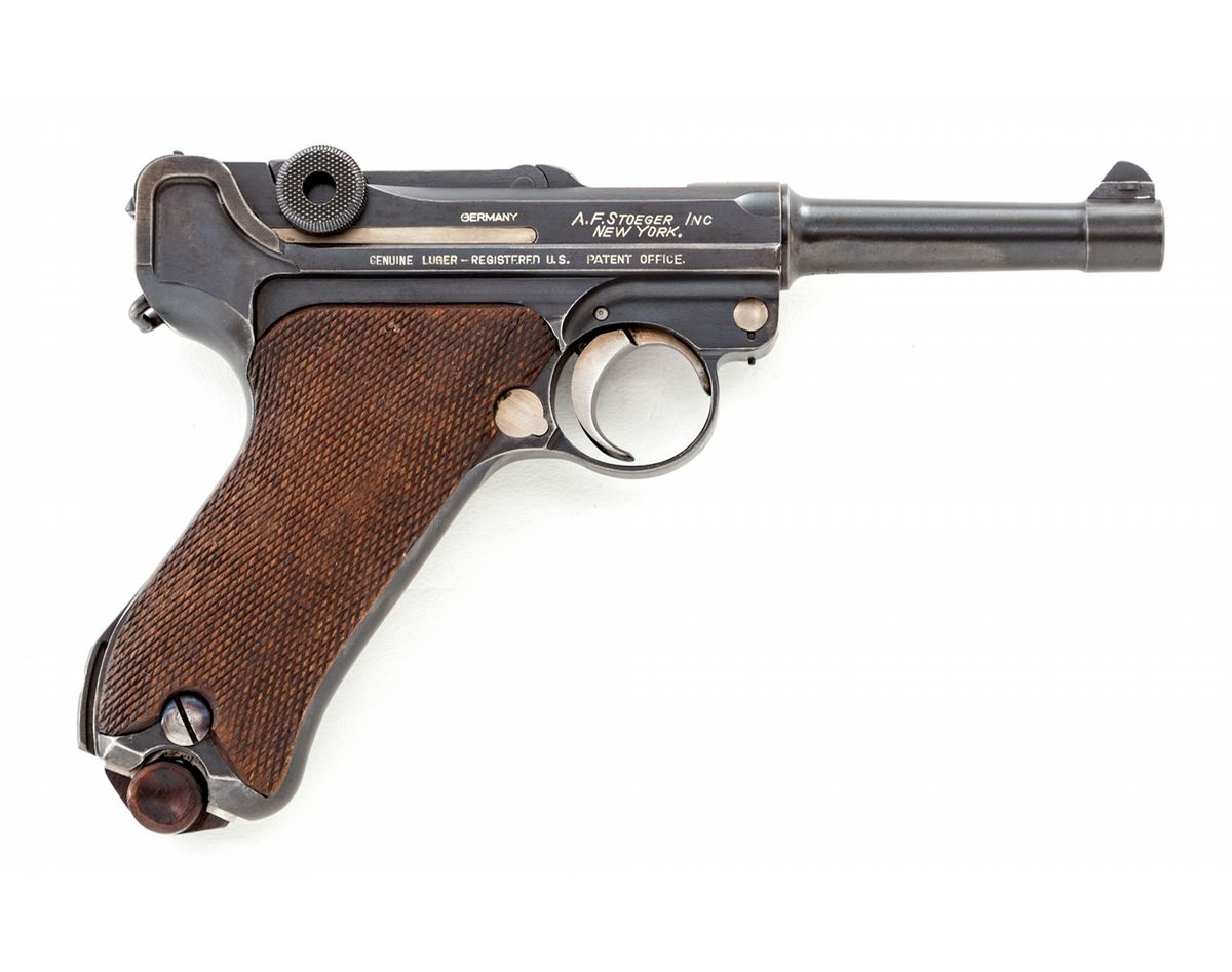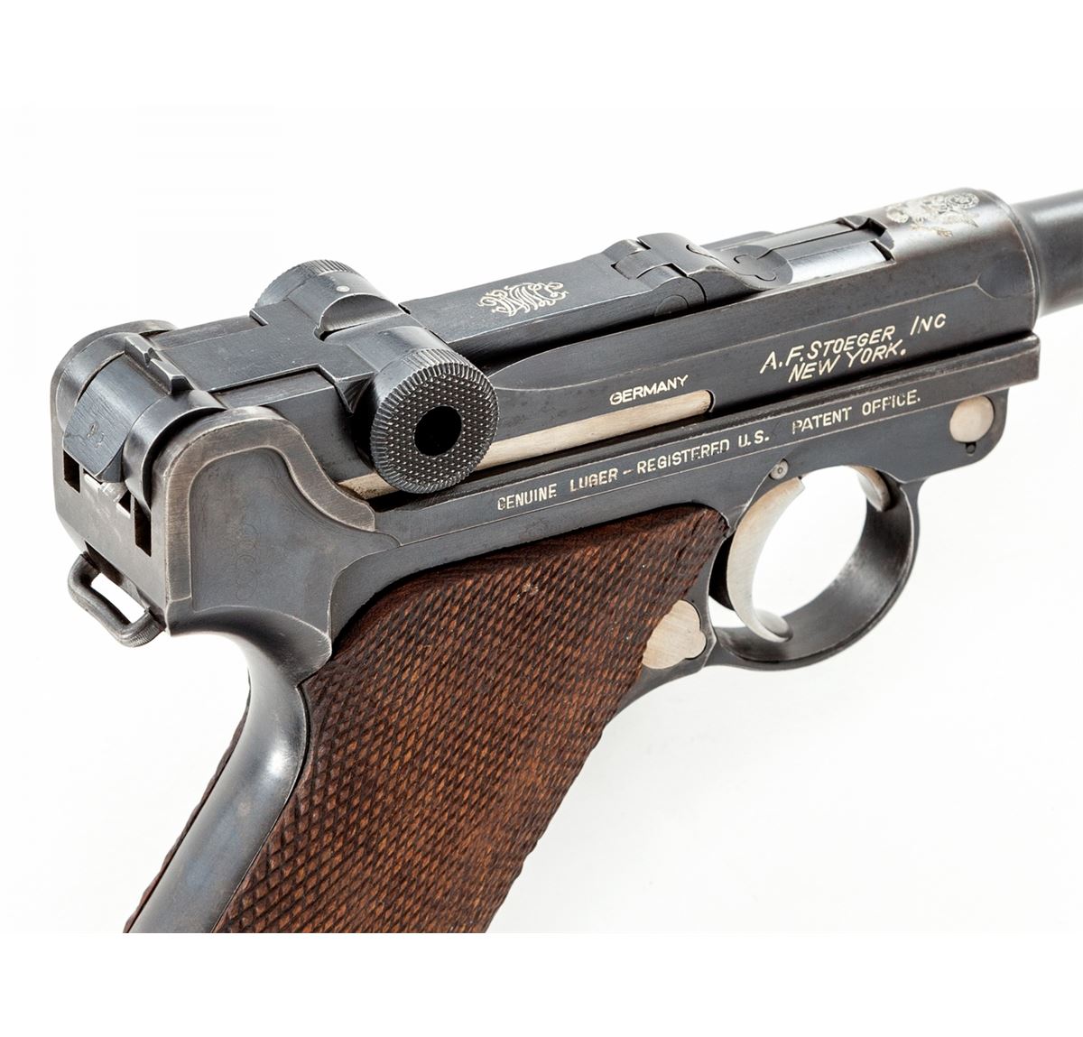 Stoeger Three-Line American Eagle Luger, #559V, .30 Luger cal., 3-3/4'' barrel, blue finish with straw small parts, checkered walnut grips, with one tin-plated magazine with unmarked walnut base. American eagle over chamber, DWM to toggle link, right side marked ''Germany'', ''A.F. Stoeger Inc/New York.'' to upper receiver; frame rail marked ''Genuine Luger - Registered U.S. Patent Office.'' Upper portion of thumb safety area marked ''Safe'', extractor marked ''Loaded''. Mauser assembled these pistols using parts that came from DWM in 1930. This pistol shows a faint ''(crown)/N'' proofmark to left side of upper receiver just forward of sideplate. Pictured on page 283 of the book, ''Weimar and Early Nazi Lugers'', by Jan C. Still, when it was in the Don Hallock collection. Condition is fine to near excellent retaining approx. 96% thinning and toning blue, with light thinning and toning to front and backstrap. Highpoints of sideplate and part of safety cove show possible touchup. Grips with mild general flattening. Action remains crisp, bore is fine. Est.: $4,500-$7,000. (C&R/PPT)