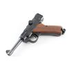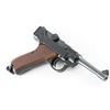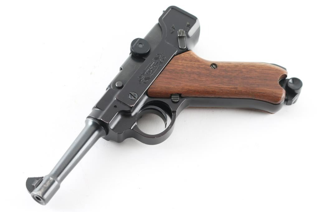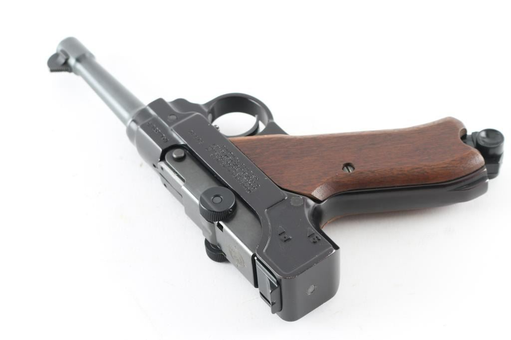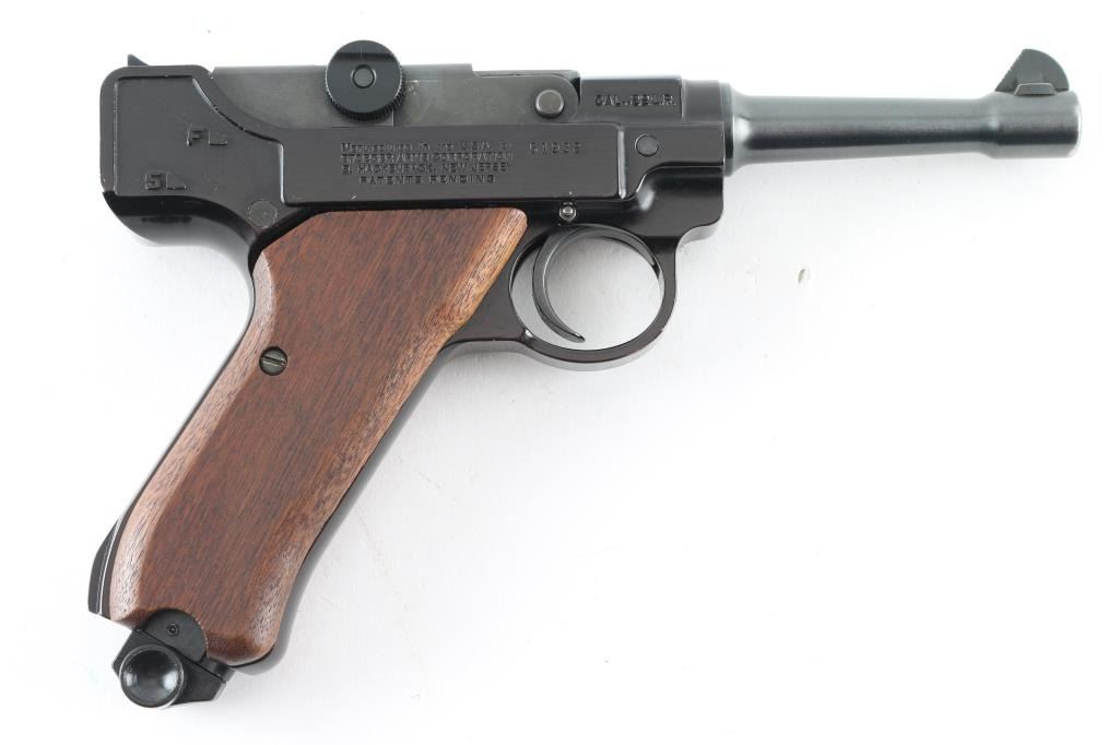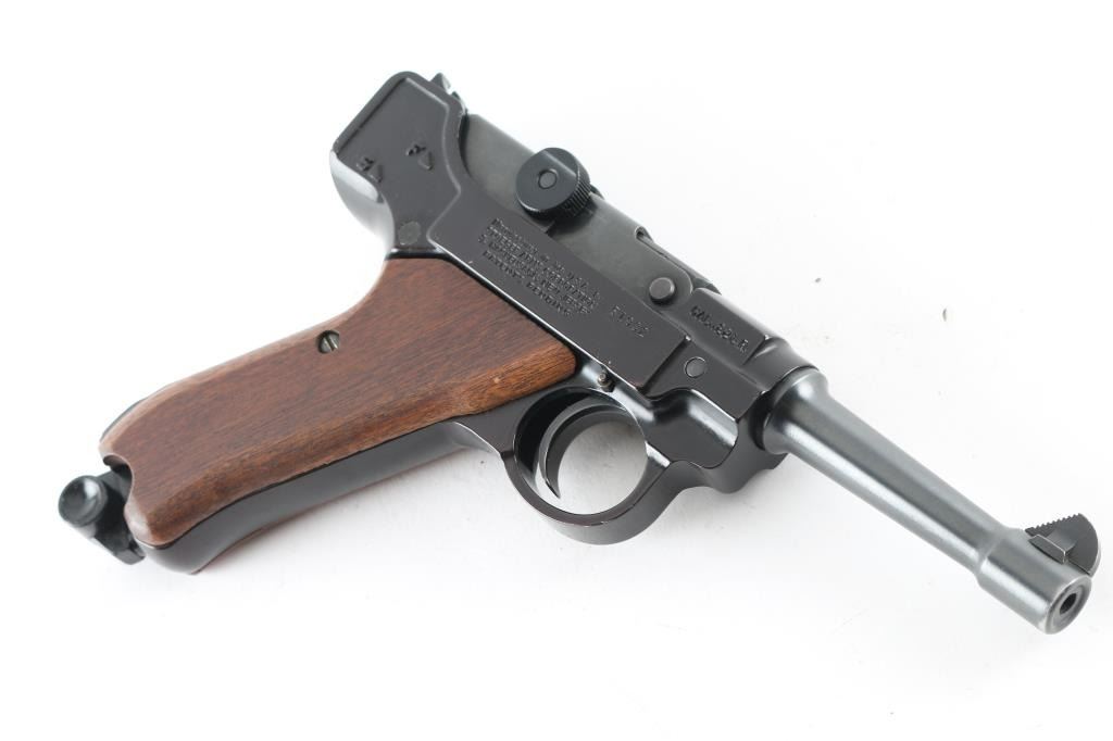 ***SOLD FOR PARTS OR REPAIR ONLY *** Toggle action semi-automatic rimfire pistol modeled after the iconic DWM Parabellum-Pistole, manufactured in S. Hackensack, NJ circa 1969-1980. Features a blued 4.5" tapered barrel, dovetailed blade front sight, fixed rear sight with square notch, smooth crescent trigger, manual safety on the left side of the frame, push button magazine release, 10 round magazine, black finished aluminum frame and checkered two-piece faux-wood synthetic grips. Pistol retains approximately 95% of its original finish showing edge losses & holster wear. Action is smooth, the bore is excellent and the wood grips are fine. *****WARNING***** Safety lever does not function correctly. Condition is NRA Poor (Safety Needs Repair) *** Modern Firearm ***