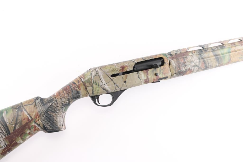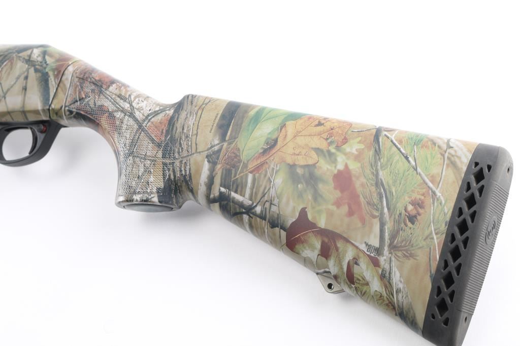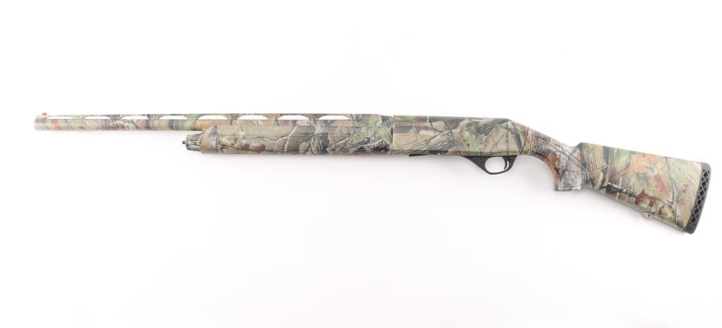 Turkish made Stoeger M3500 Realtree Max 7 12 Gauge 3-1/2in Semi Automatic Shotgun. Stoeger's Inertia Driven M3500 is chambered for 3-1/2in magnum shells, but also cycles 2-3/4 and 3in shells equally well without adjustment, 4+1 capacity, Realtree Max 7 camo finish. CYL choke installed, 26" vent ribbed barrel with red fiber optic sight, rubber recoil pad. LOP is 14 1/2". Bore is excellent/bright, action is smooth and the camo finish is excellent.