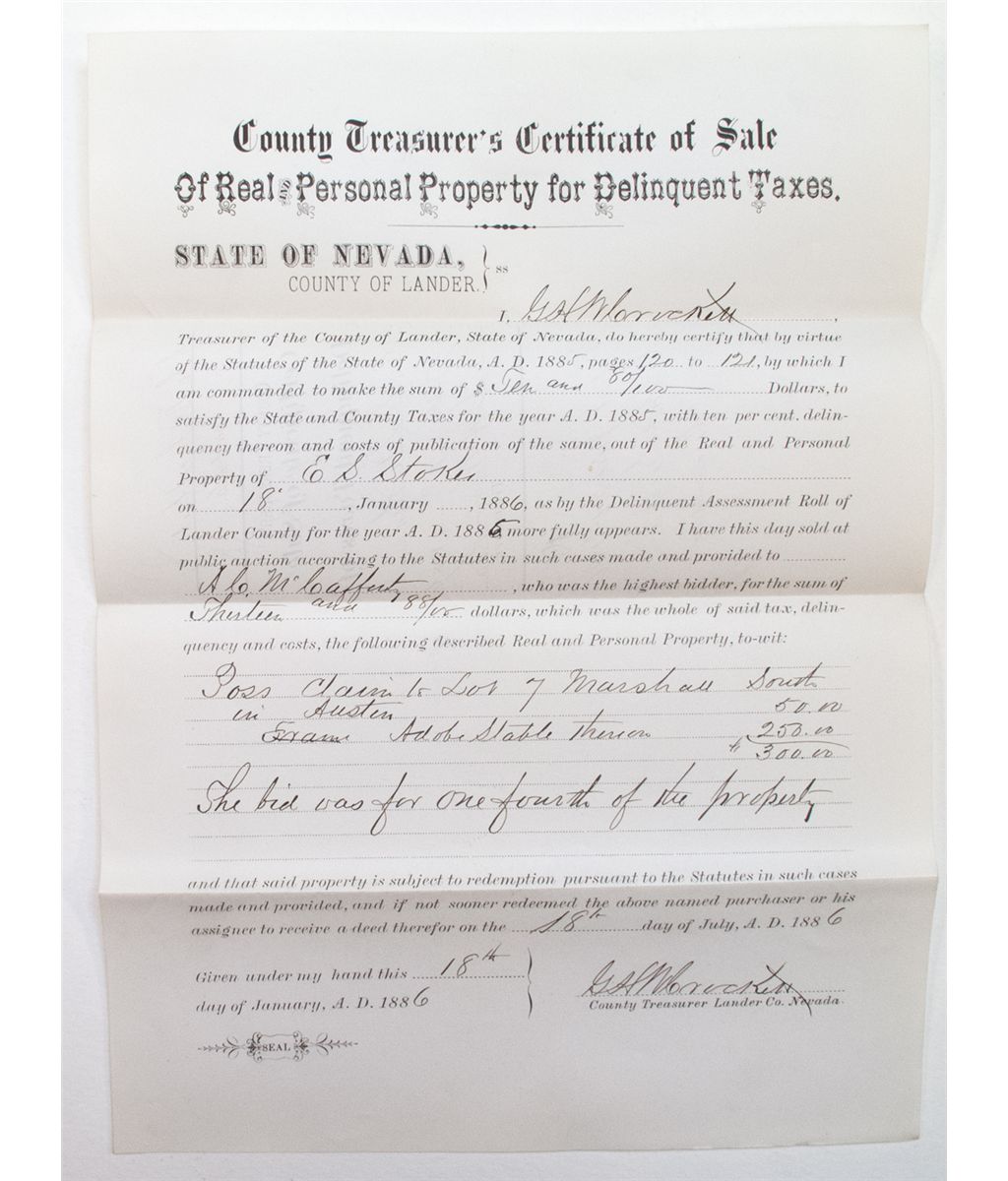 Stokes was involved with Nevada mining and was a partner with John Mackay in the United Lines Telegraph Company. Sale is for Lot 7 of Marshall South in Austin and an adobe stable thereon.City: AustinCounty: LanderState: NV