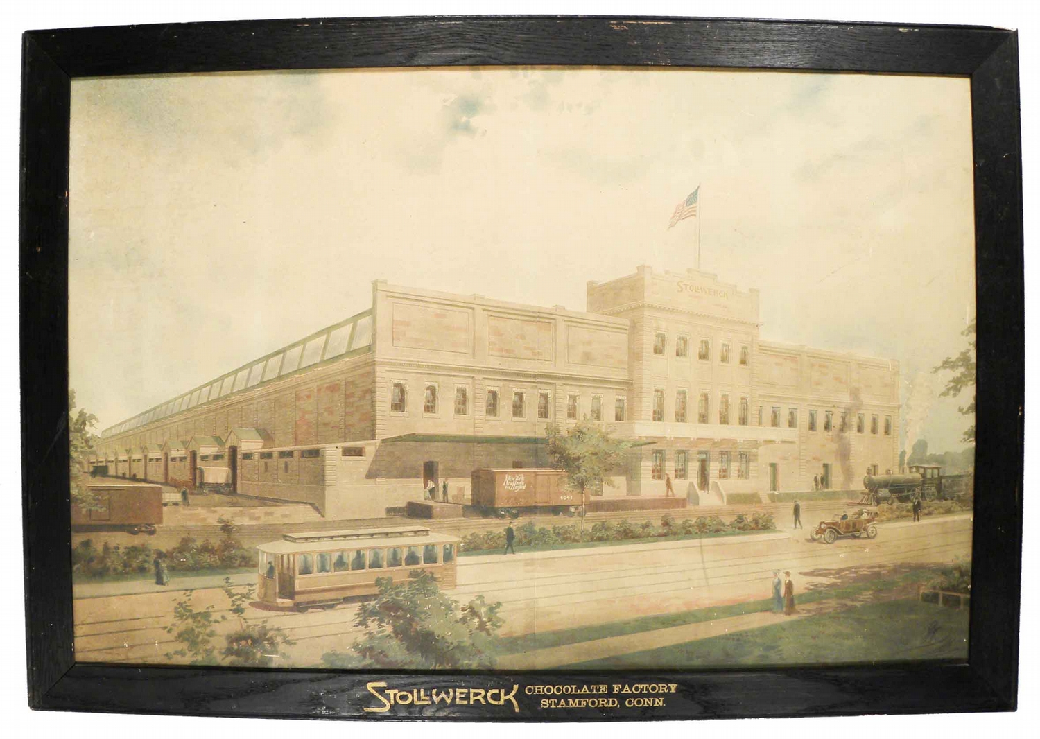 Stollwerck Chocolate Company Building Cardboard Sign in original frame. Depicting trolley train and automobile in the fore ground. Stamford, CT. Faded with light staining otherwise good condition. 39 X 27 inches overall.
