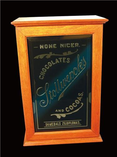 Stollwercks Chocolates and Cocoas Wood Cabinet with reverse glass beveled front. Excellent condition. 15 X 23 X 10 inches.