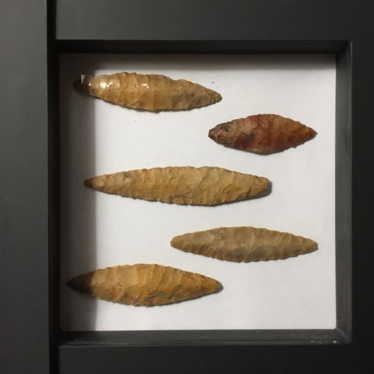 2500 - 1900 BC Stone Age arrowhead projectile points, group of 5. Volosovo culture, Neolithic culture characterized by large sites with extensive of mud-hut dwellings, distinctive types of flint tools & bone &stone figurines, living along the Oka River basin below Riazan & on the lower reaches of the Kliaz'ma River, modern day Russia. Each arrowhead artifact lentoid in section & leaf-shaped, with fine workmanship. Very fine condition. Provenance - property of a gentlemen, acquired in the 1950's. 1 1/2" - 2 3/4".