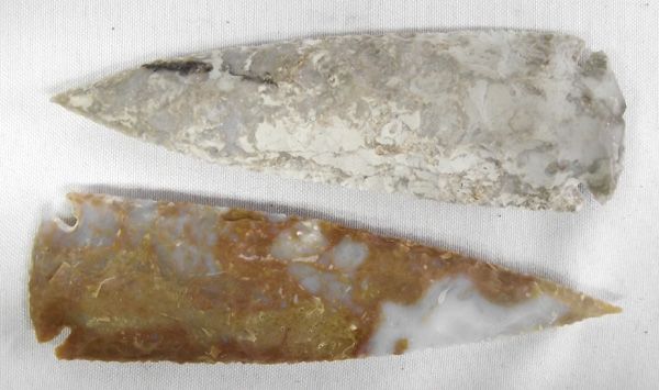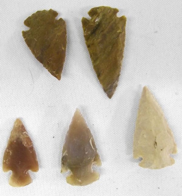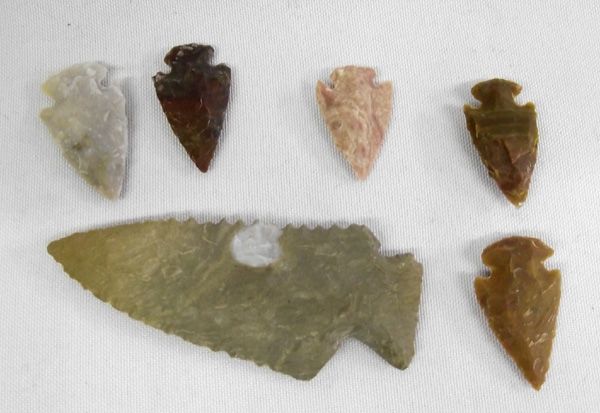 Stone Arrowheads and Spears. Collection of over 25 stone dovetail points, age and origin unknown. The largest spear is 5.5''L x 1.75''W. The largest arrowhead is an obsidian arrowhead that is 2''L x 1''W.