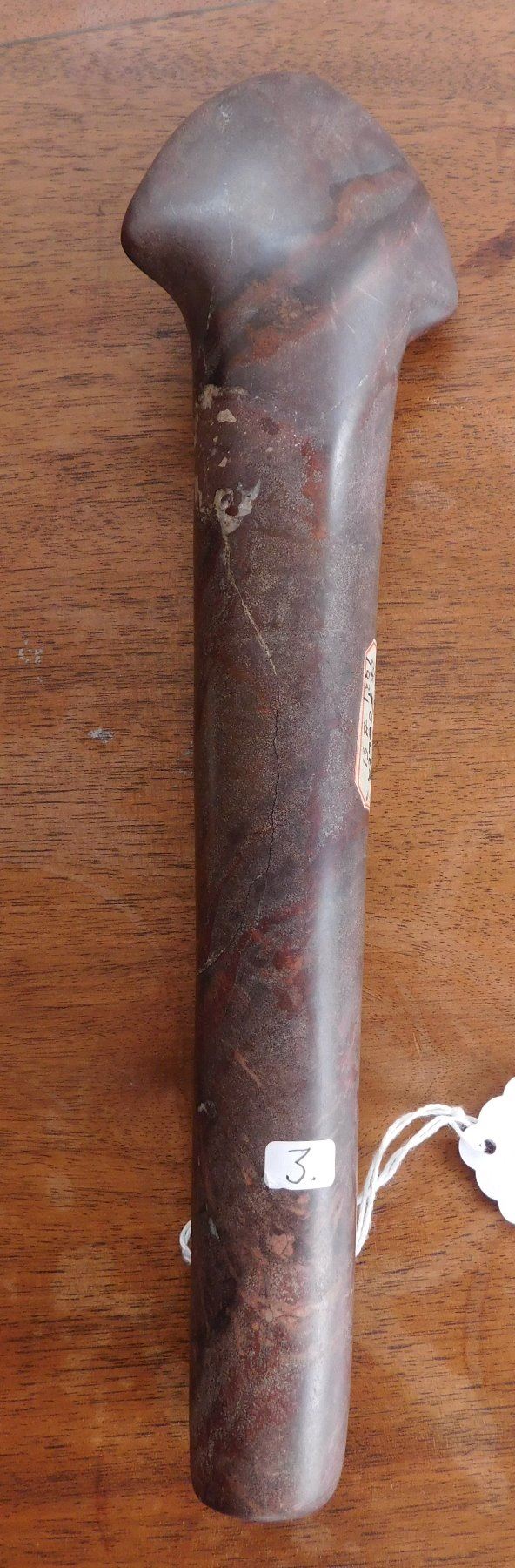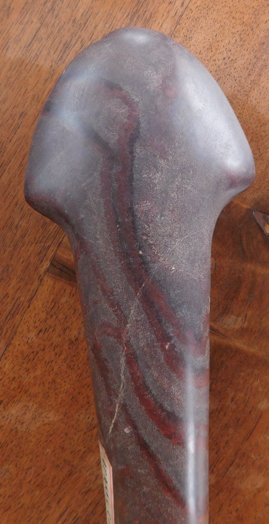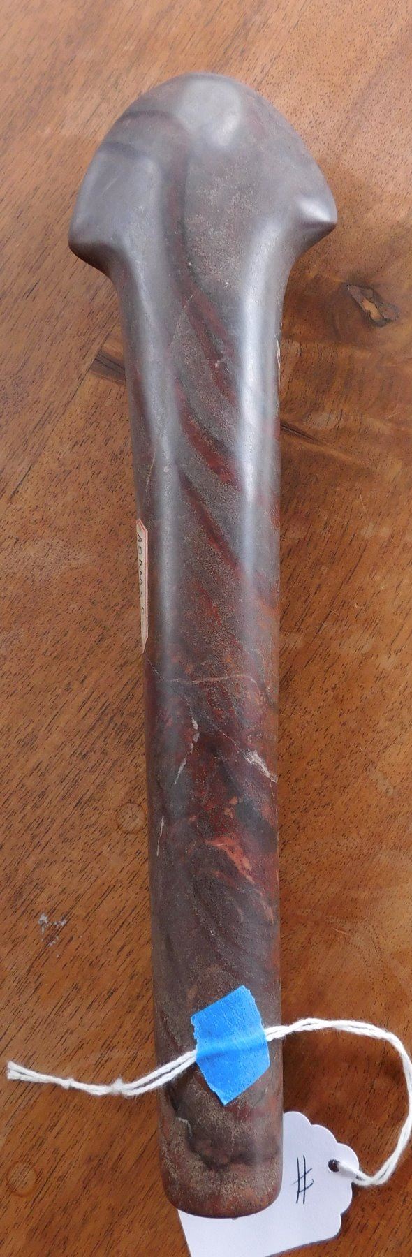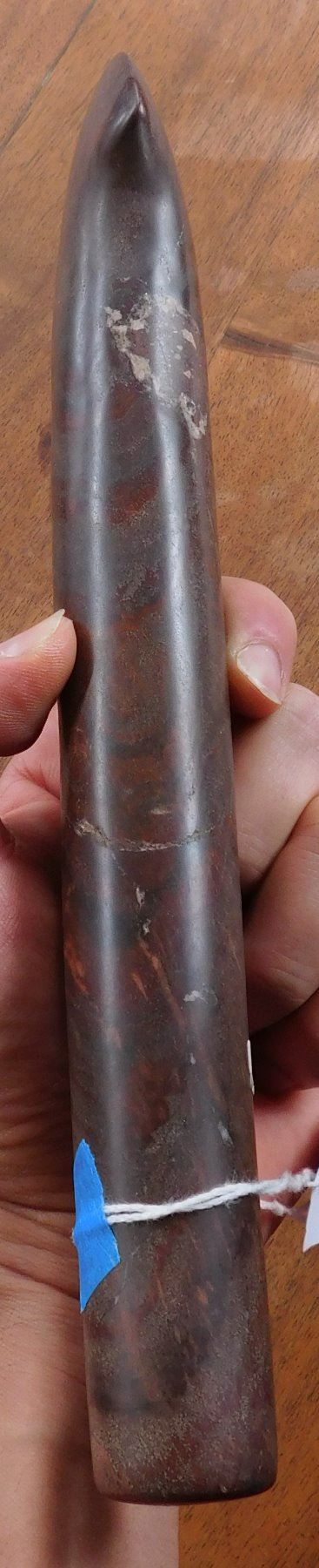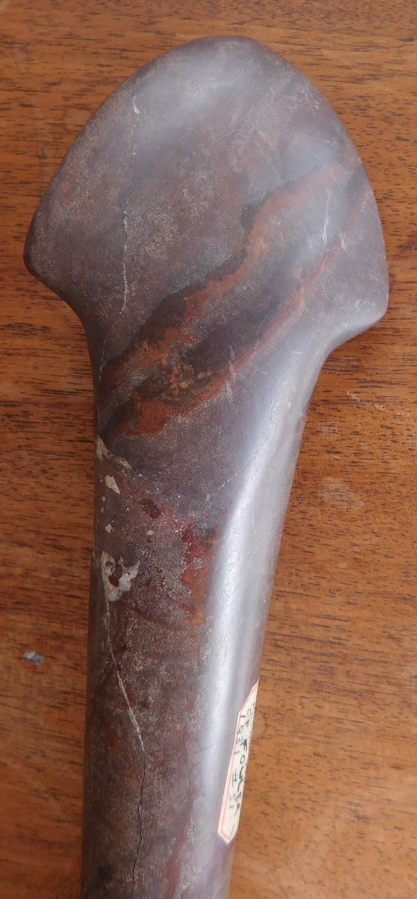 Stone Axe or Spud, pre-historic item. Made of red jasper, the item measures 10 1/8" x 2 3/4" x 1 1/2". Adams County, Illinois. From an old, 1960s California collection. Condition: Minor bit damage, see images. Shipping: $25.50 w/insurance and signature, due to value.