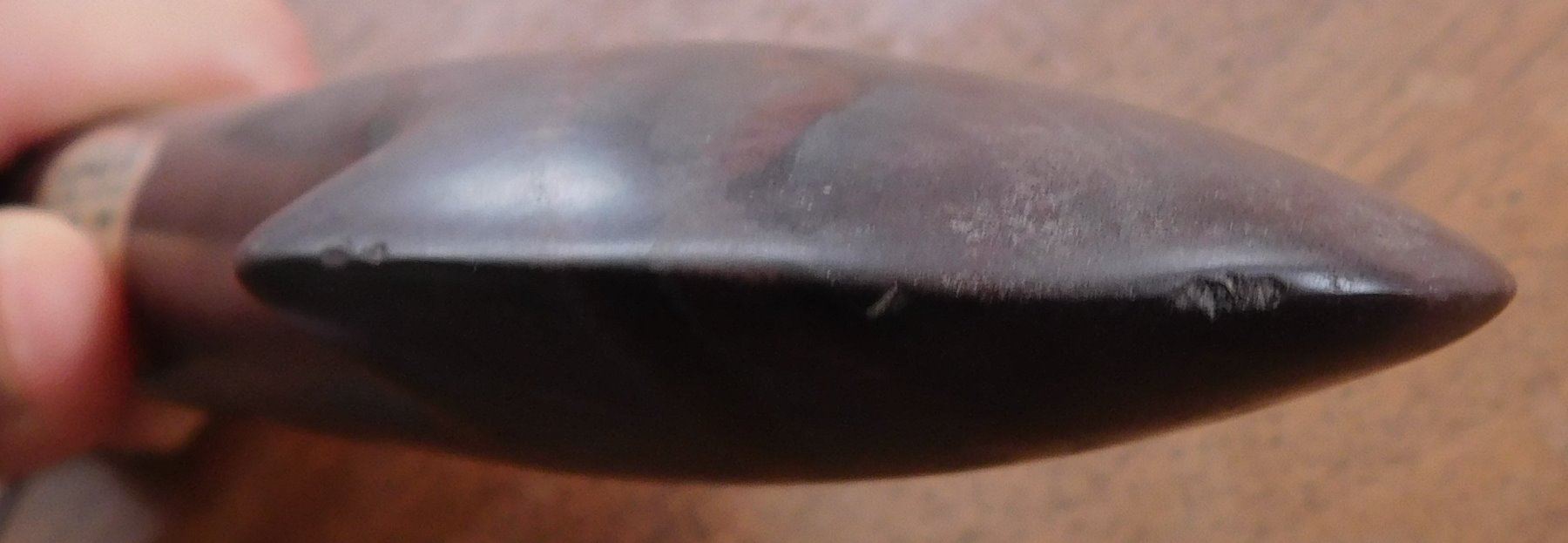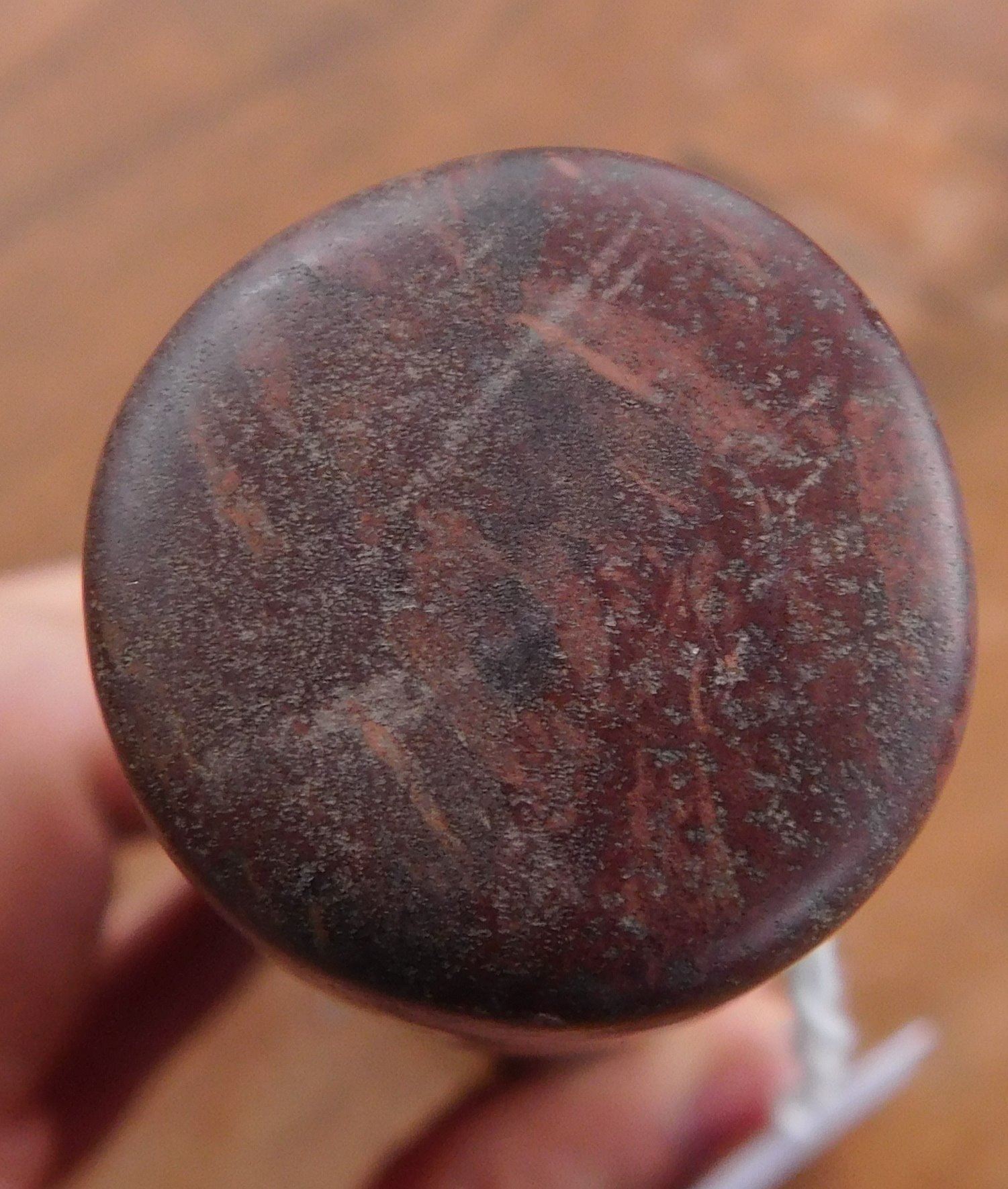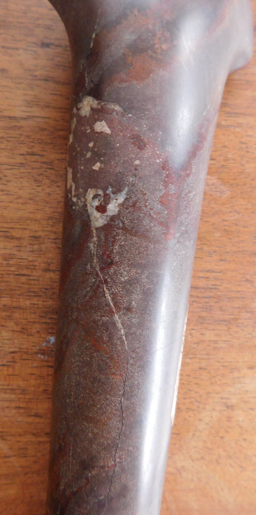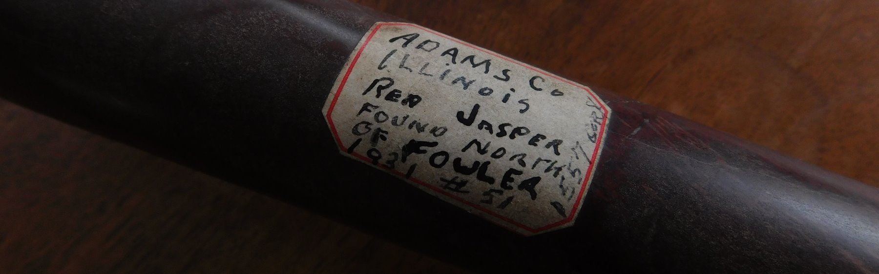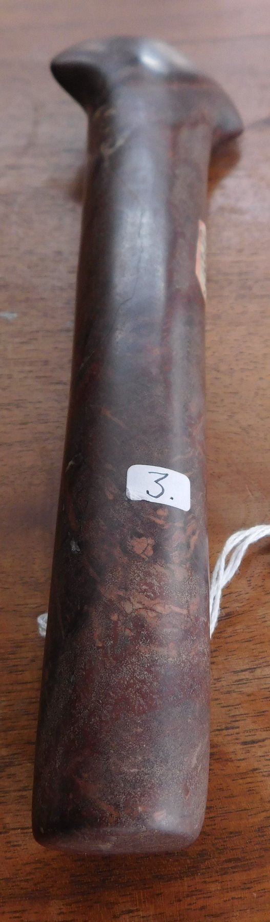 Stone Axe or Spud, pre-historic item. Made of red jasper, the item measures 10 1/8" x 2 3/4" x 1 1/2". Adams County, Illinois. From an old, 1960s California collection. Condition: Minor bit damage, see images. Shipping: $25.50 w/insurance and signature, due to value.