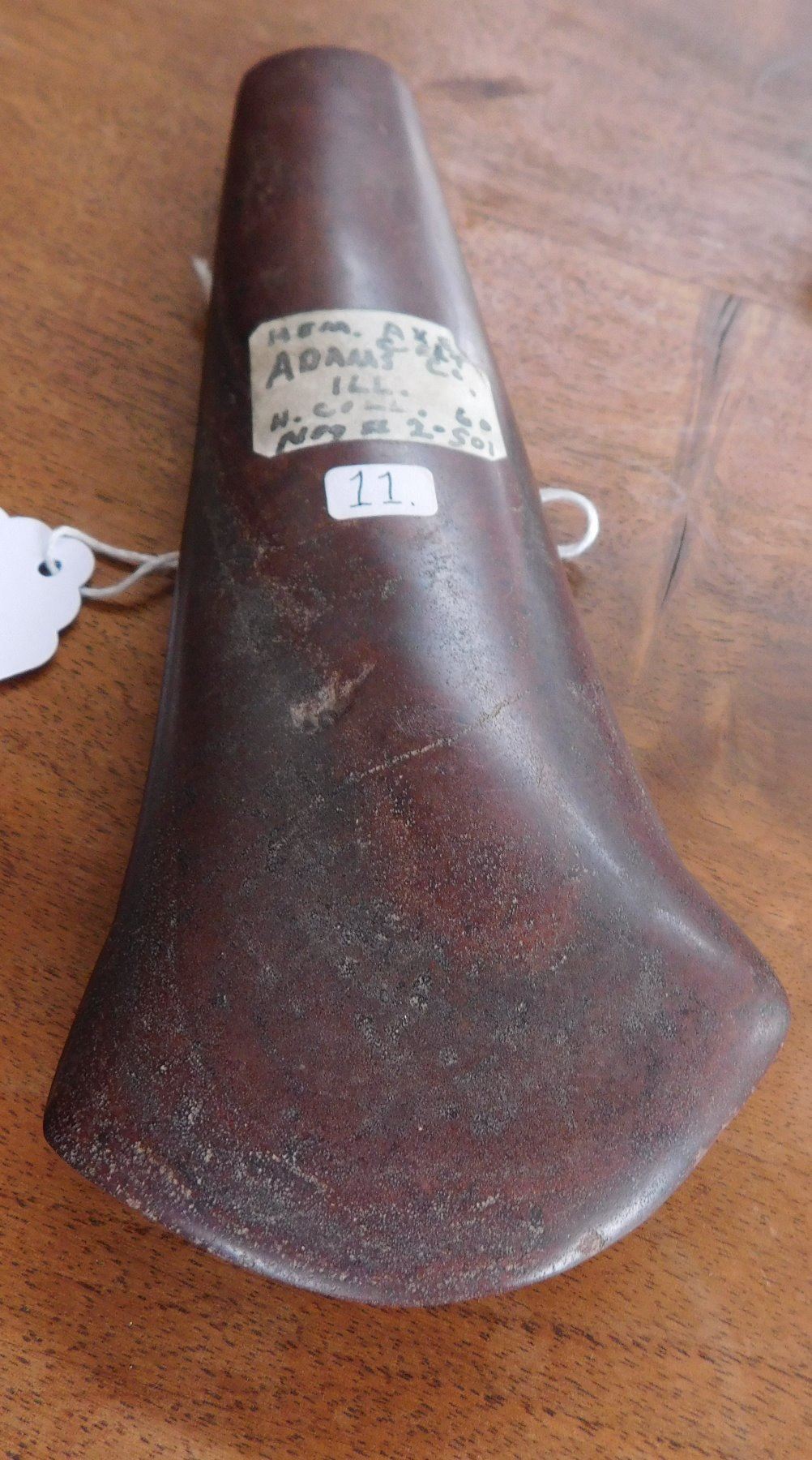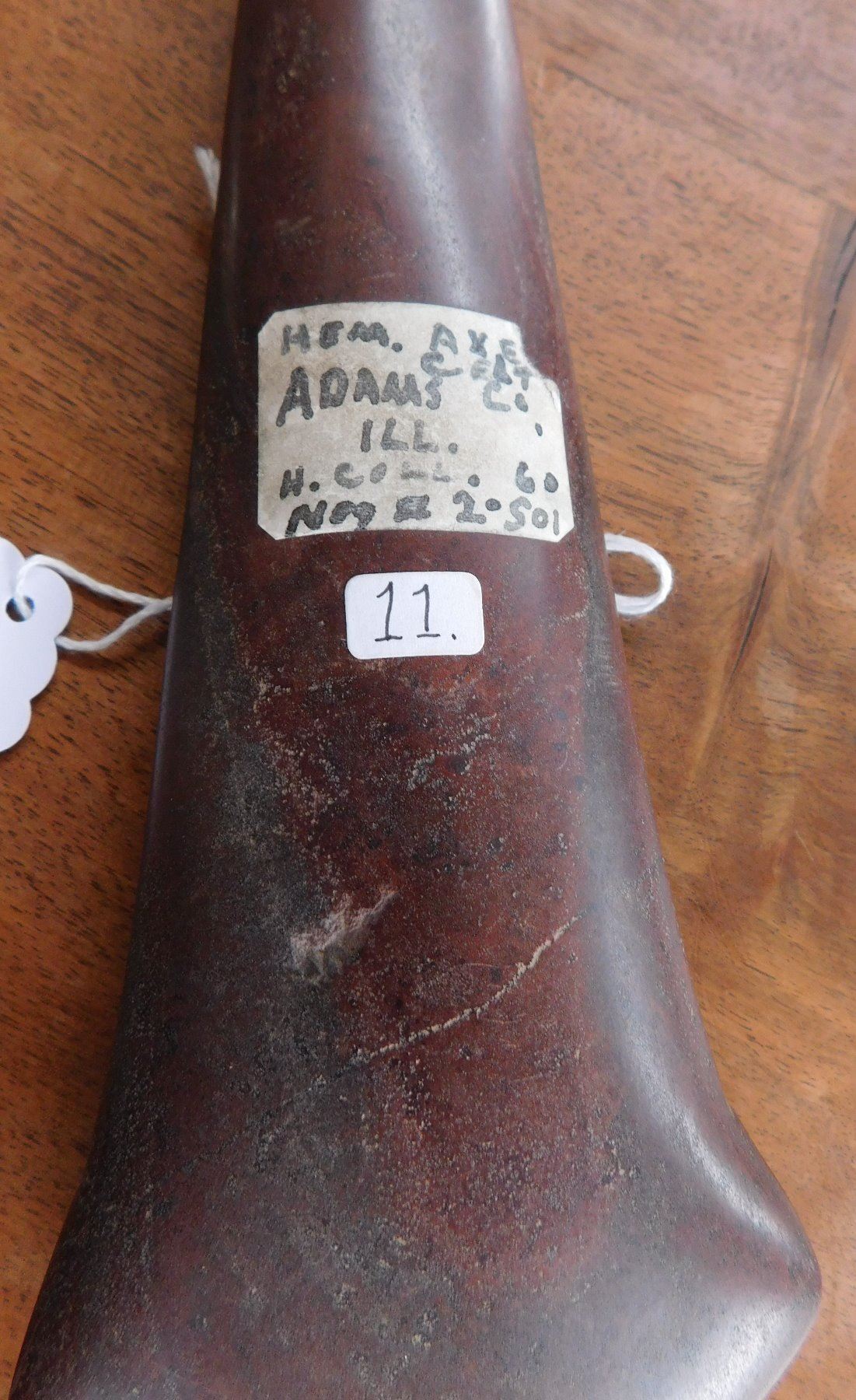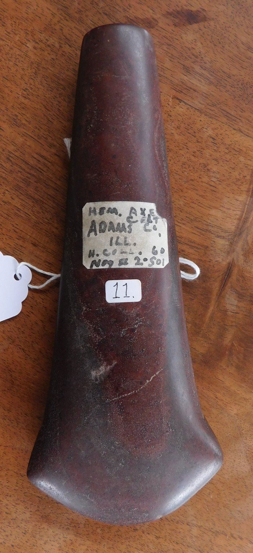 Stone Axe, pre-historic item. Made of stone, possibly hematite or jasper, the item measures 7 1/2" x 2 7/8" x 3/4". Adams County, Illinois. Celt, spud or axe. From an old, 1960s California collection. Condition: Great, see images. Shipping: $23.50 w/insurance and signature, due to value.
