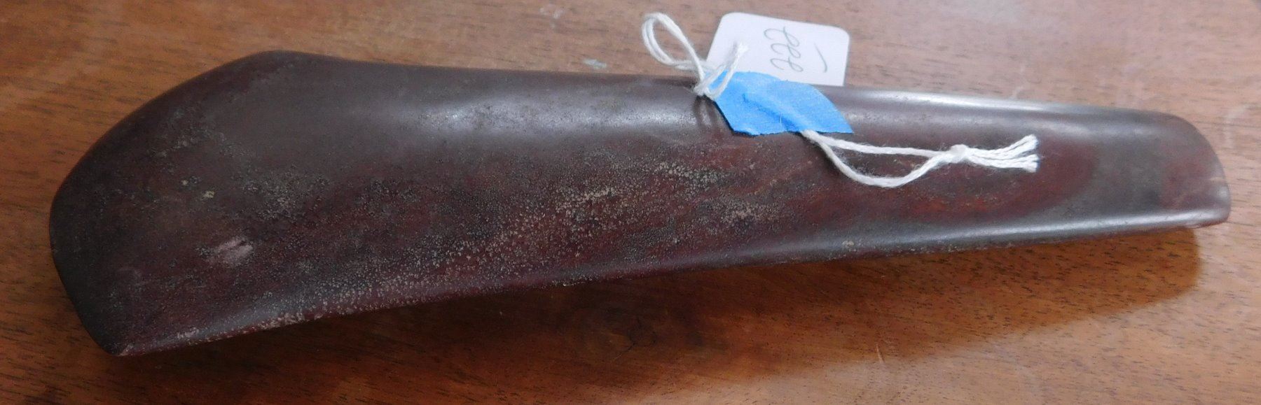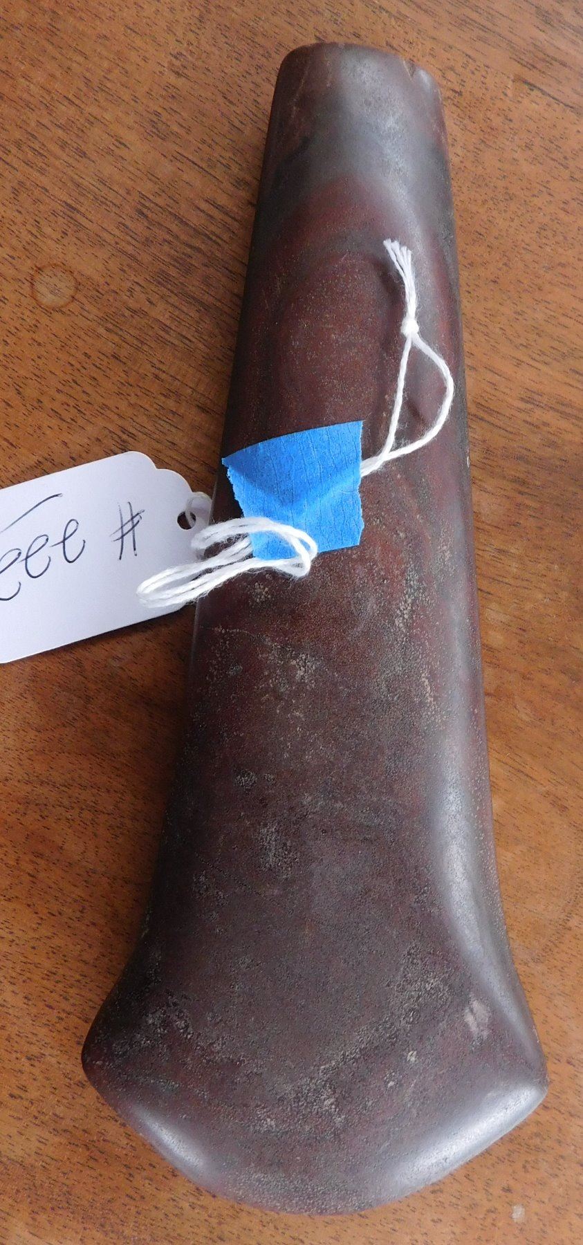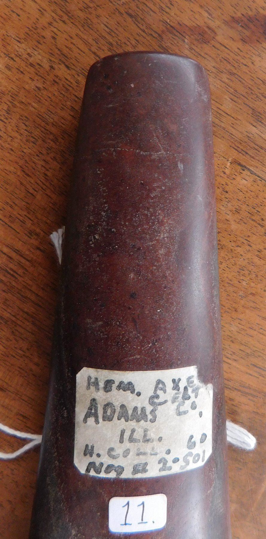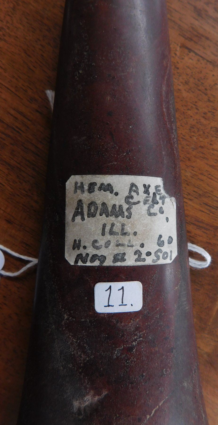 Stone Axe, pre-historic item. Made of stone, possibly hematite or jasper, the item measures 7 1/2" x 2 7/8" x 3/4". Adams County, Illinois. Celt, spud or axe. From an old, 1960s California collection. Condition: Great, see images. Shipping: $23.50 w/insurance and signature, due to value.
