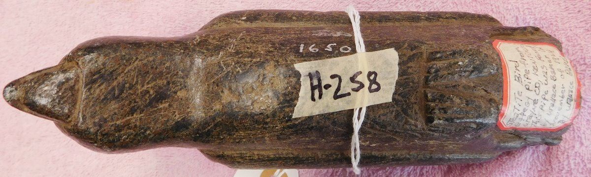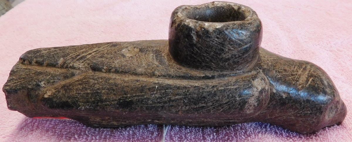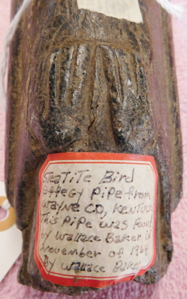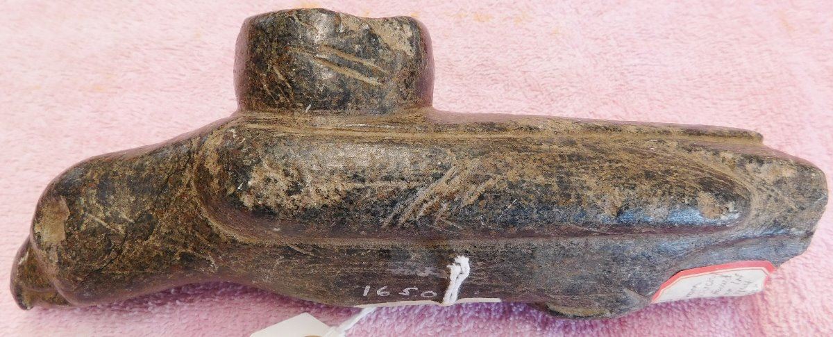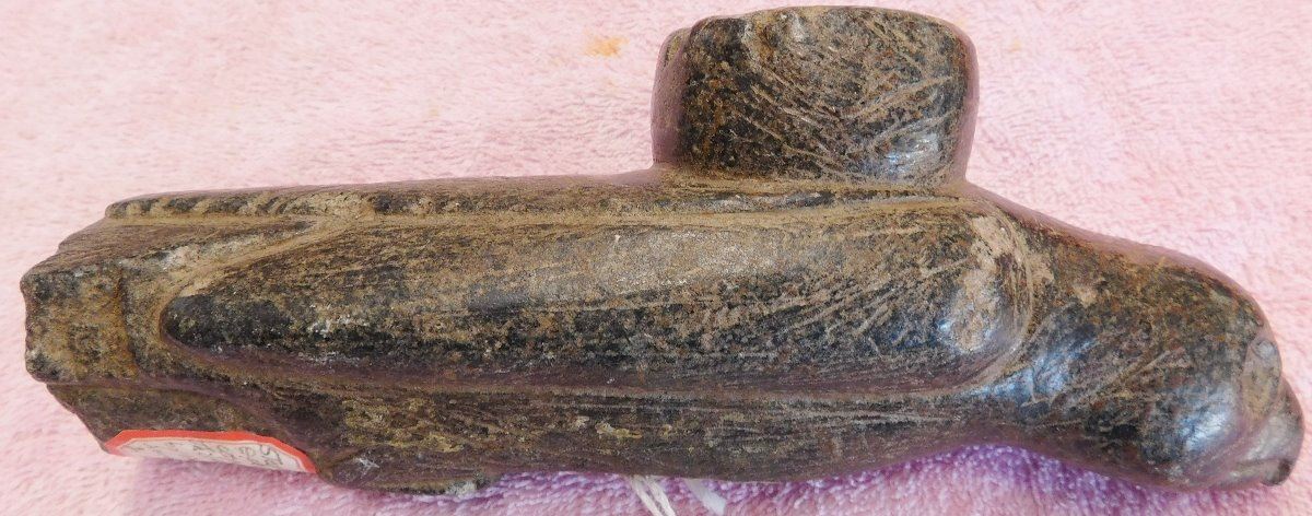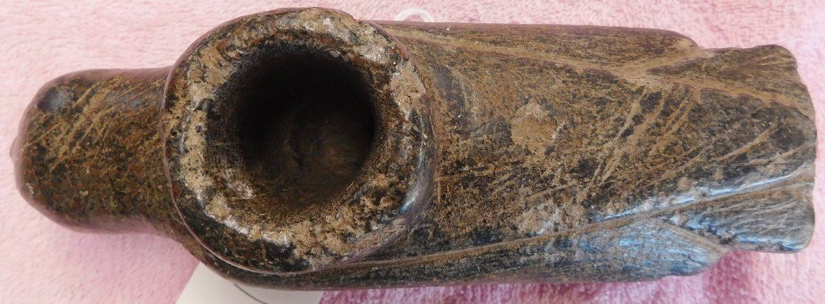 Stone Bird Effigy Pipe, pre-historic item. Made of steatite, item measures 8.5" x 3" x 3.5". Wayne County, Kentucky. Found by Wallace Baker. Fantastic carvign on this bird effigy pipe. Wide bowl and stem opening for large smoking assemblies. Condition: As found, minor nicks and scuffs, see images. Shipping: $24.50, USA estimate only, requires insurance w/signature and double-boxed.