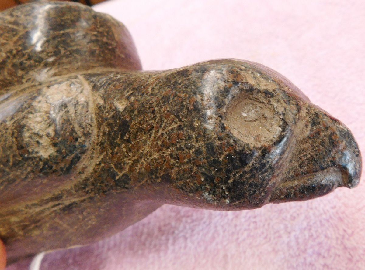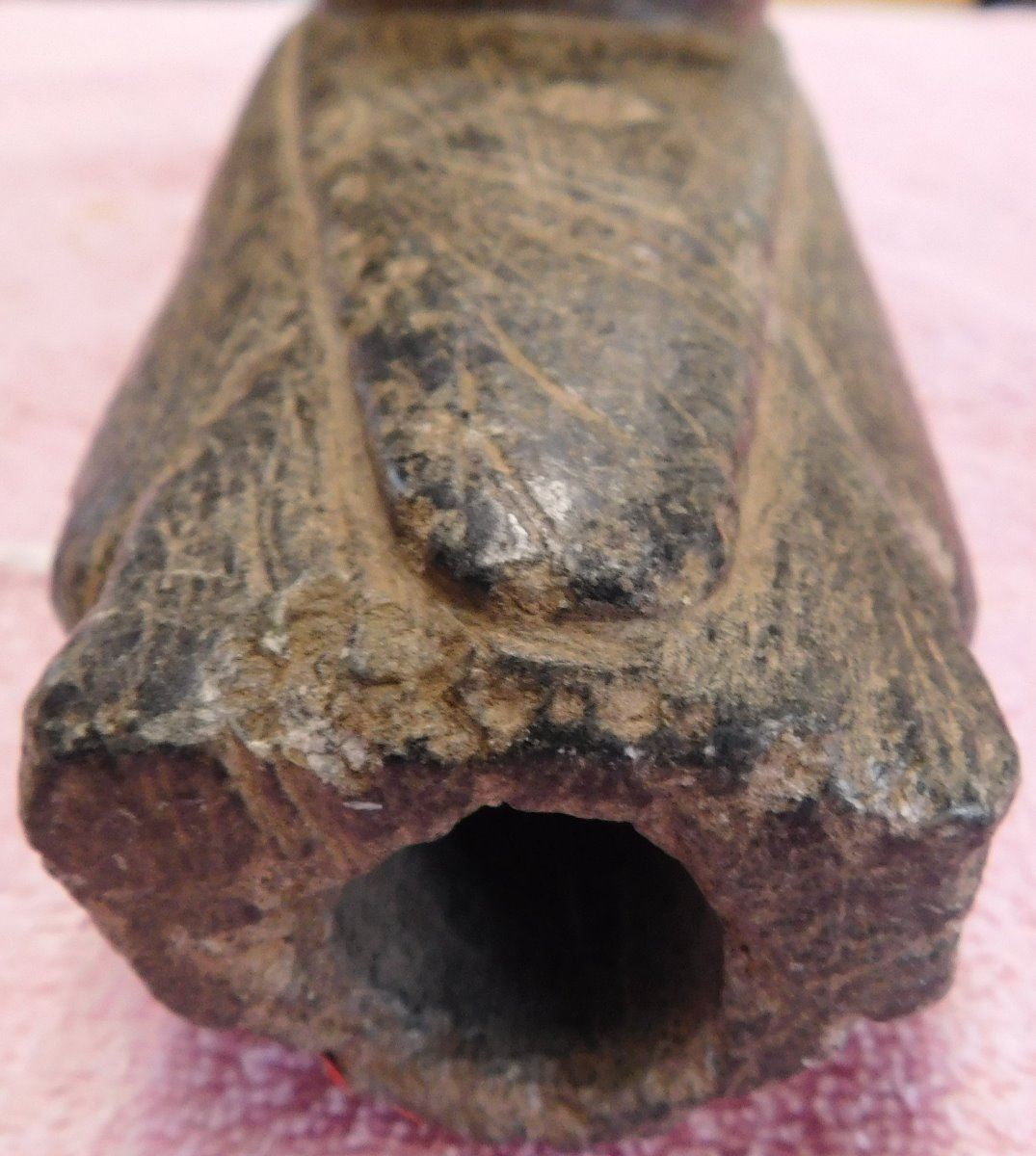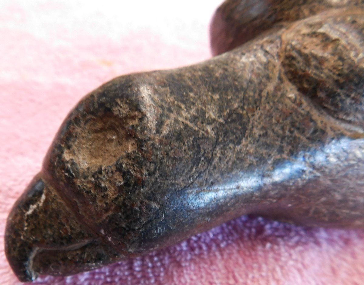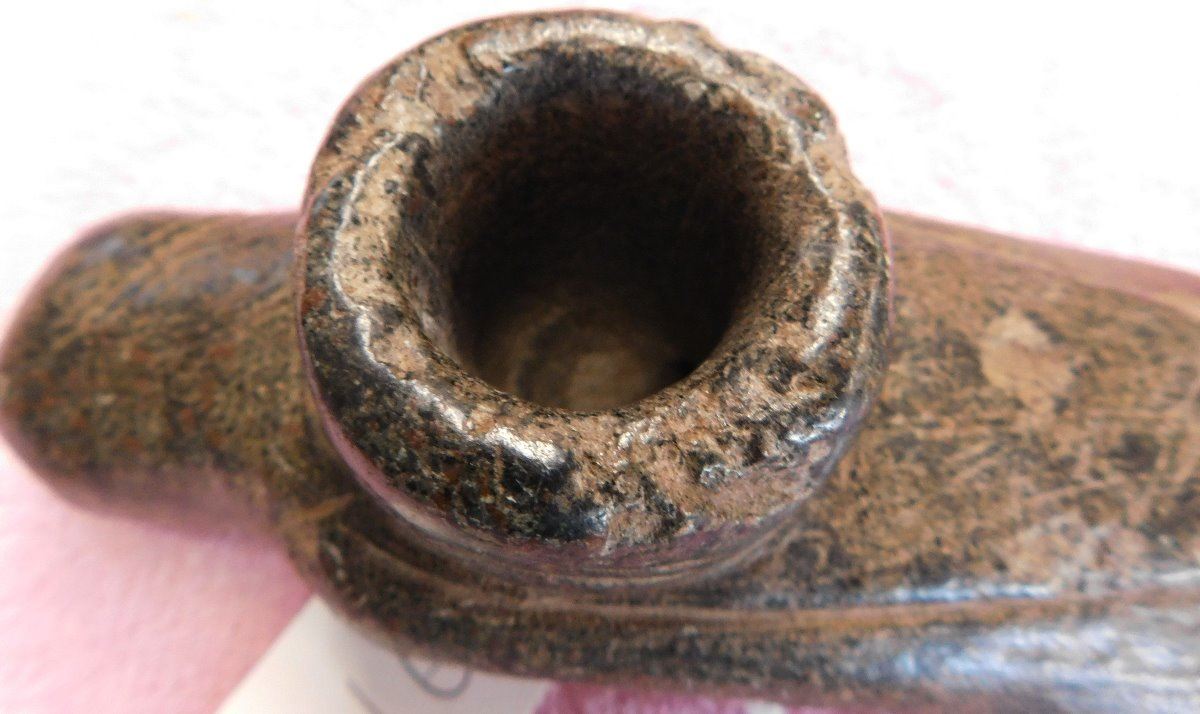 Stone Bird Effigy Pipe, pre-historic item. Made of steatite, item measures 8.5" x 3" x 3.5". Wayne County, Kentucky. Found by Wallace Baker. Fantastic carvign on this bird effigy pipe. Wide bowl and stem opening for large smoking assemblies. Condition: As found, minor nicks and scuffs, see images. Shipping: $24.50, USA estimate only, requires insurance w/signature and double-boxed.