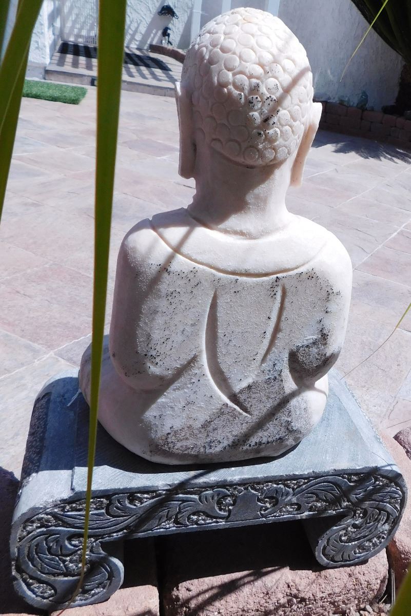 Stone Buddha on Stand, circa 1920s. Made of marble and measuring 22" x 16" x 8" with stand. From China. Nice carving with separate stand for display. Condition: Good, see images. Shipping: $125.00 USA estimate only, shipped in crate with insurance and signature.