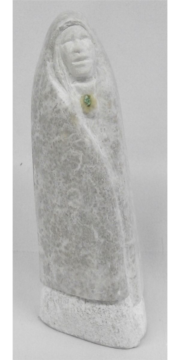 Stone Carving, Indian Figure With Blanket. Stylized Indian figure with blanket wrapped around grasping little chips of turquoise. It is signed, but difficult to decipher. Measures 6 1/2''.