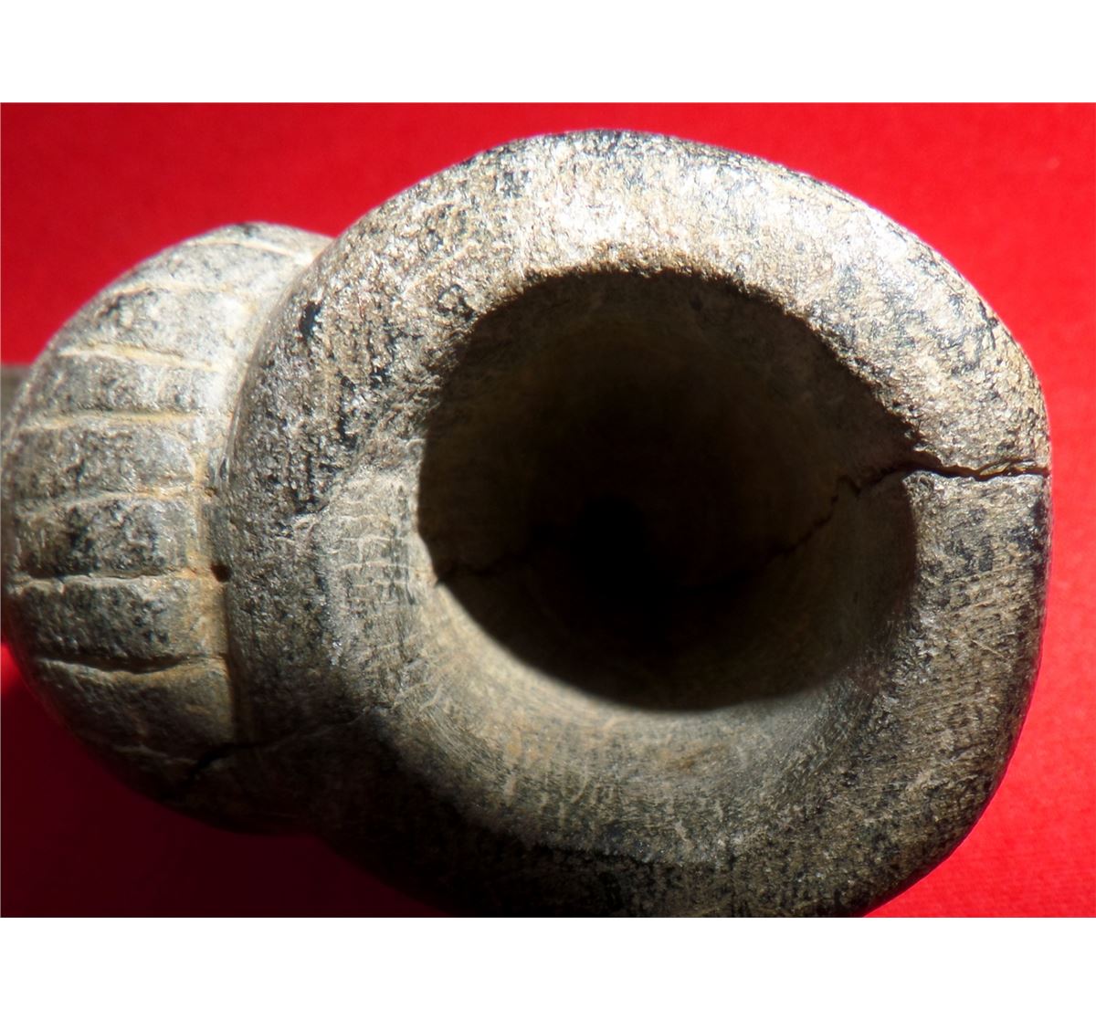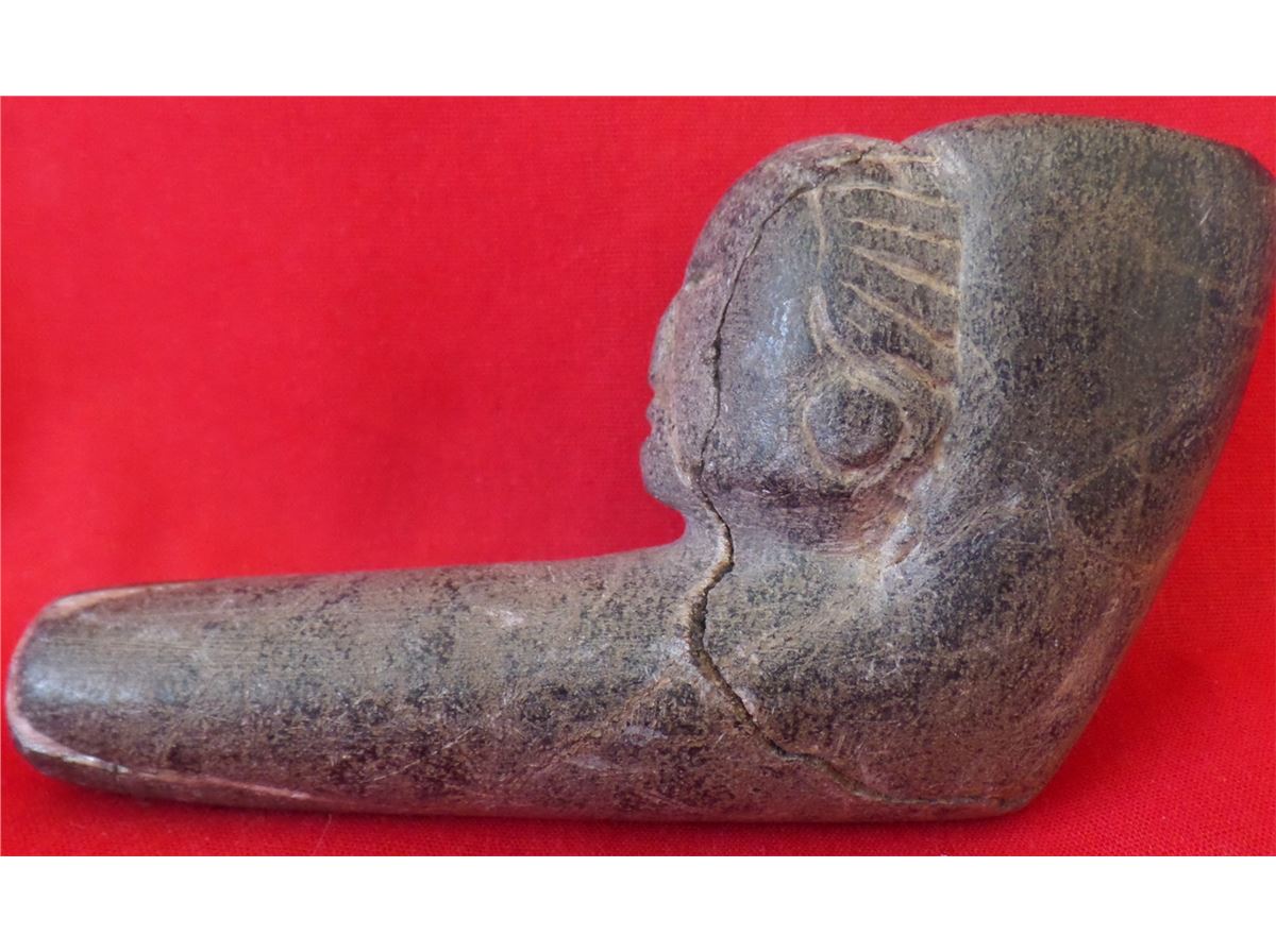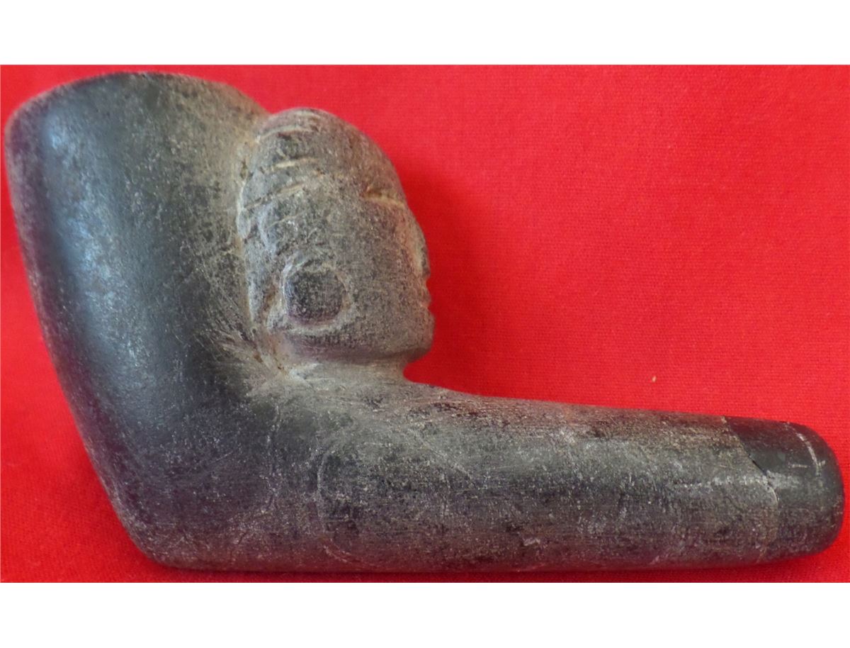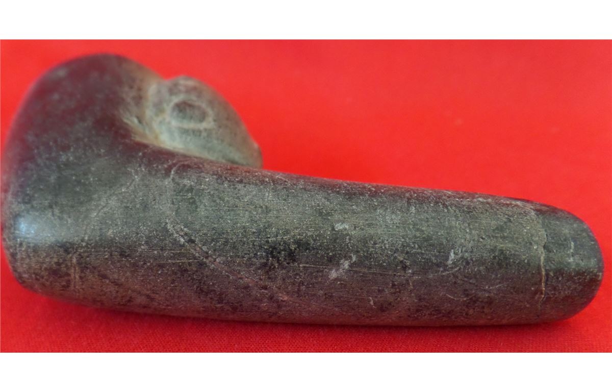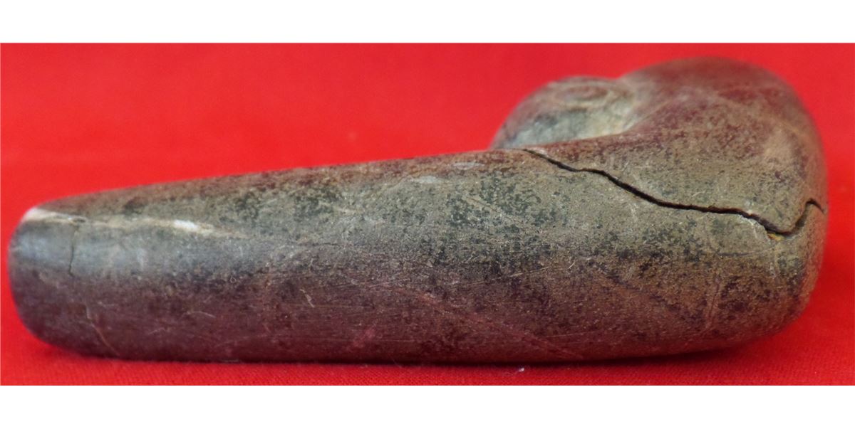 Early prehistoric steatite stone effigy pipe. This pipe measures about 4 x 2 x 1 1/4 inches and is from Chippewa, Minnesota. It is cracked. See photos. Shipping $18.00