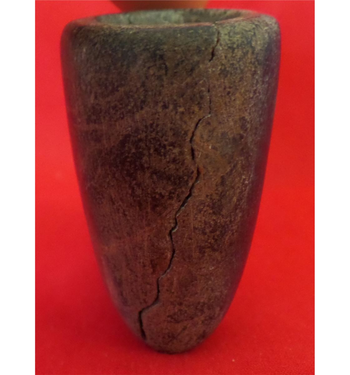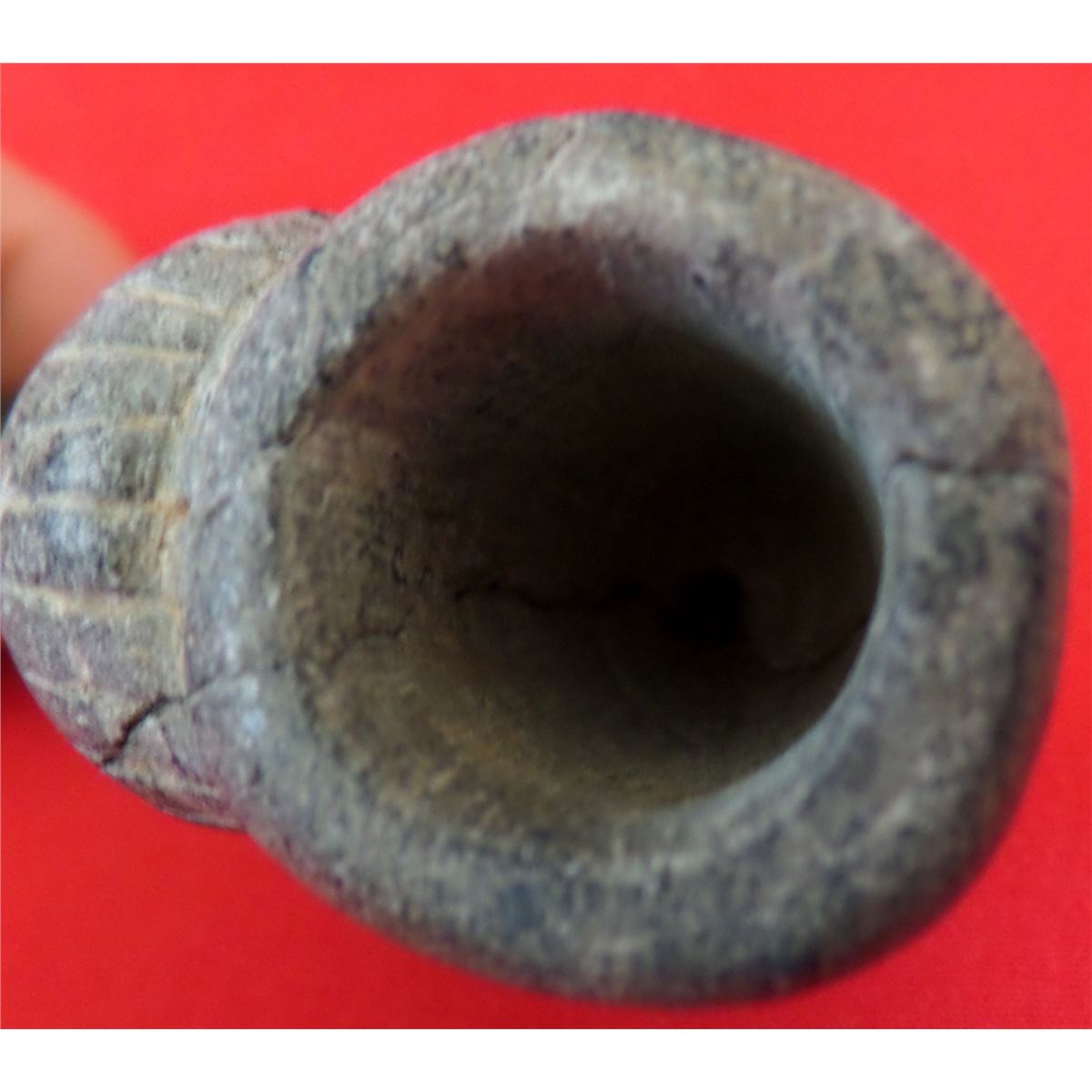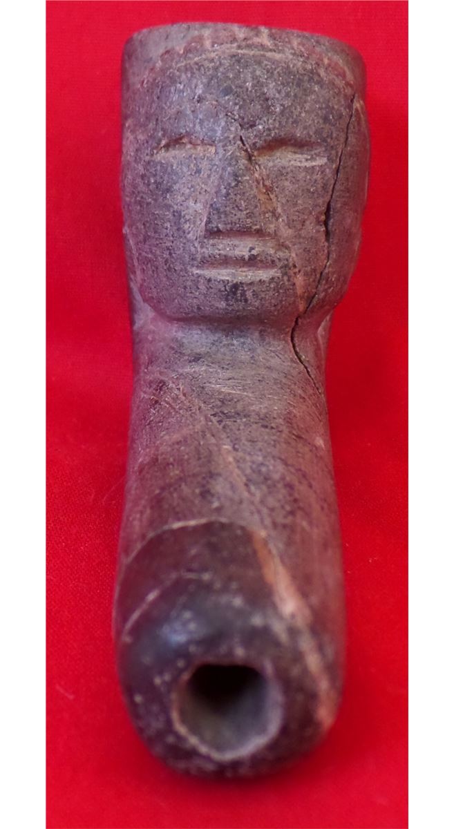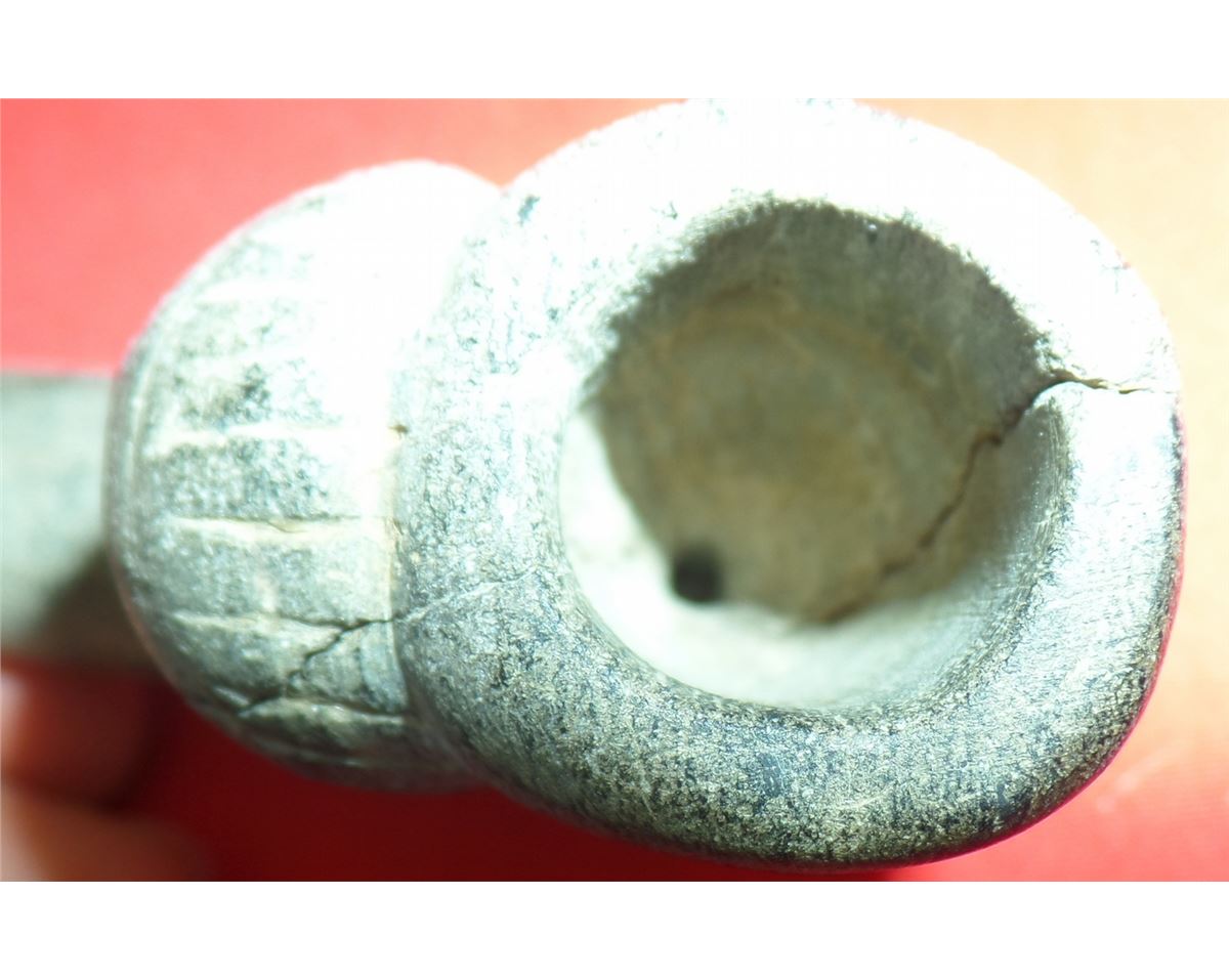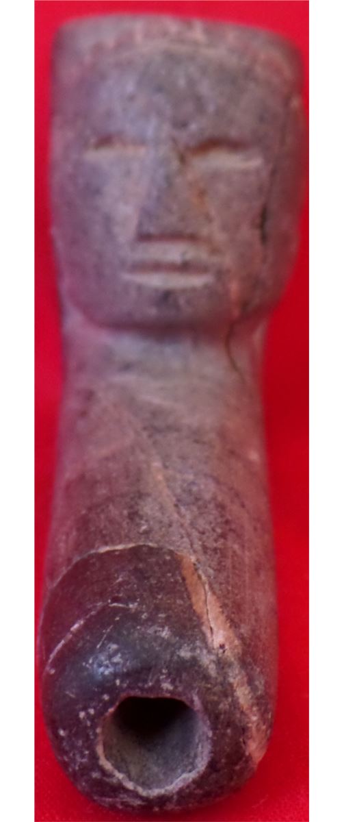 Early prehistoric steatite stone effigy pipe. This pipe measures about 4 x 2 x 1 1/4 inches and is from Chippewa, Minnesota. It is cracked. See photos. Shipping $18.00