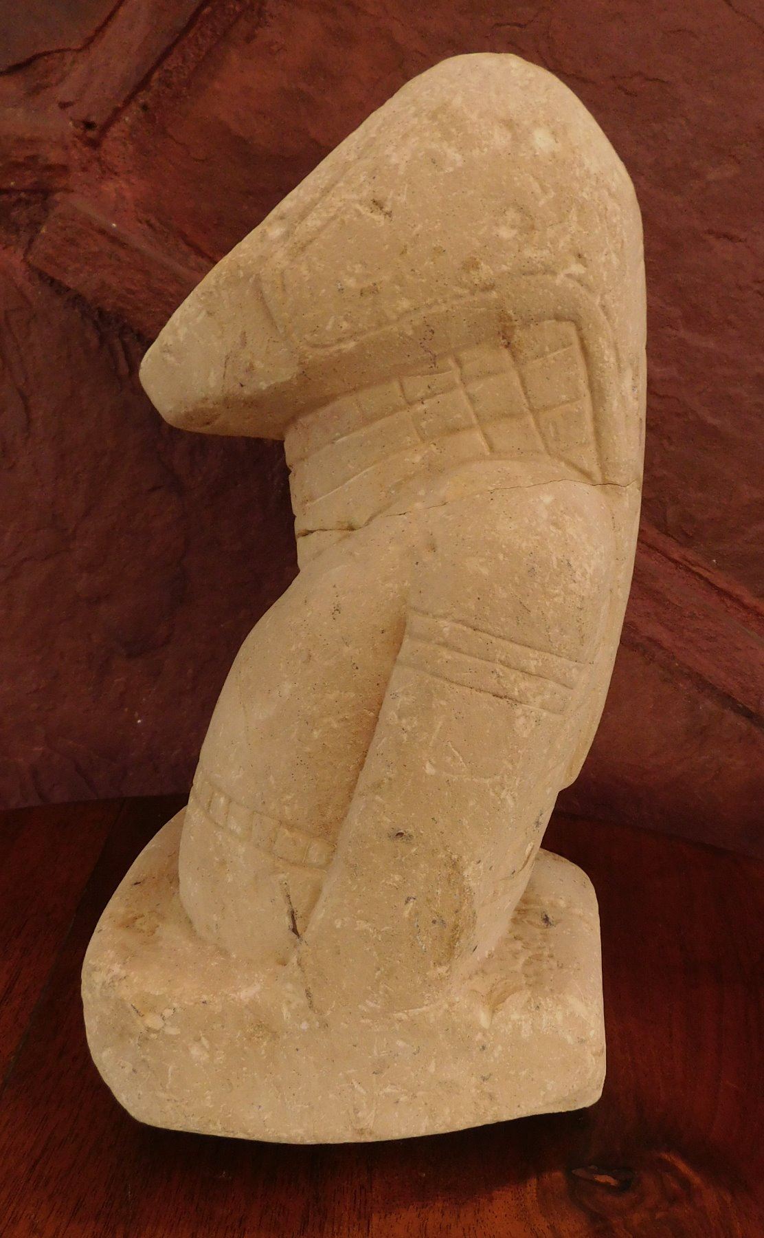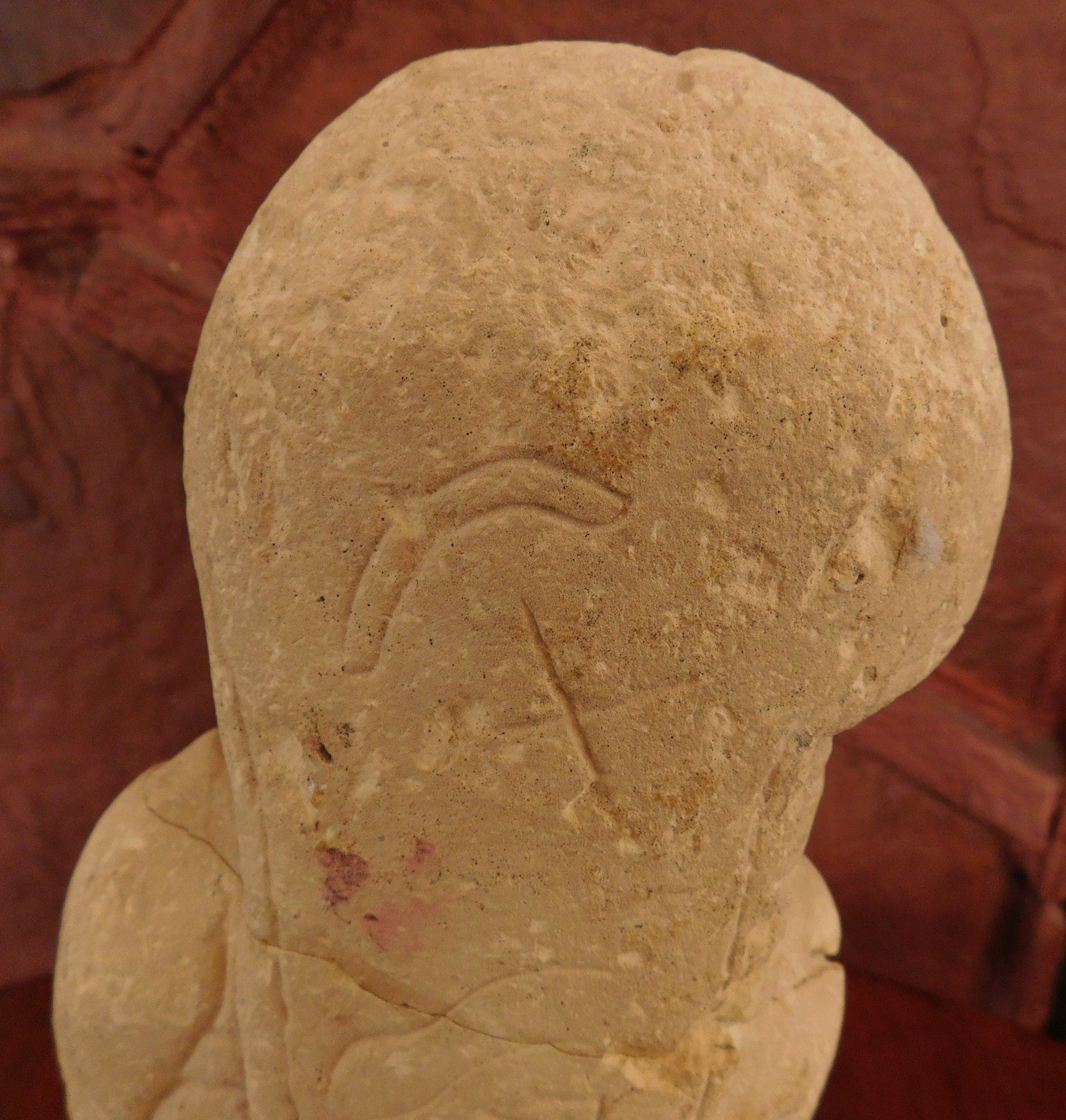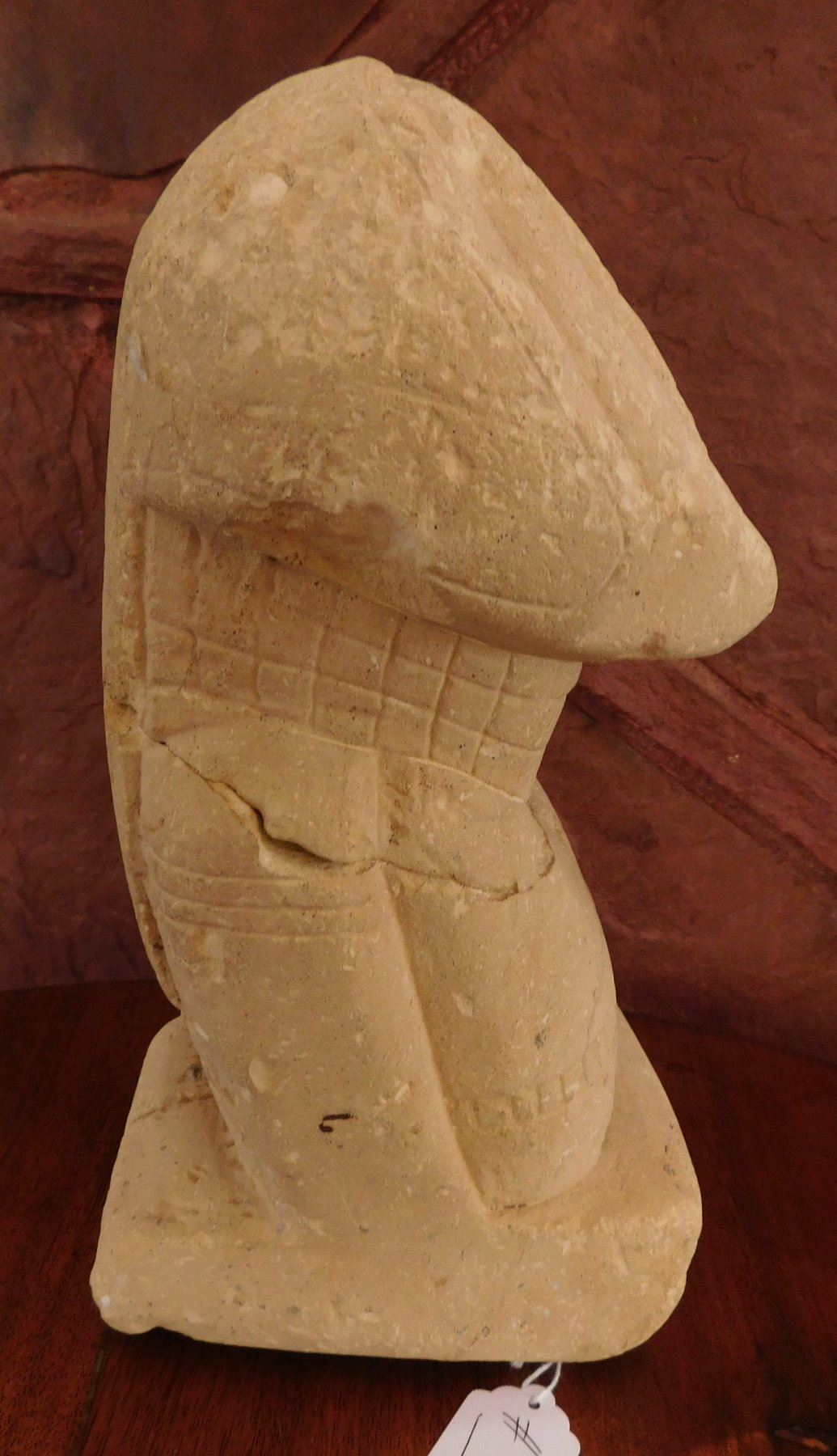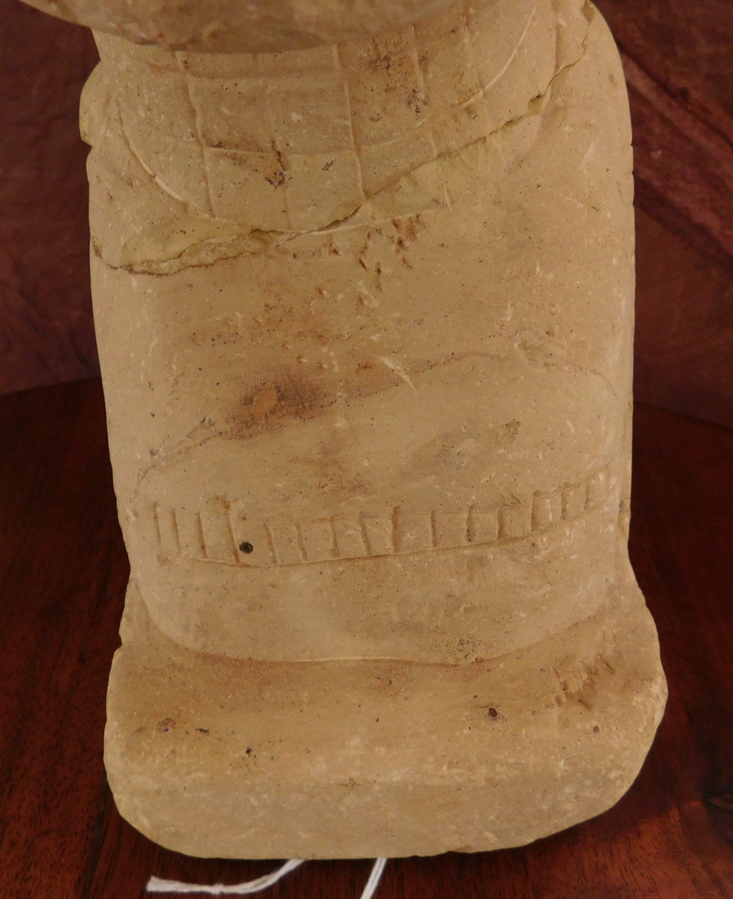 Stone Effigy Seated Figure, pre-historic item. Made of sandstone, the item measures 4 1/2" x 5 1/2" x 10 1/2". Ohio. Mississippian culture. From an old, 1960s California collection. Condition: Broken and reattached, see images. Shipping: $45.00 w/insurance and signature, due to size and value.