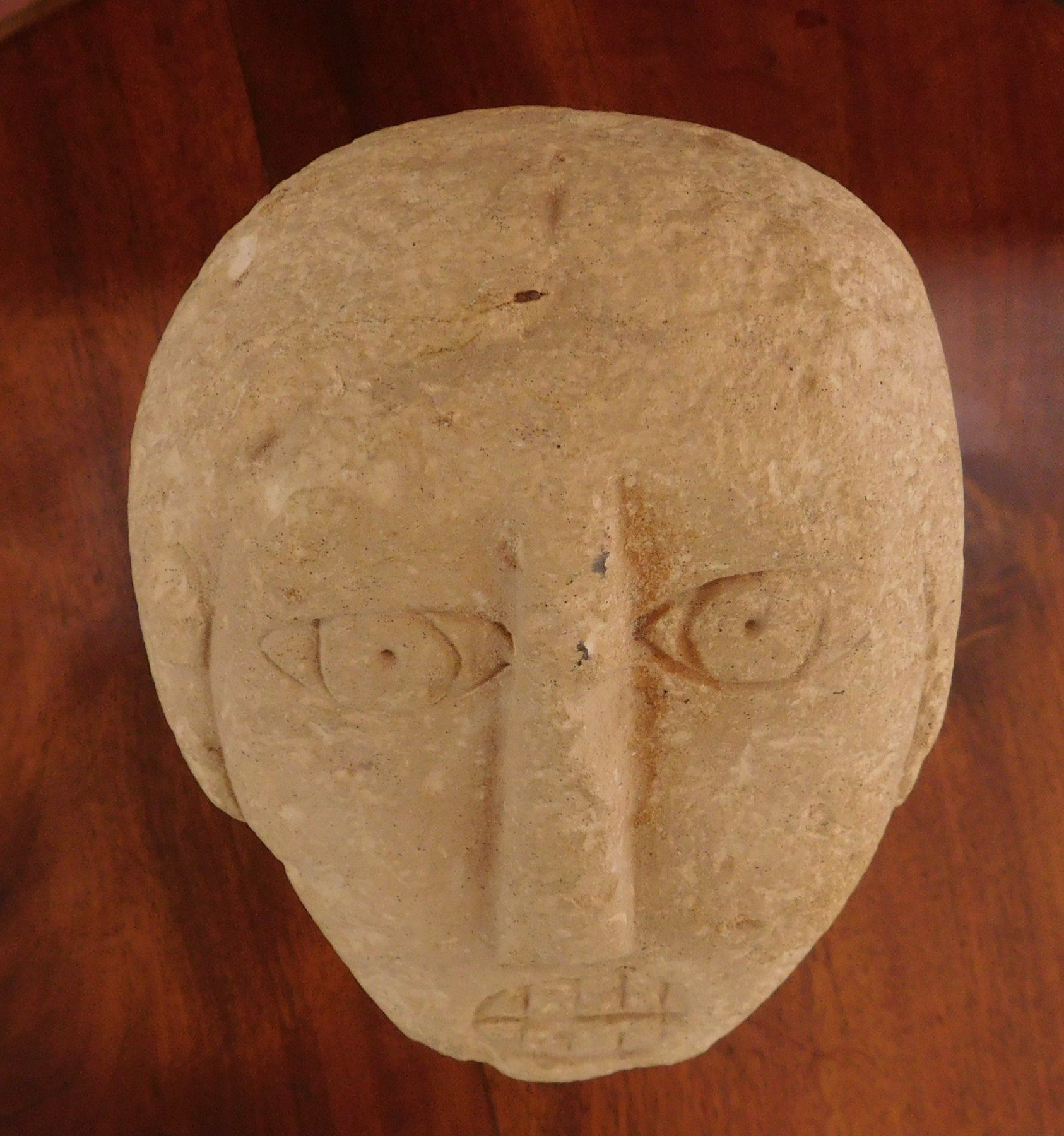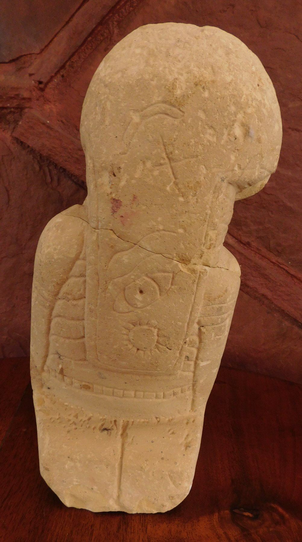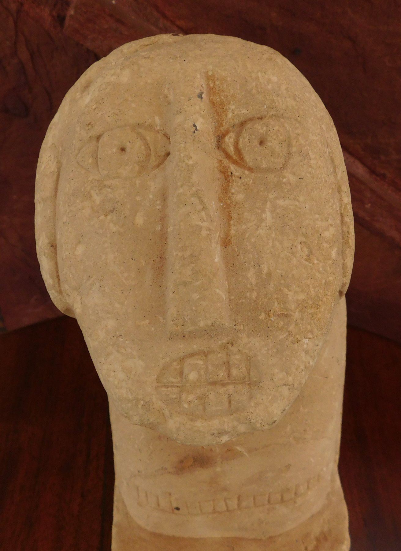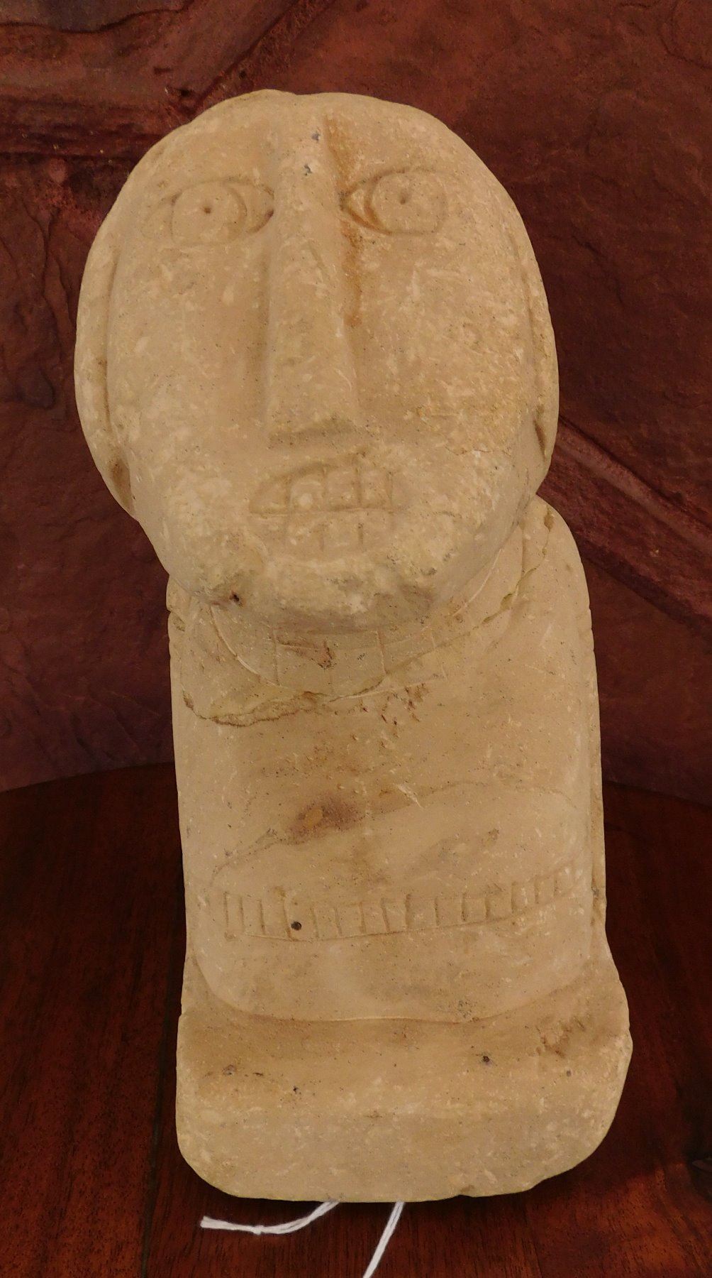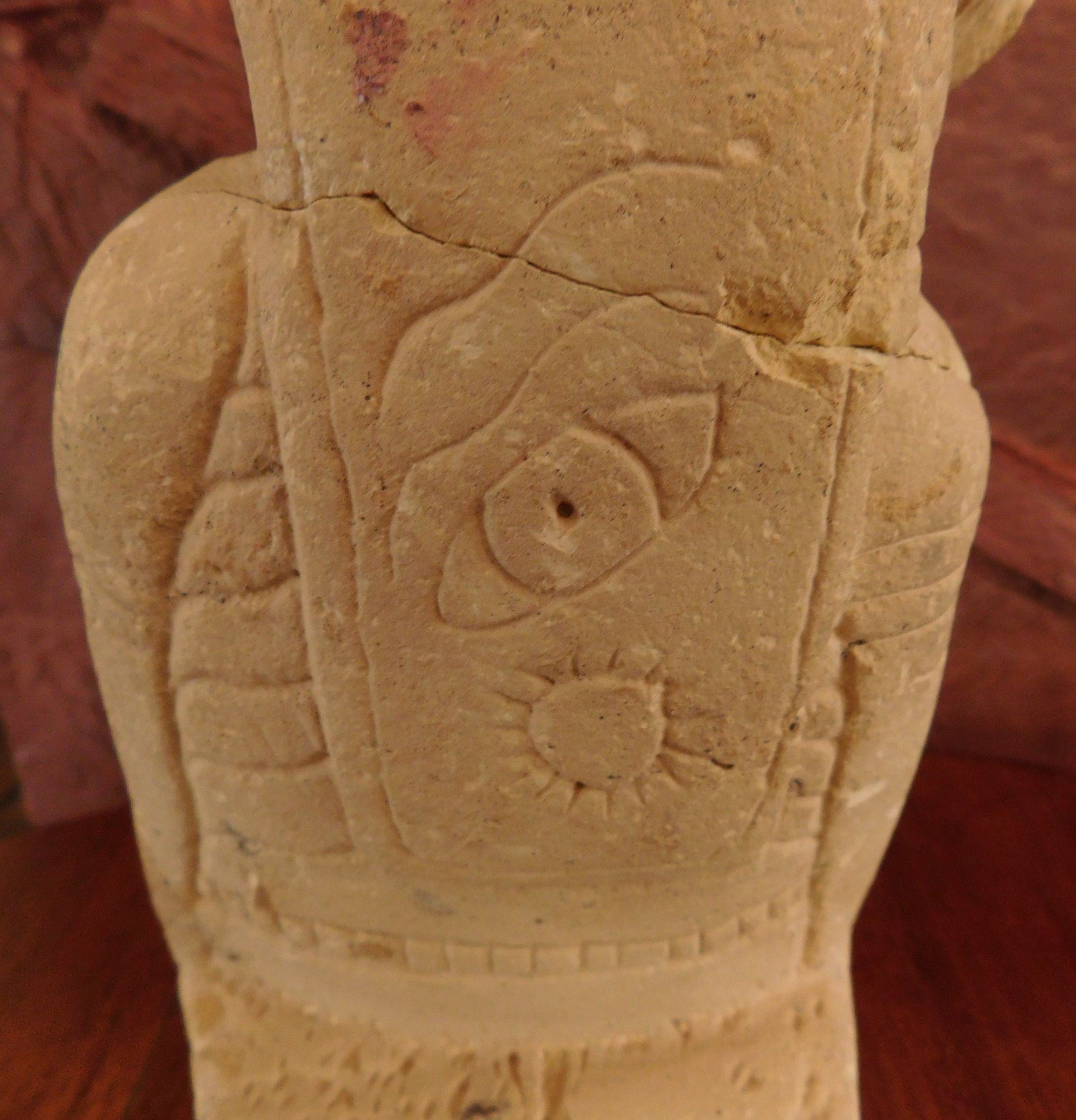 Stone Effigy Seated Figure, pre-historic item. Made of sandstone, the item measures 4 1/2" x 5 1/2" x 10 1/2". Ohio. Mississippian culture. From an old, 1960s California collection. Condition: Broken and reattached, see images. Shipping: $45.00 w/insurance and signature, due to size and value.