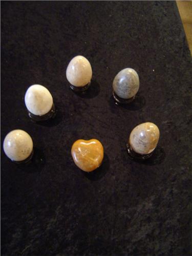 Stone carvngs, five 2.5" eggs and one 2" hearts with 6 stands