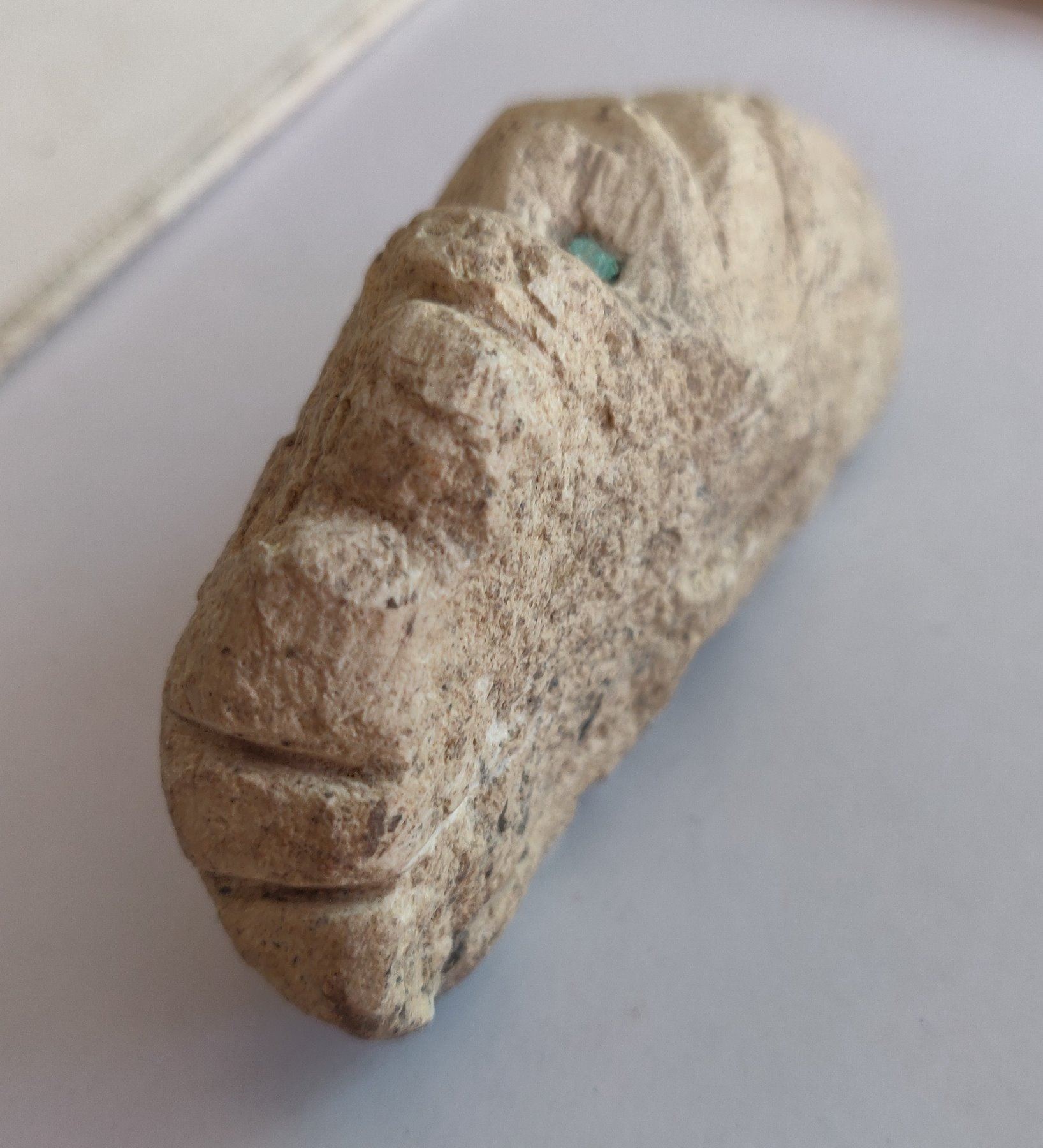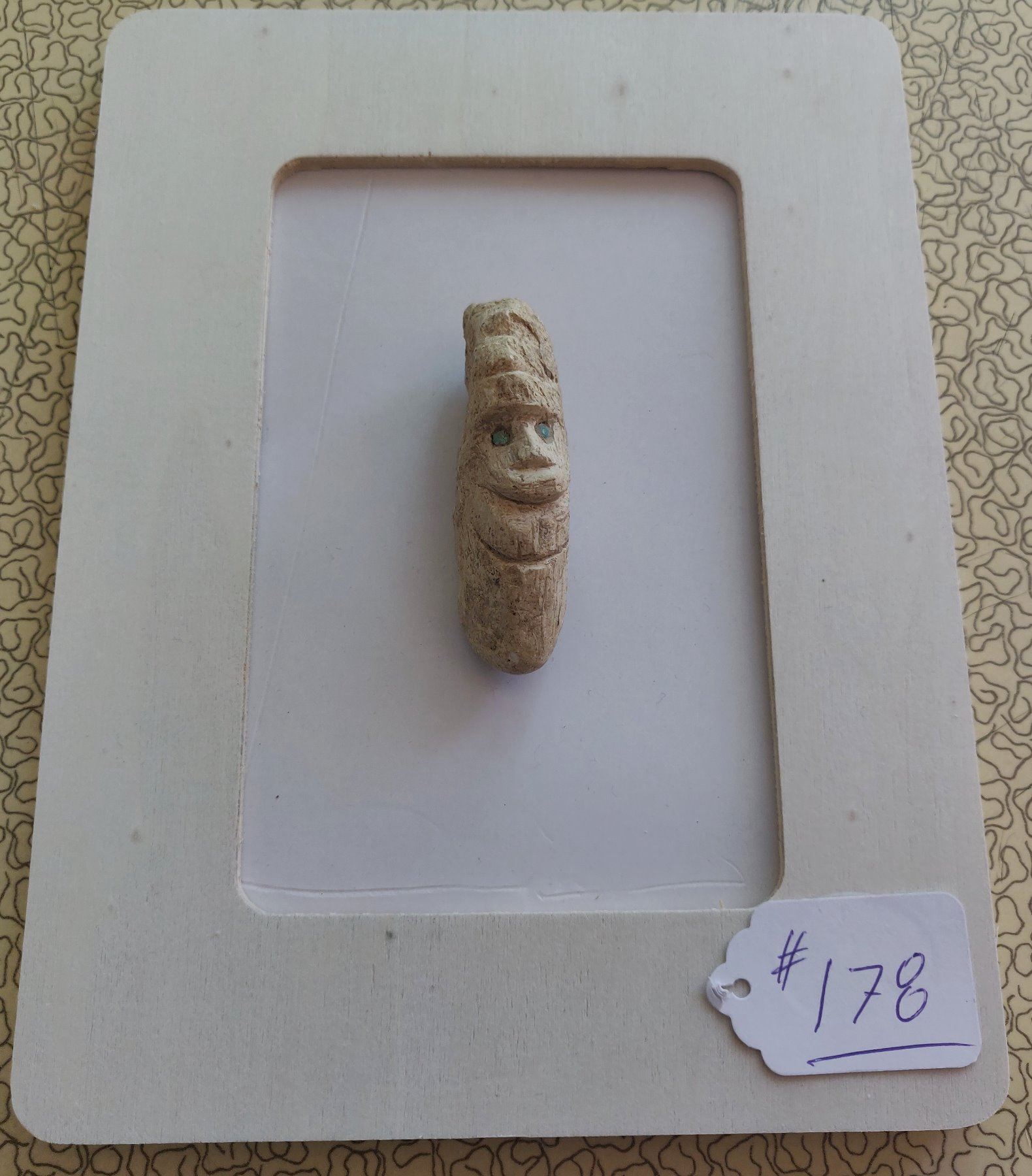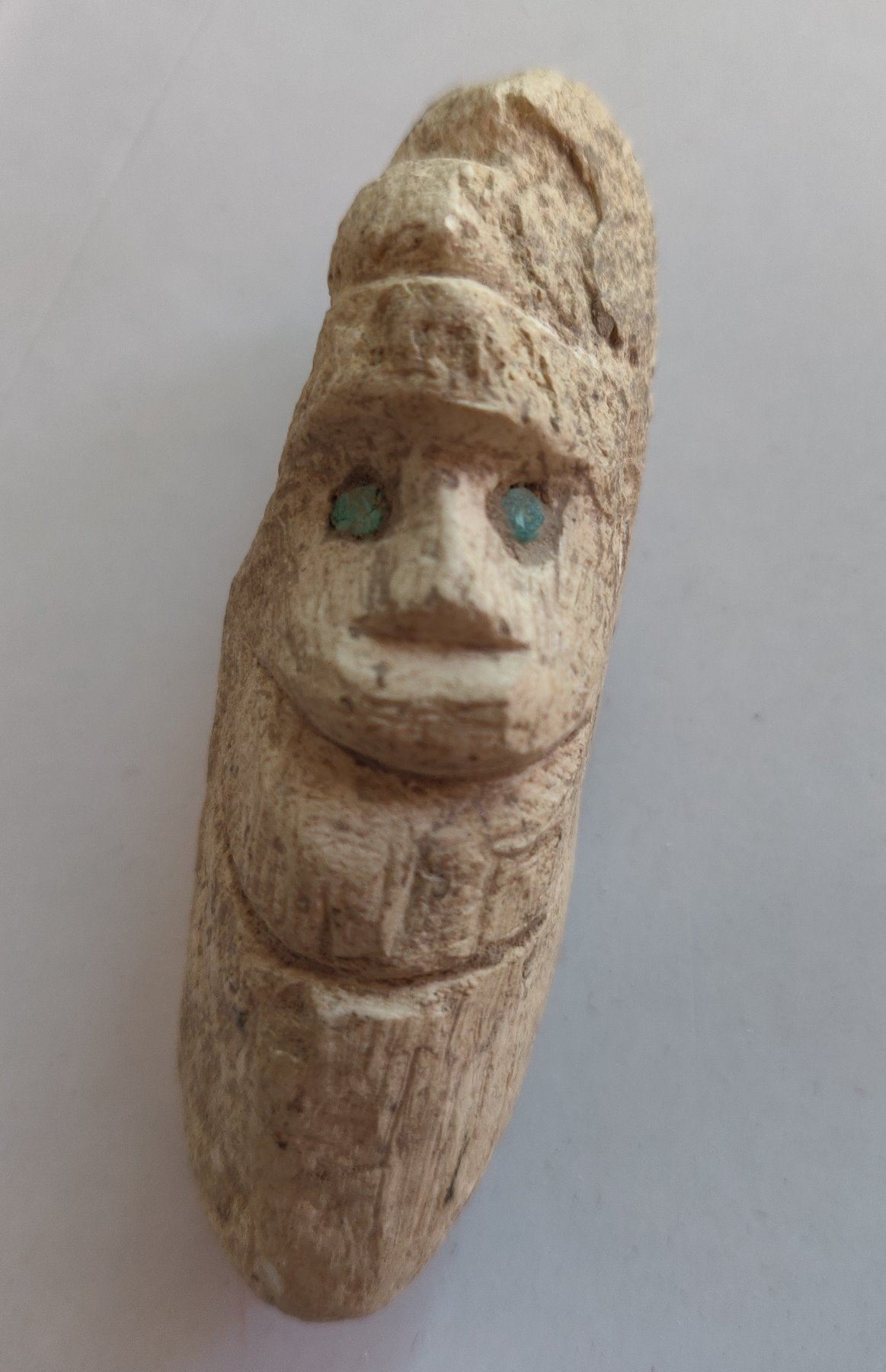 Stone Figure w/Turquoise Inlaid Eyes, pre-Columbian item. Made of hardstone and turquoise, the item measures 2 1/2" x 1 1/2" x 1". Central American. Condition: As found, see images. Shipping: $20.00 w/insurance and signature, due to value.