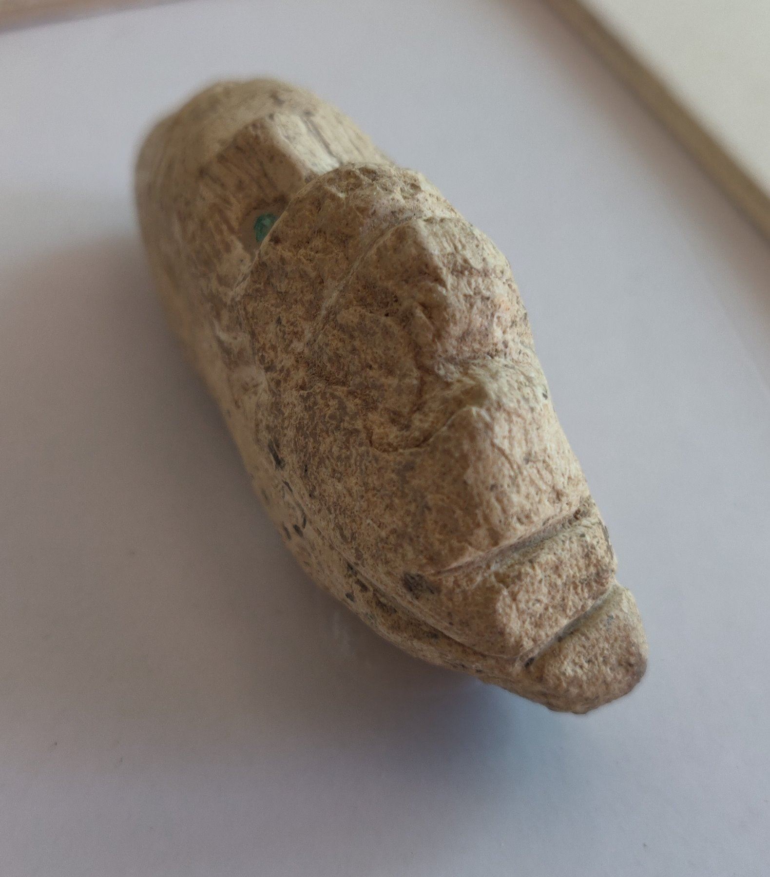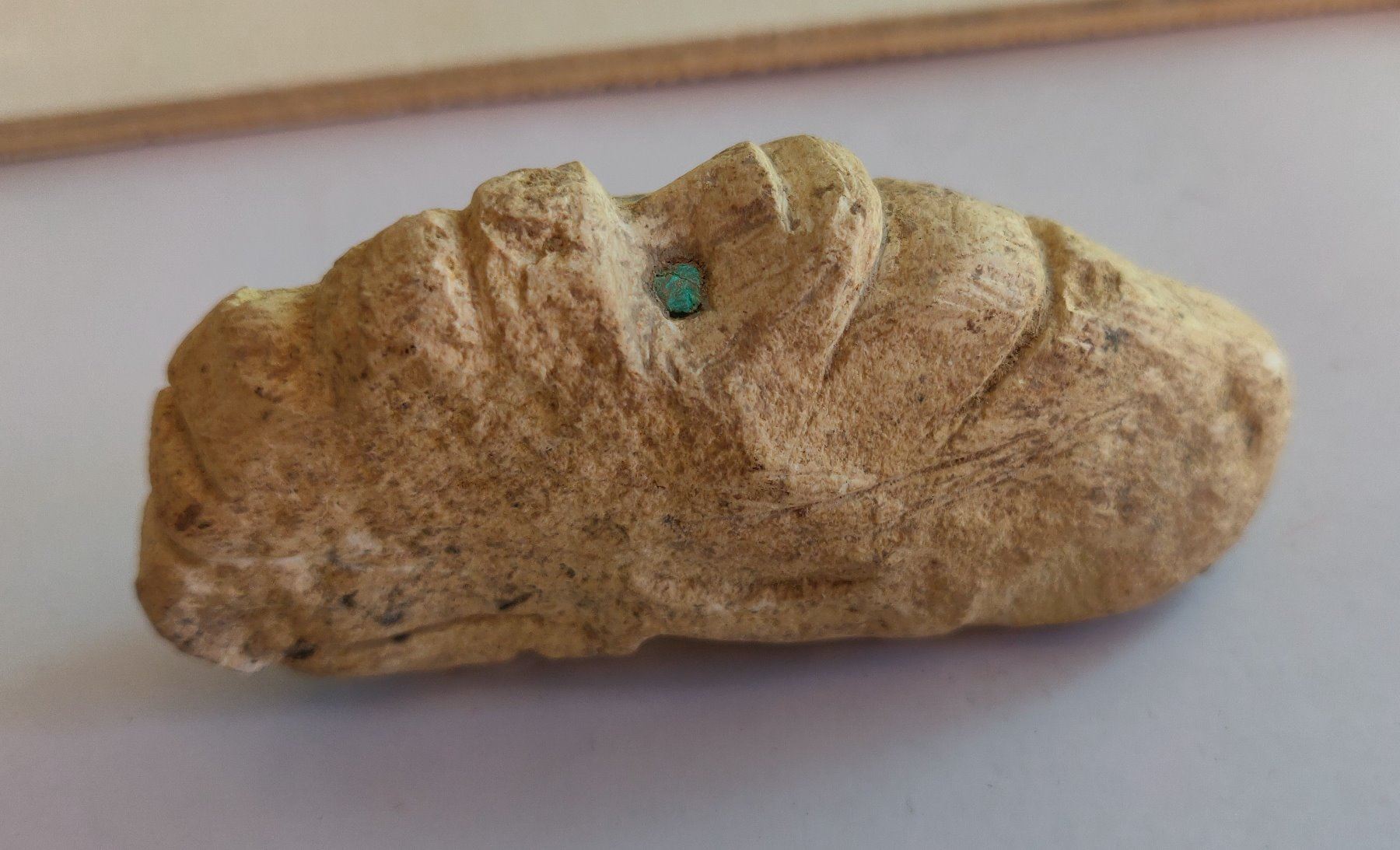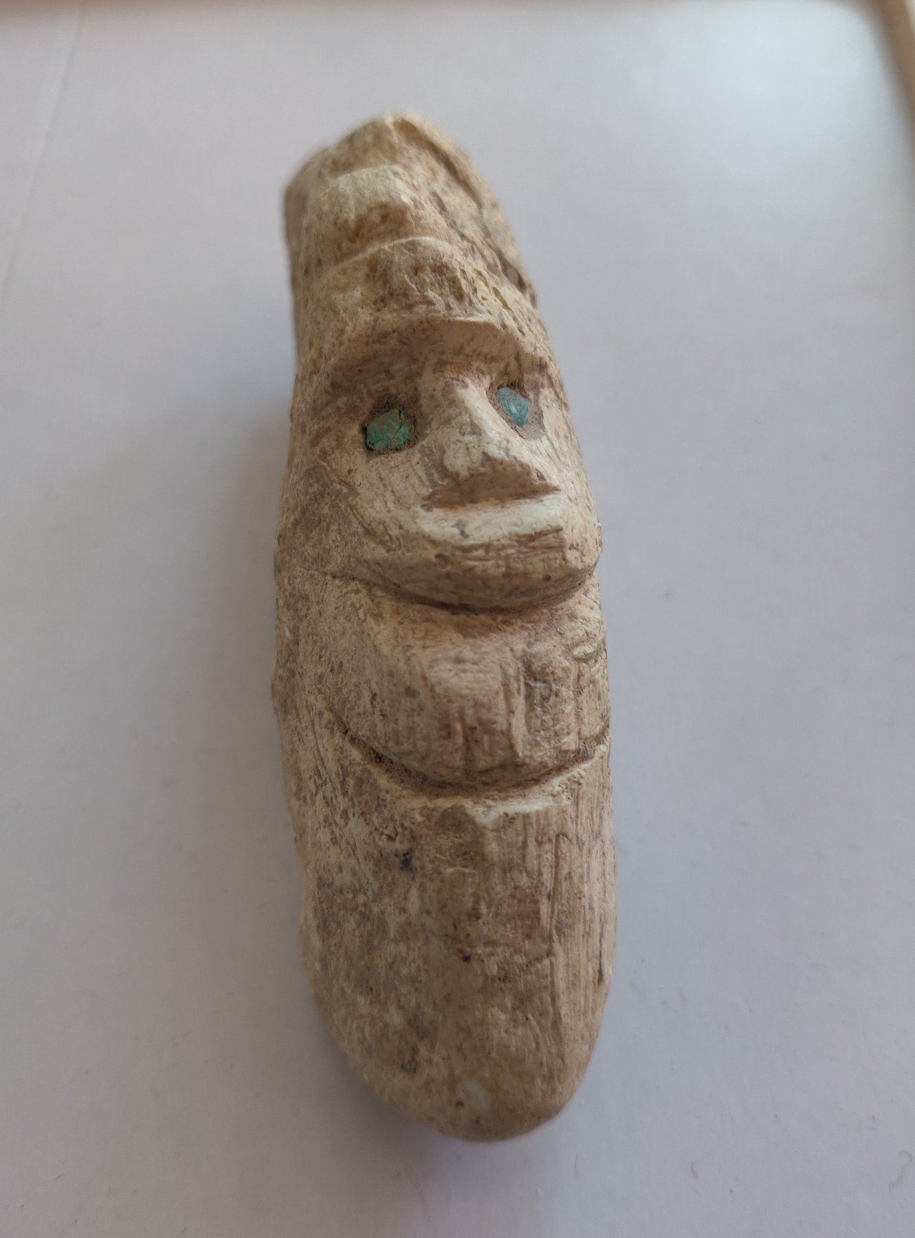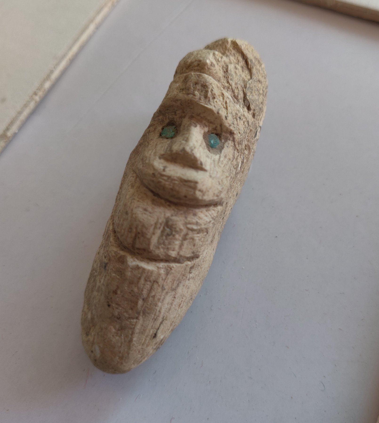 Stone Figure w/Turquoise Inlaid Eyes, pre-Columbian item. Made of hardstone and turquoise, the item measures 2 1/2" x 1 1/2" x 1". Central American. Condition: As found, see images. Shipping: $20.00 w/insurance and signature, due to value.