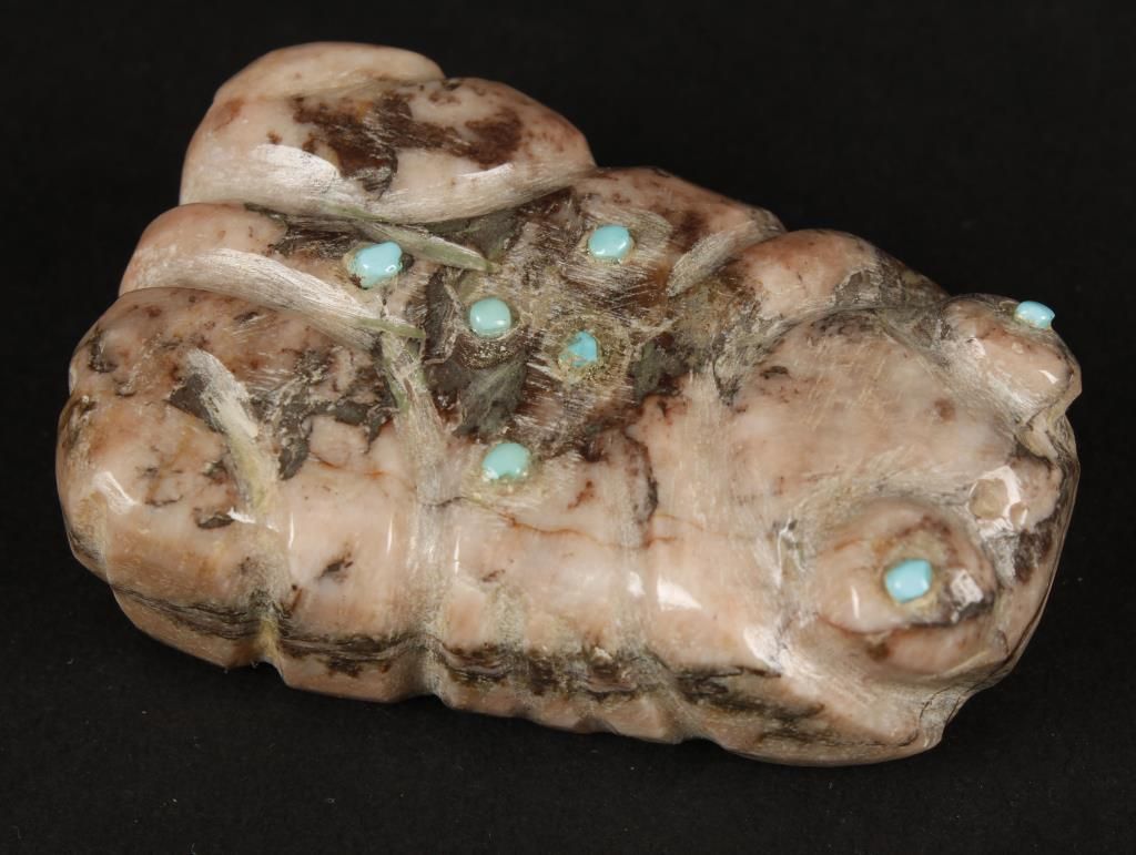 With turquoise eyes and spots. Age and origin unknown. 2-3/4" long x 1-3/4" wide x 1" high.