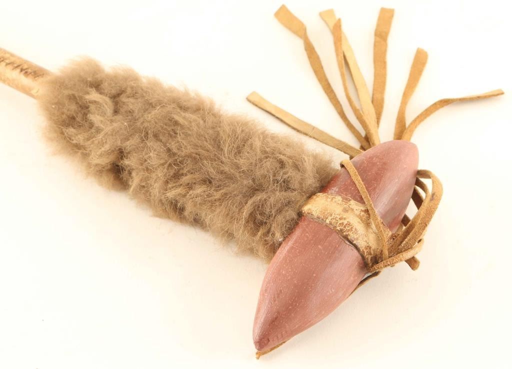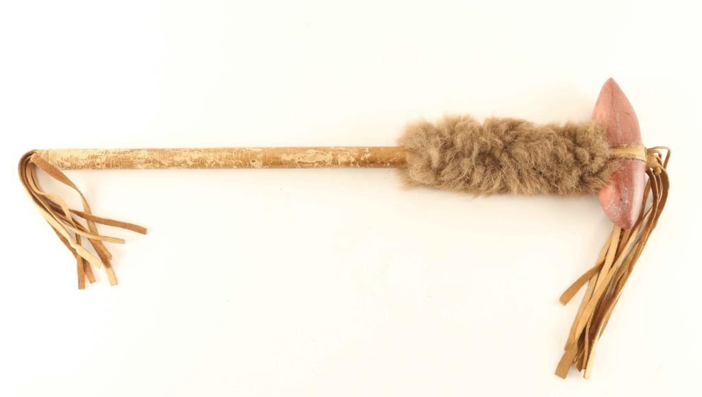 Fringe and hide attached American Indian 19th to 20th Century. 19 3/8" overall, 5 1/2" across with a catlinite (pipe stone) head. Northern Sioux to West Dakota tribes.