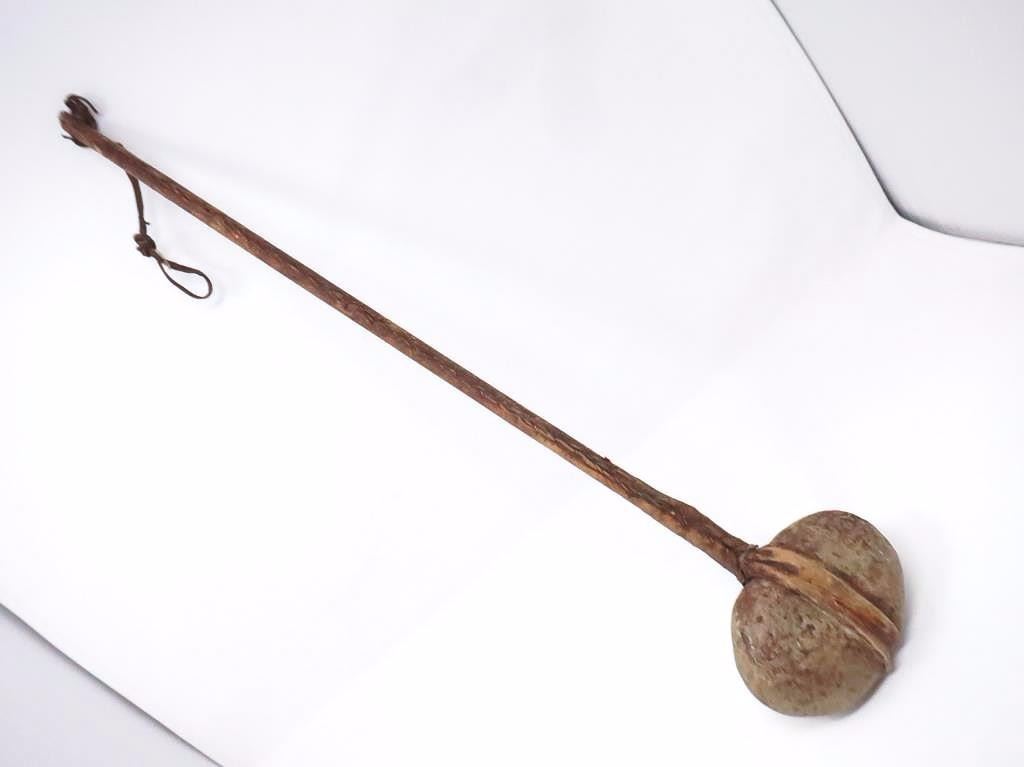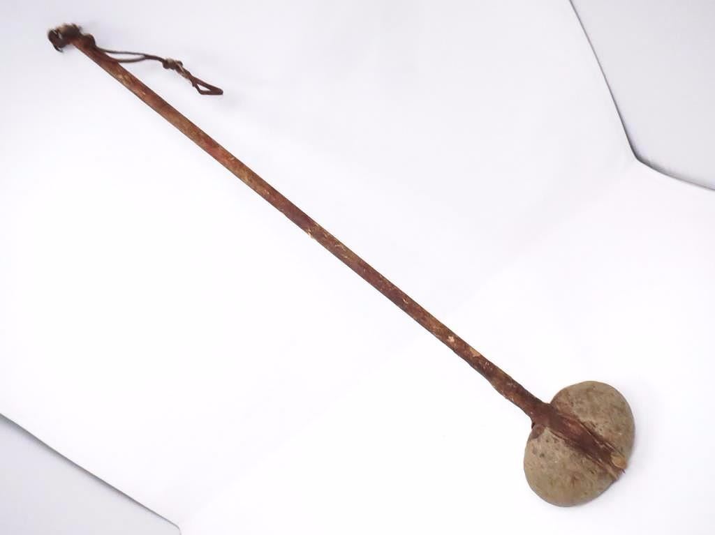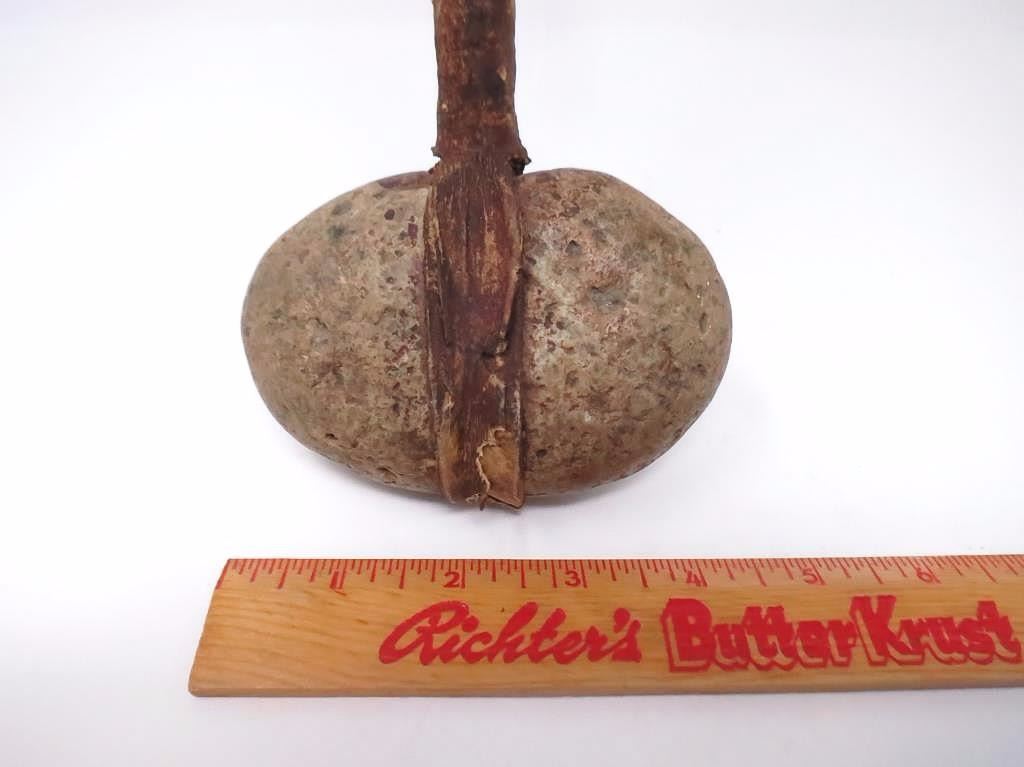 Stone headed war club, northern plains, with a rawhide bound haft. About 24"