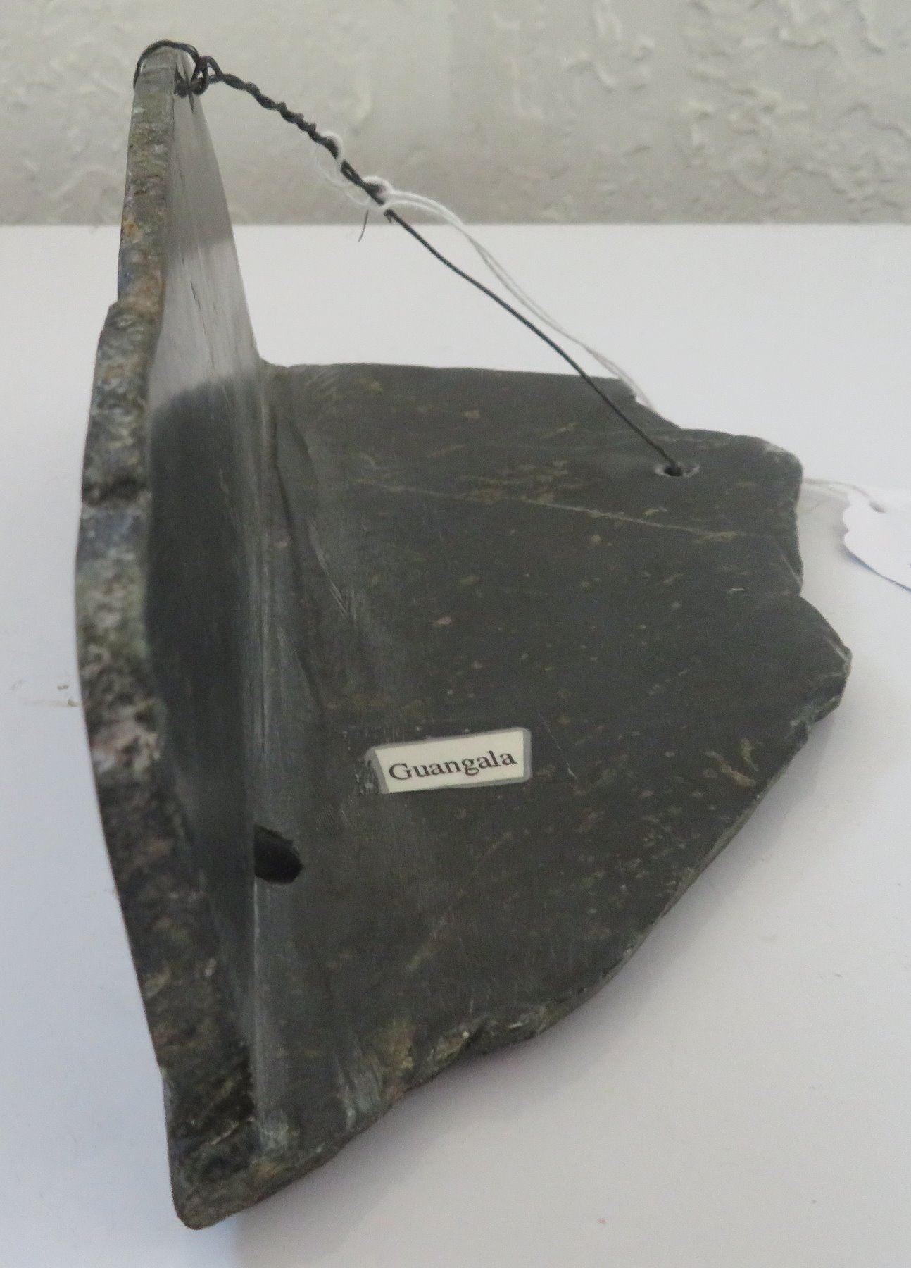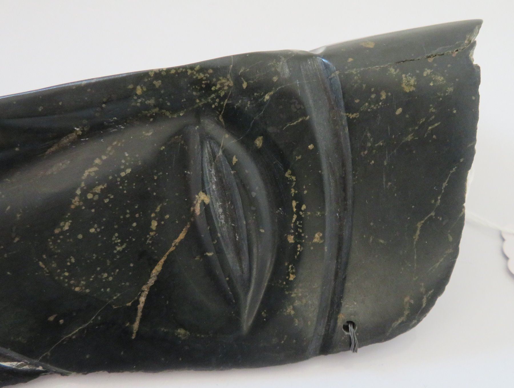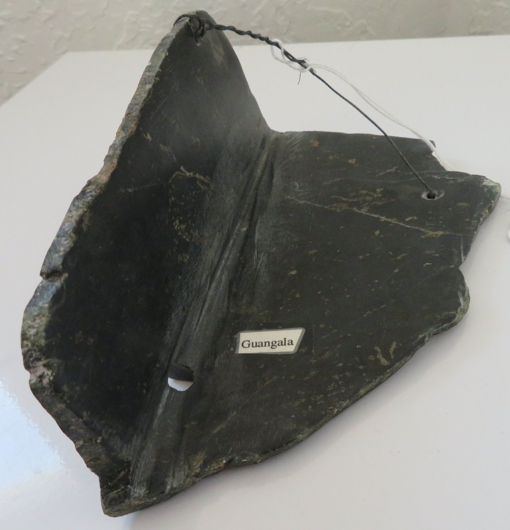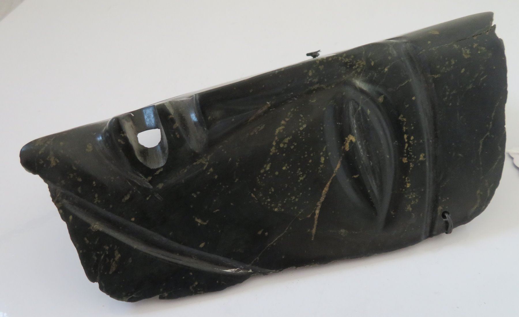 Stone Mask Fragment, pre-Columbian item. Made of black jade, the item measures 7 1/2" x 5" x 2 1/2". Guangala, South America. Condition: All edges broken, see images. Shipping: $24.50 w/insurance and signature.