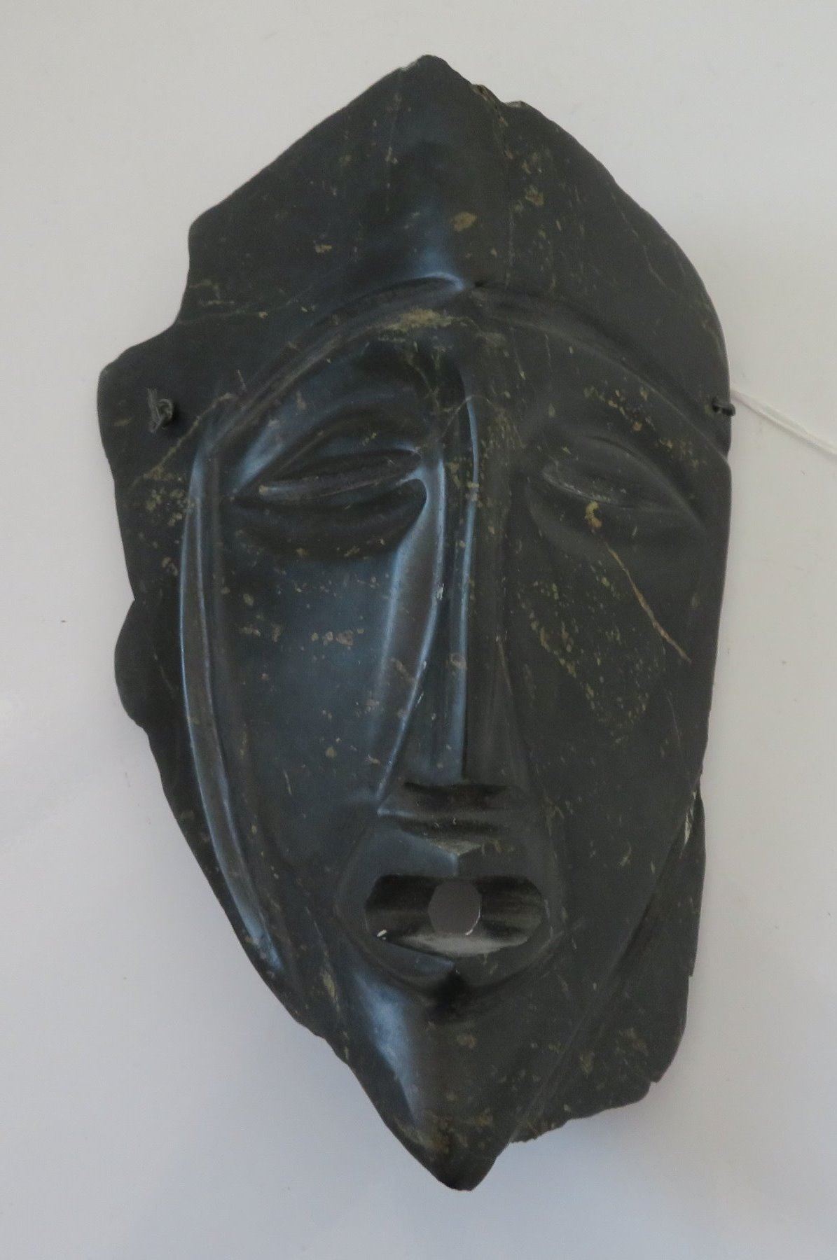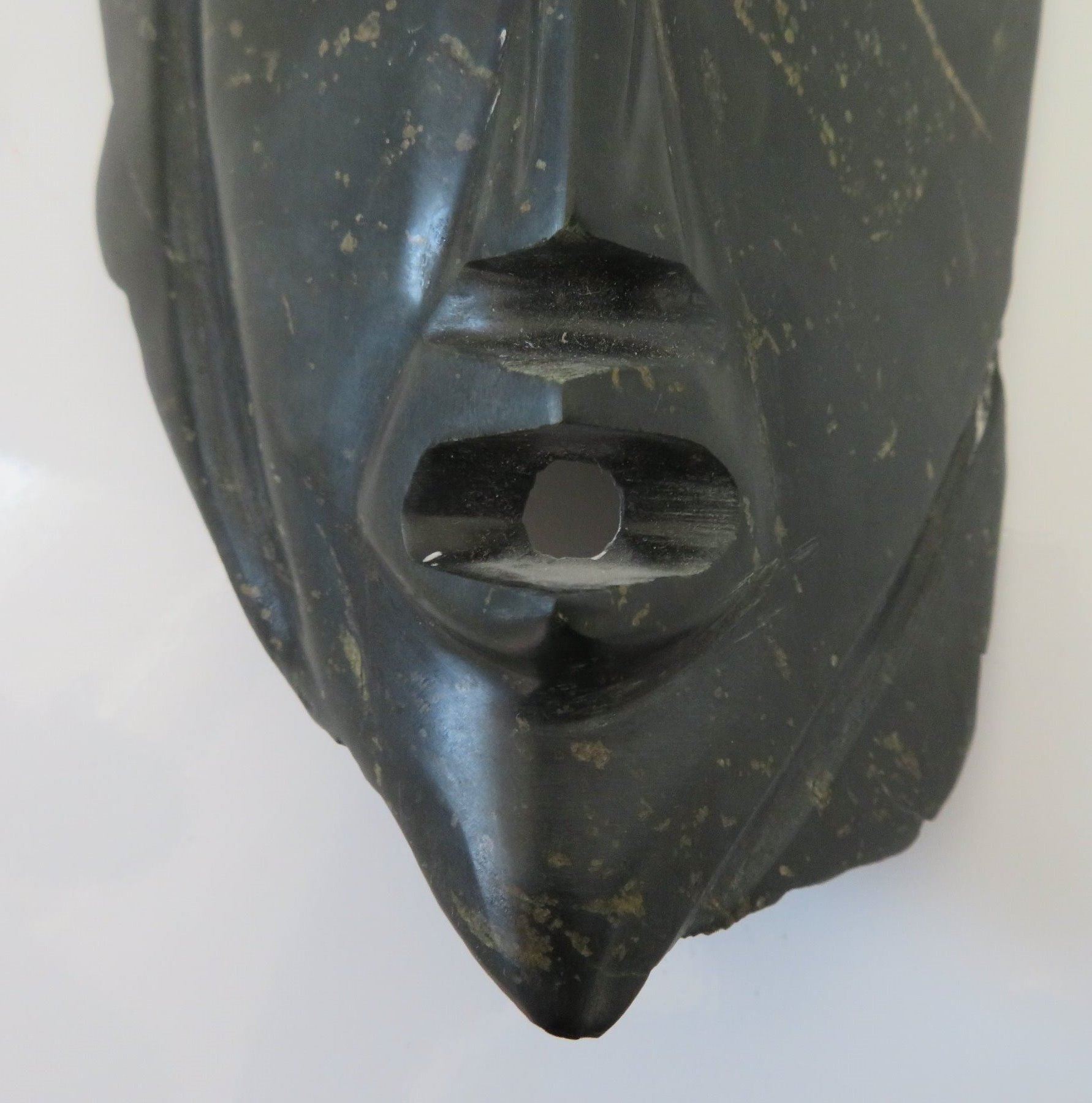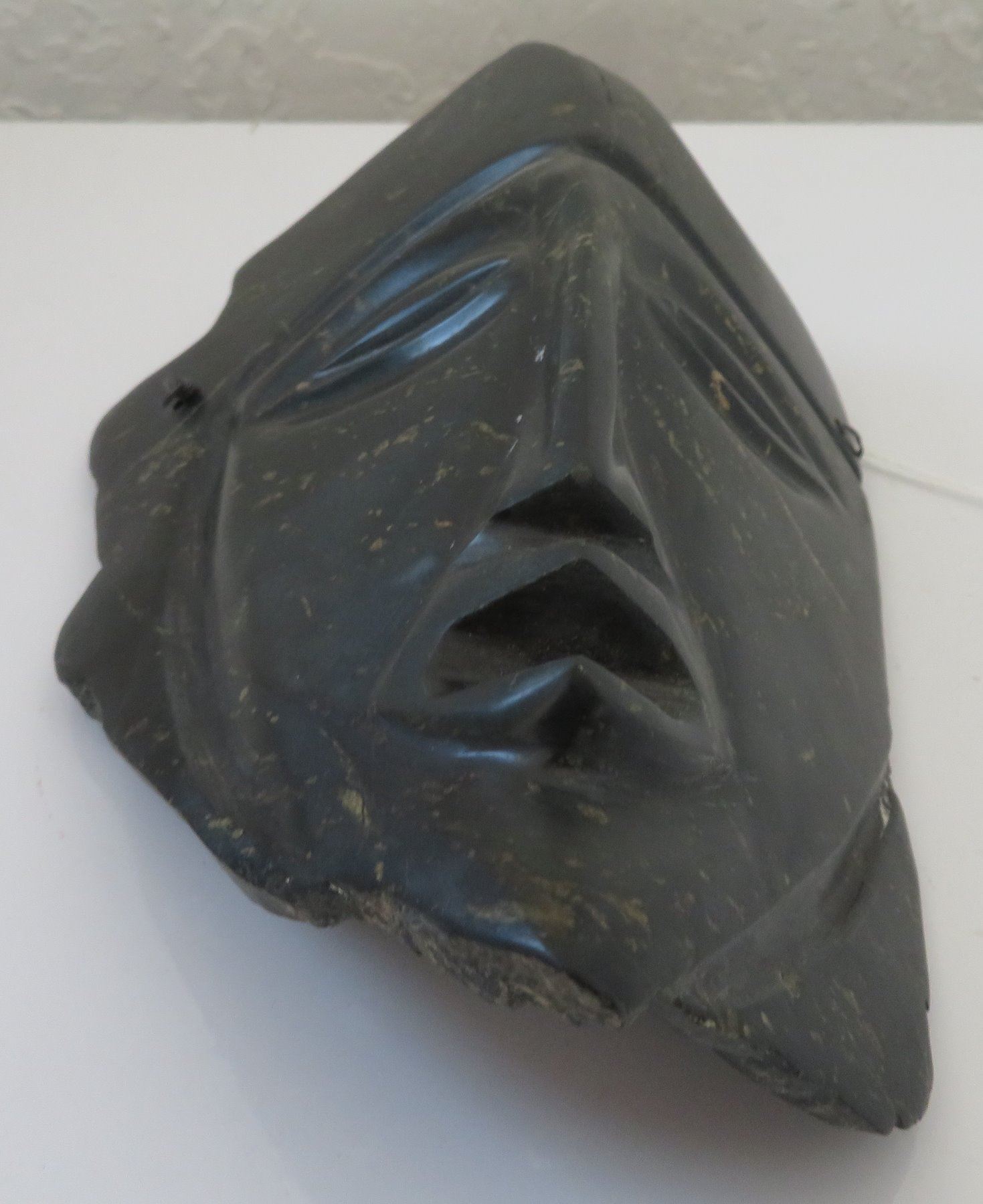 Stone Mask Fragment, pre-Columbian item. Made of black jade, the item measures 7 1/2" x 5" x 2 1/2". Guangala, South America. Condition: All edges broken, see images. Shipping: $24.50 w/insurance and signature.