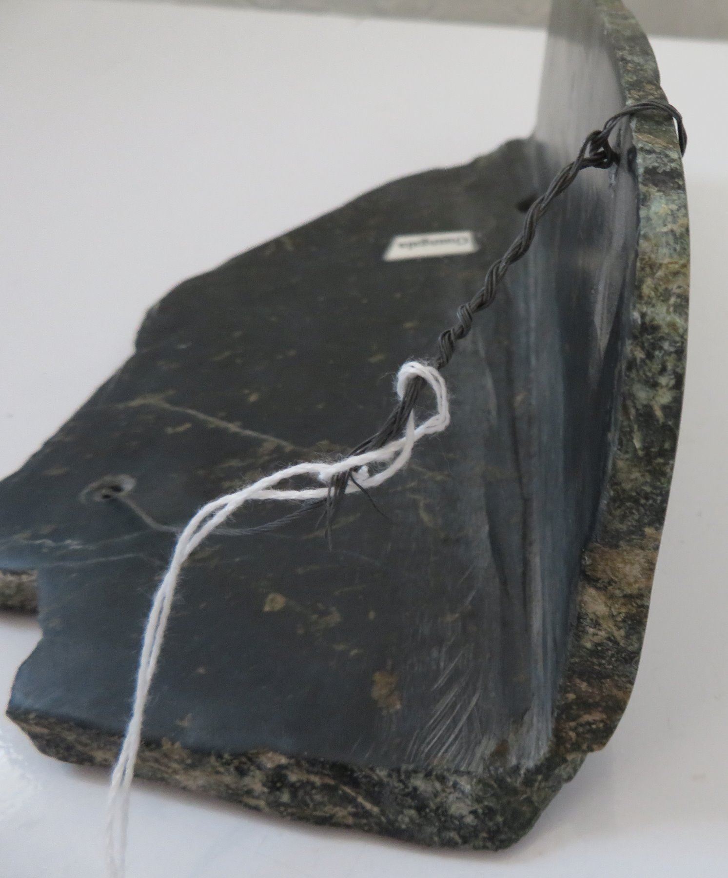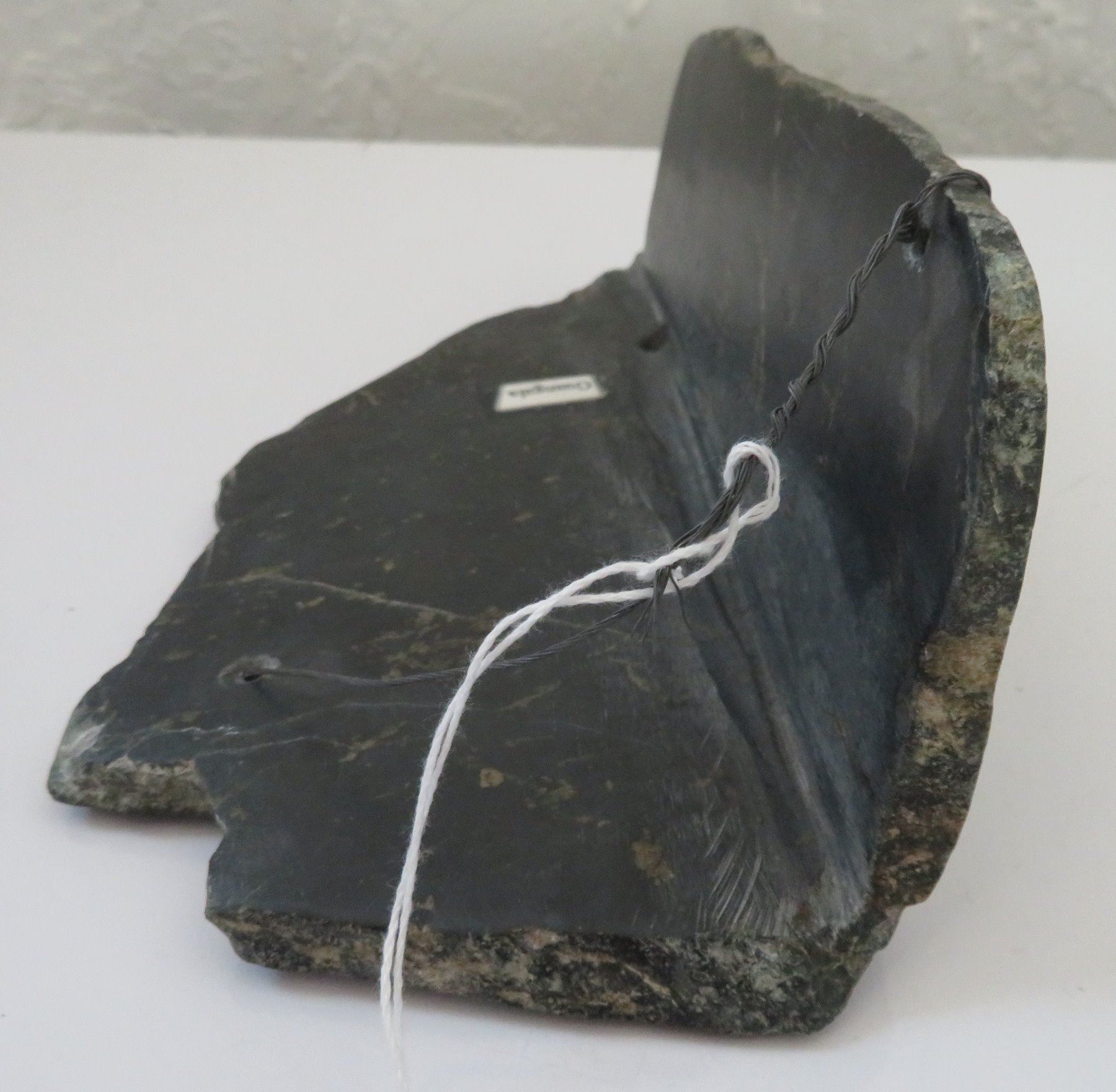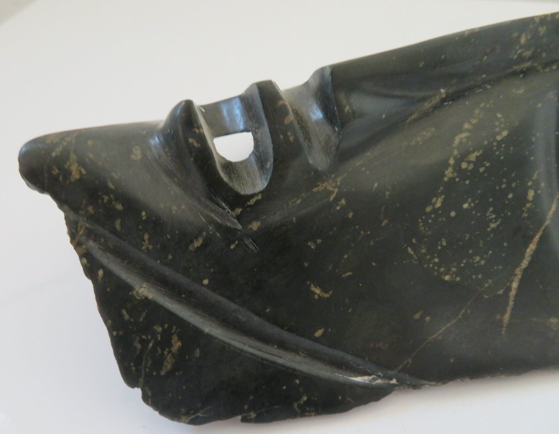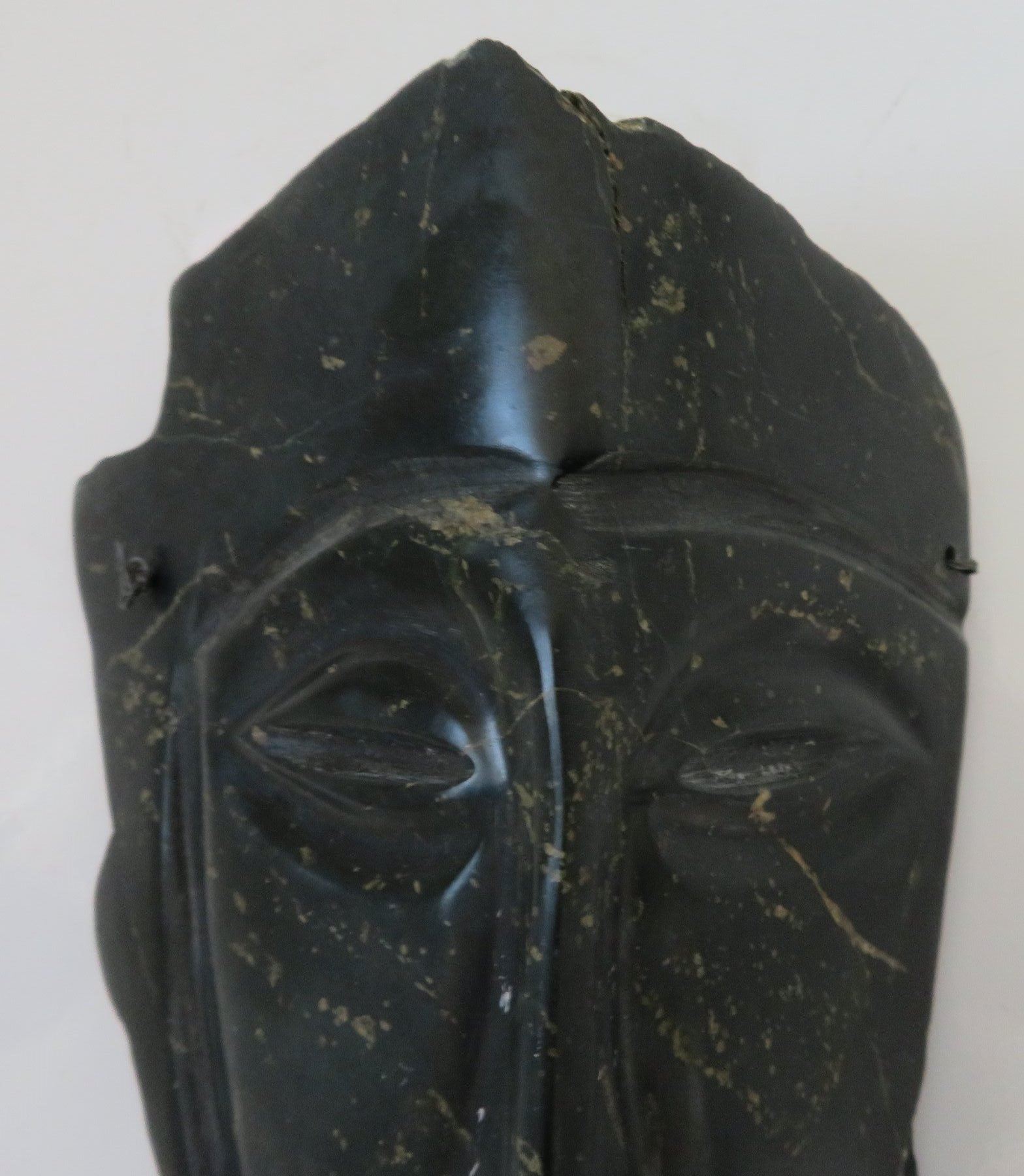 Stone Mask Fragment, pre-Columbian item. Made of black jade, the item measures 7 1/2" x 5" x 2 1/2". Guangala, South America. Condition: All edges broken, see images. Shipping: $24.50 w/insurance and signature.