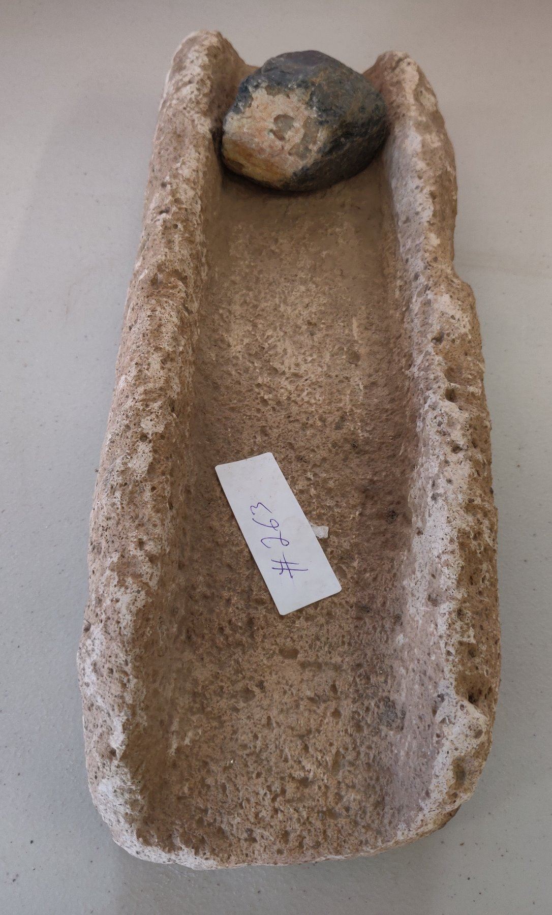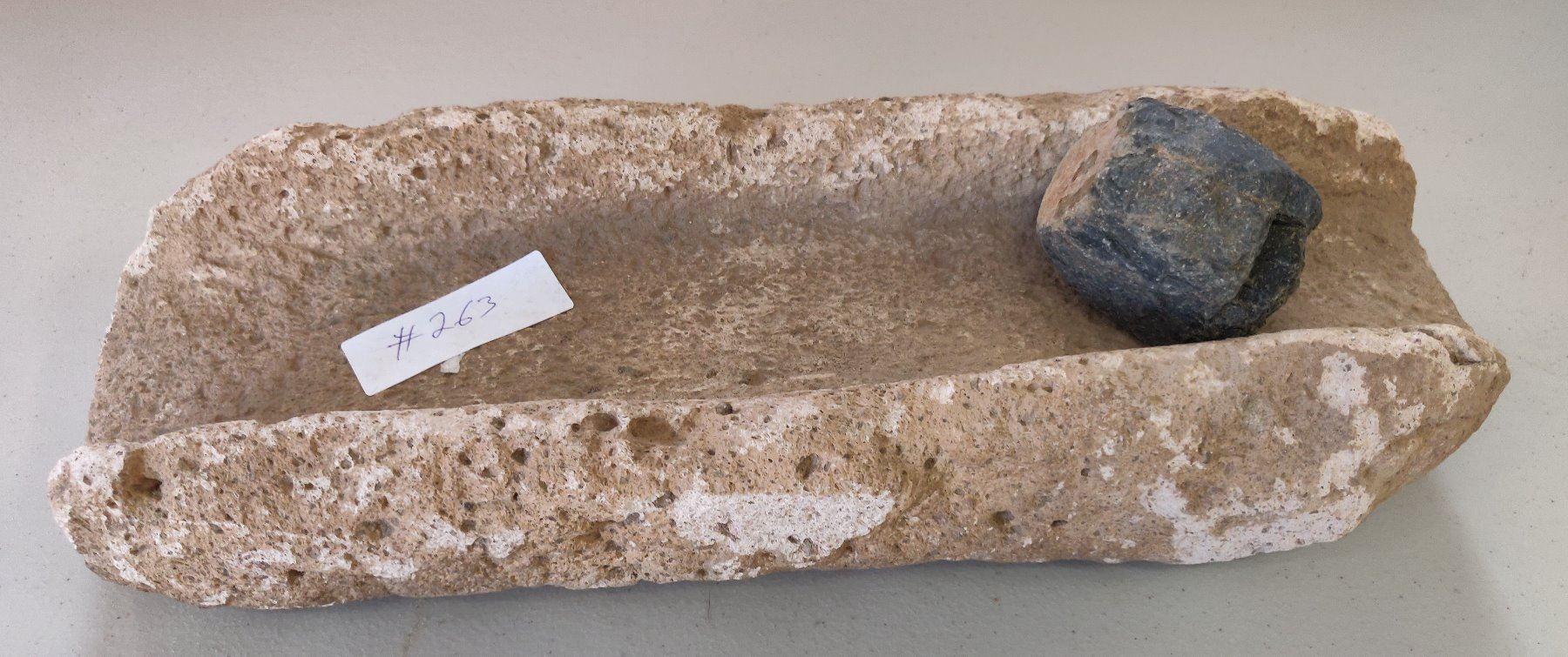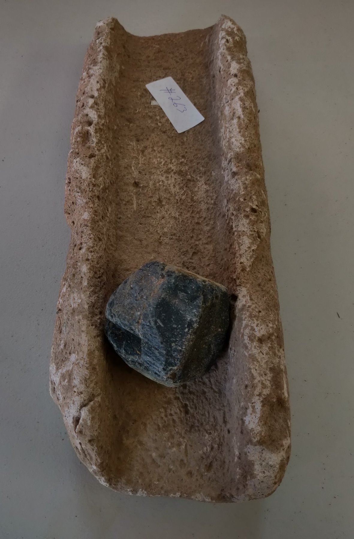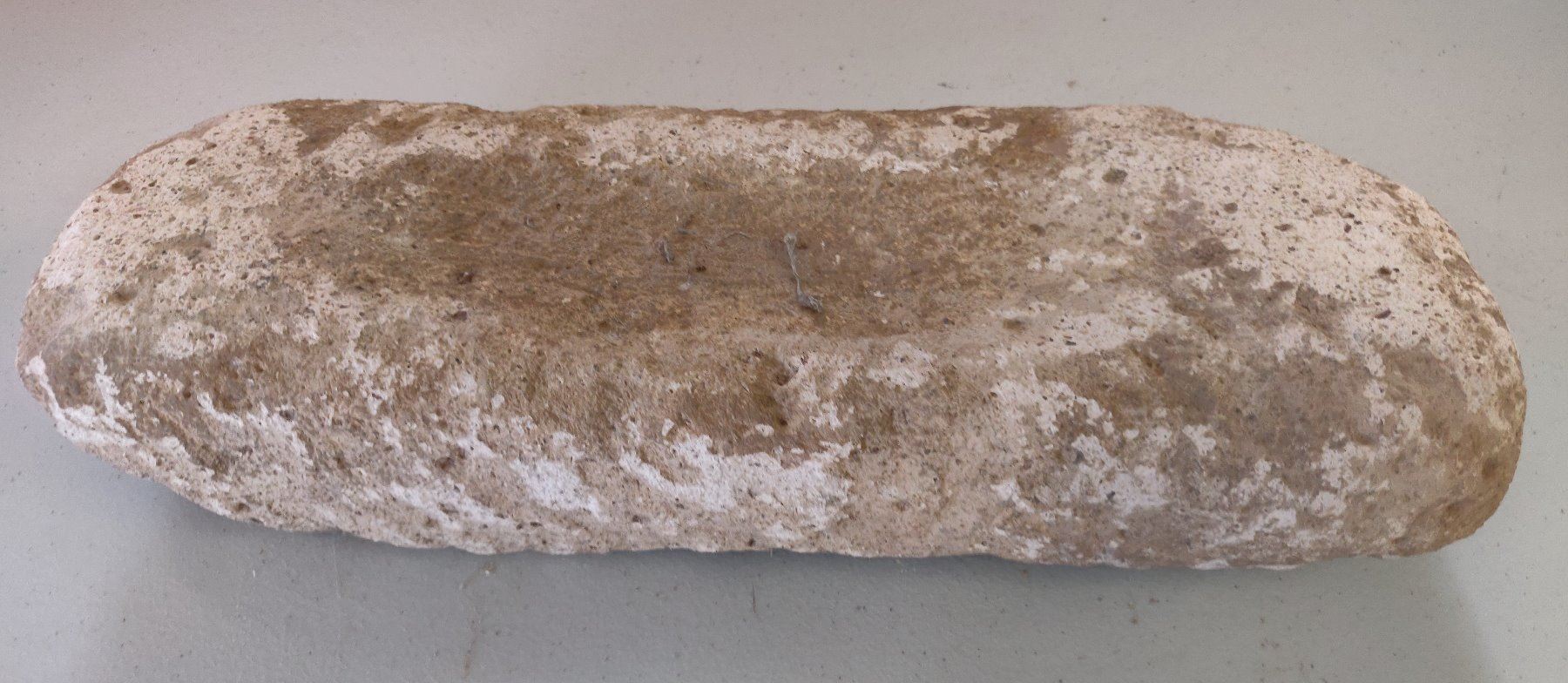Stone Metate, pre-historic item. Made of likely tuffa, the item measures 17" x 6". Ajo, Pima County, Arizona. Condition: Chips, see images. Shipping: $45.00 USA estimate only, w/insurance and signature.