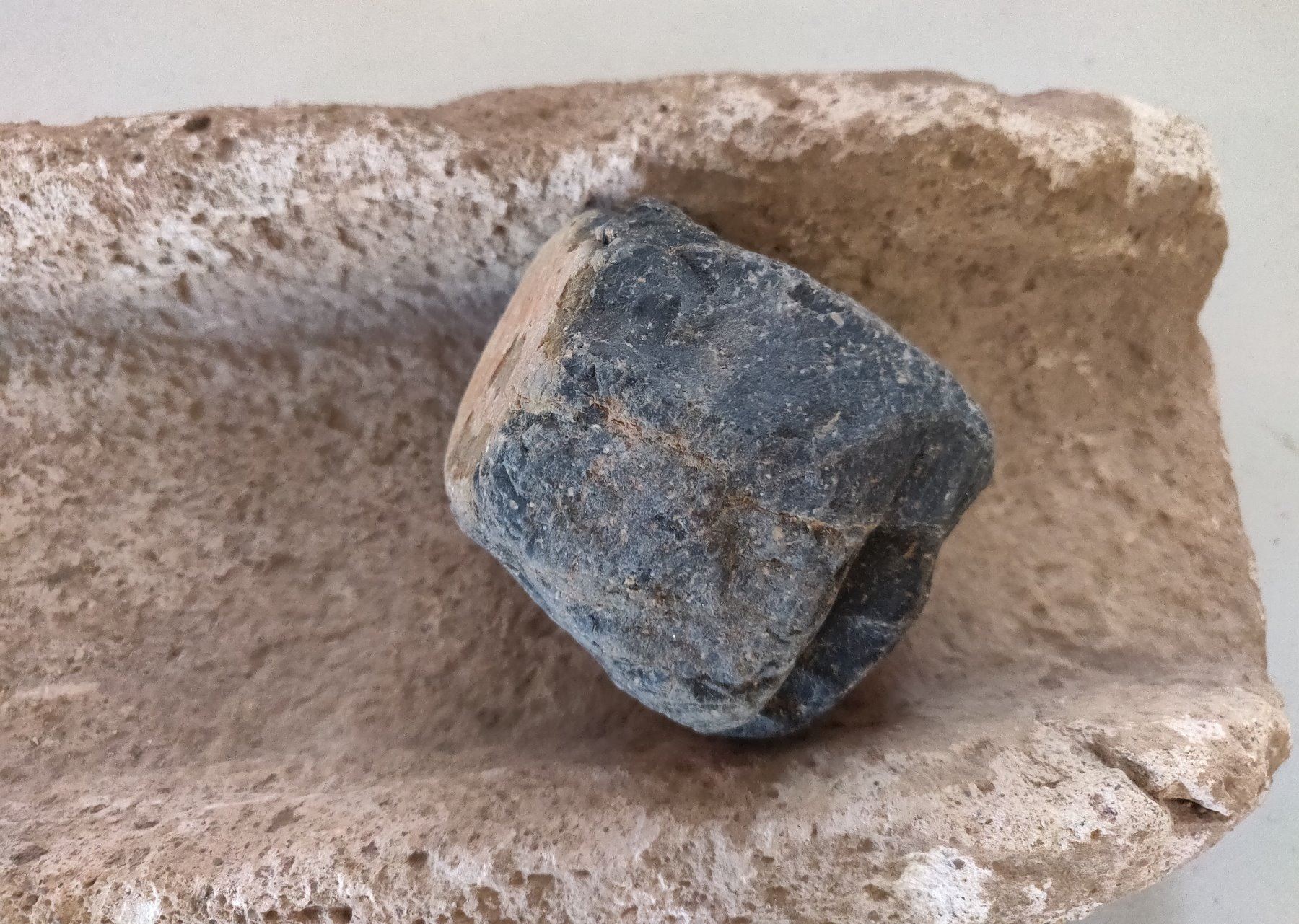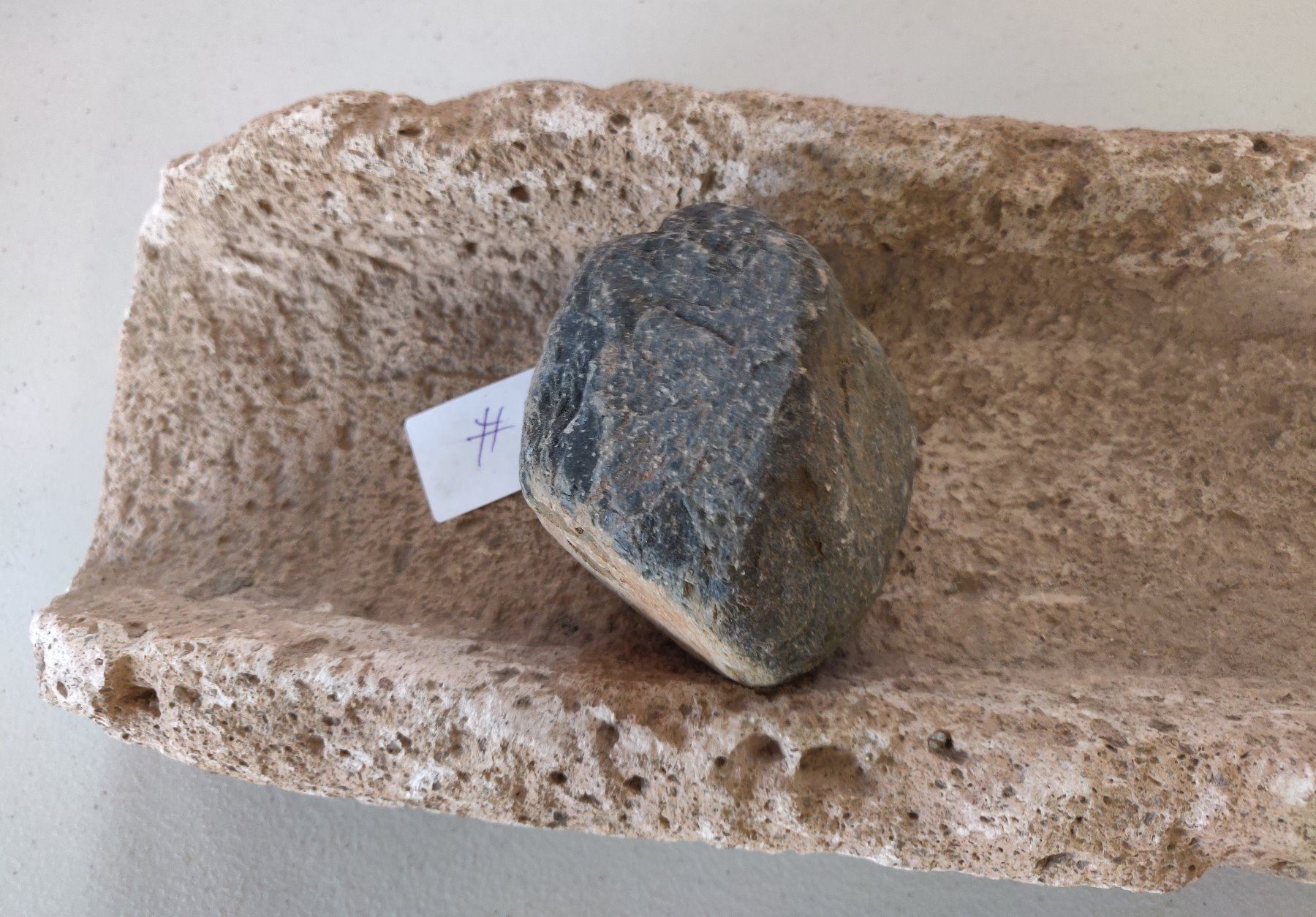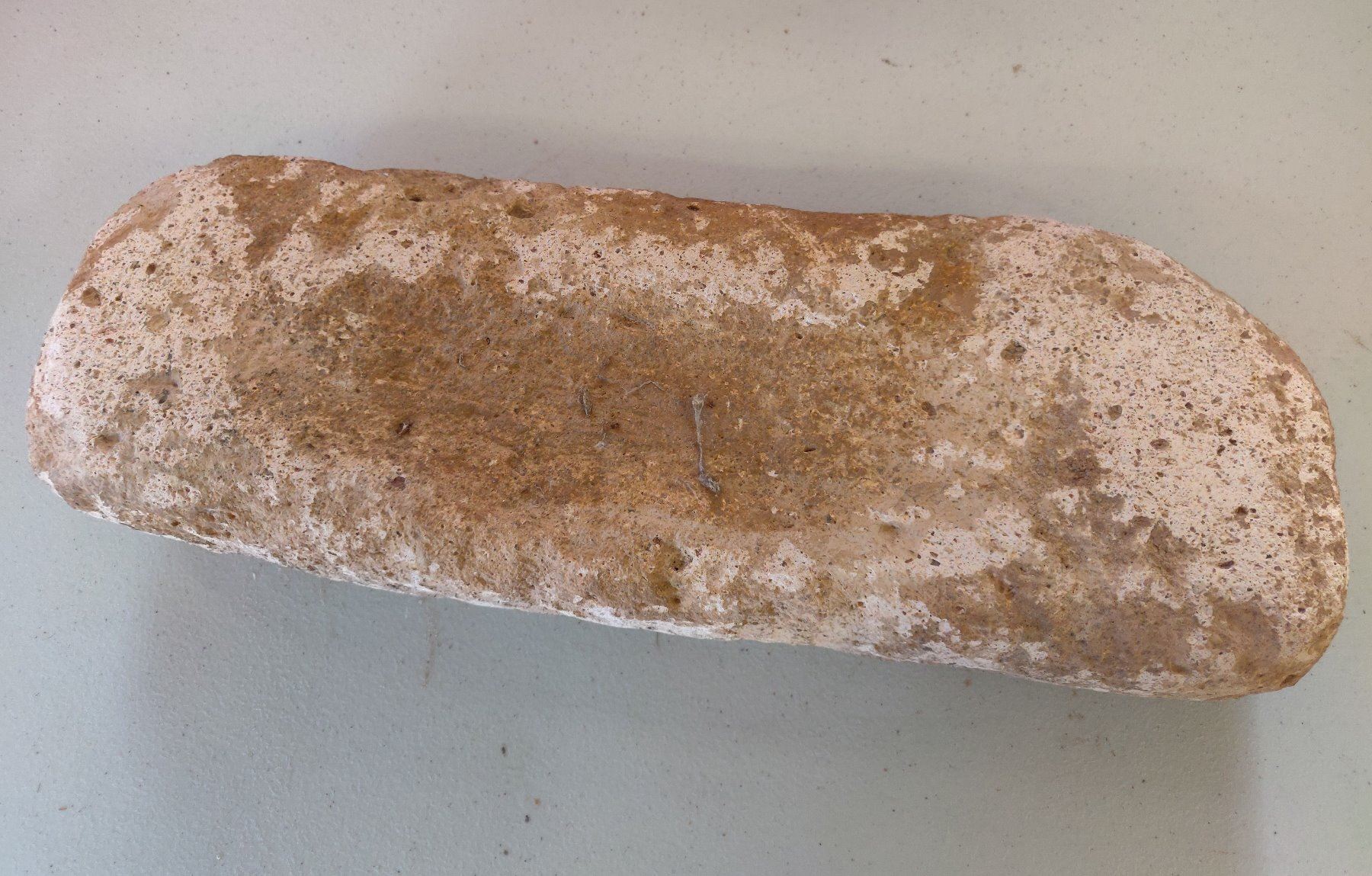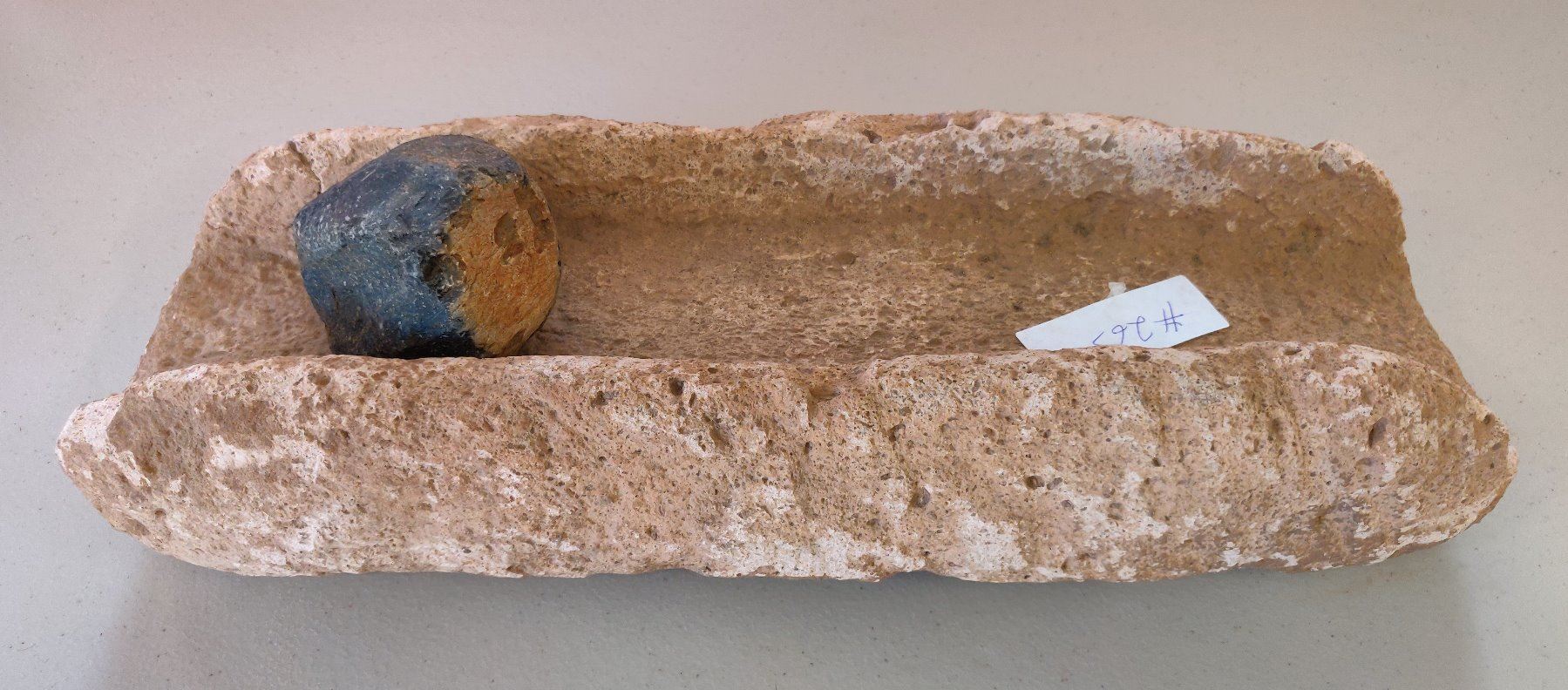 Stone Metate, pre-historic item. Made of likely tuffa, the item measures 17" x 6". Ajo, Pima County, Arizona. Condition: Chips, see images. Shipping: $45.00 USA estimate only, w/insurance and signature.
