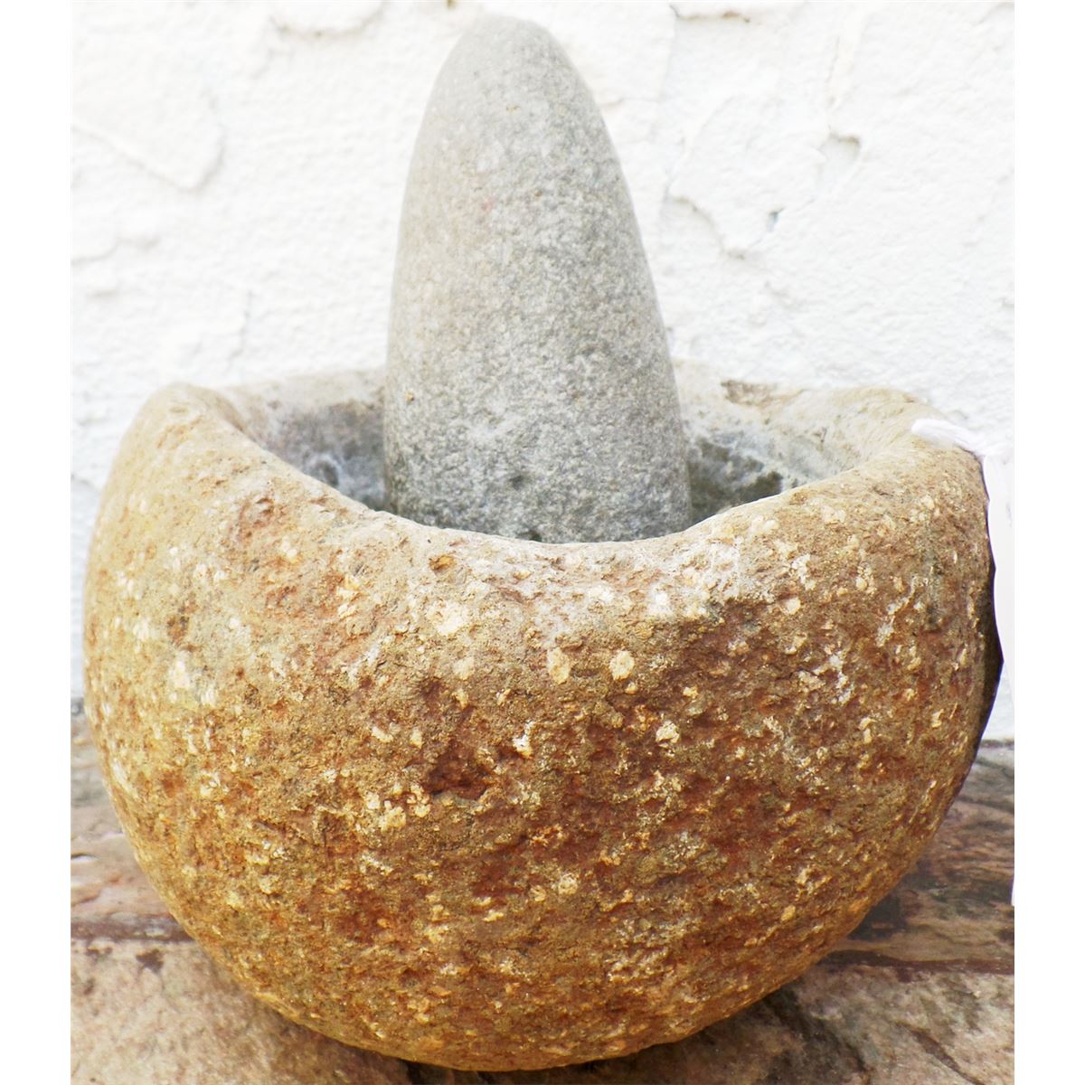 Stone Mortar & Pestle. Approx. 1000 to 2000 years old. This is made from granite. Mortar is 5 1/2" by 4 1/2" long. Pestle is 4 x 2 inches. Item is from Coastal Southern California. Condition: It has minor nicks and scratches, see images. Shipping: $30.00