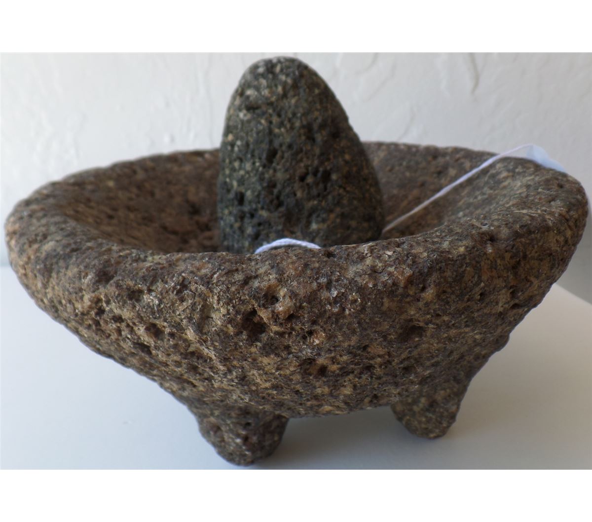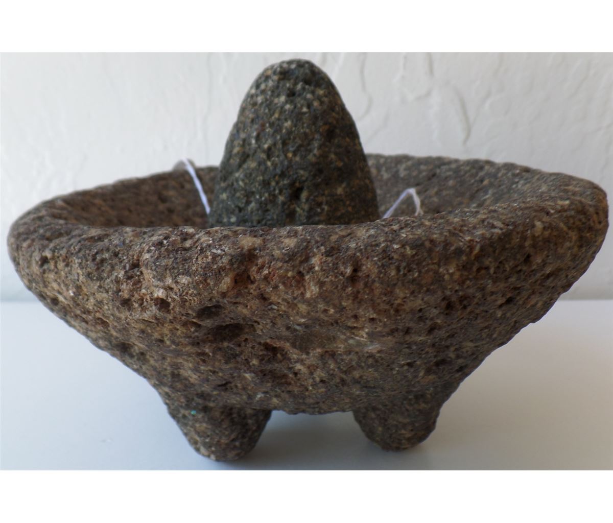 1920's Stone Mortar and pestle made from basalt. The mortar is 7 x 3 inches and the pestle is 2 x 3 inches. The item was used for almost 100 years and shows normal wear. Shipping $26.00.