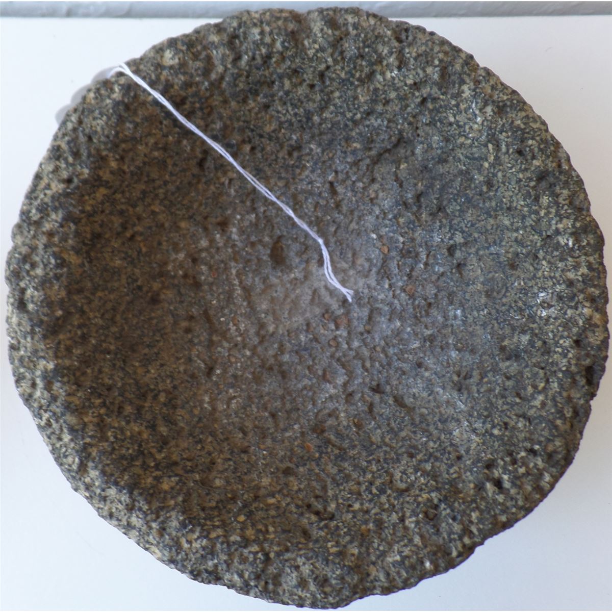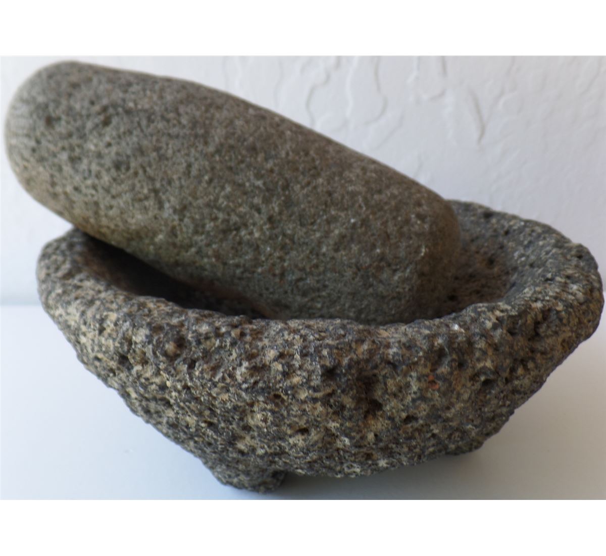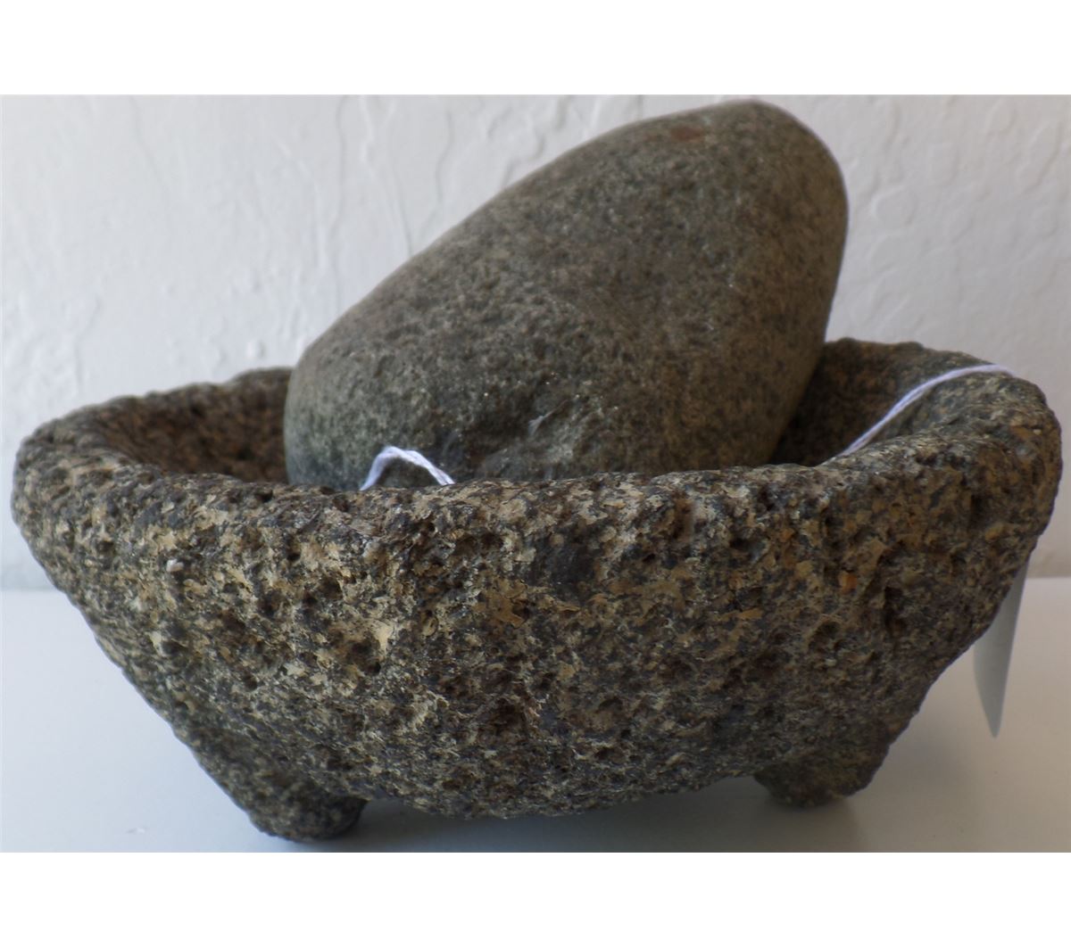 Stone Mortar measuring 7 1/2 x 3 1/2 inches an pestle measuring 6 x 3 1/2 inches from Baja, Mexico. The pestle ha a piece missing on one side. The mortar is in good condition. These items are 100 plus years old and are made from basalt. Shipping $20