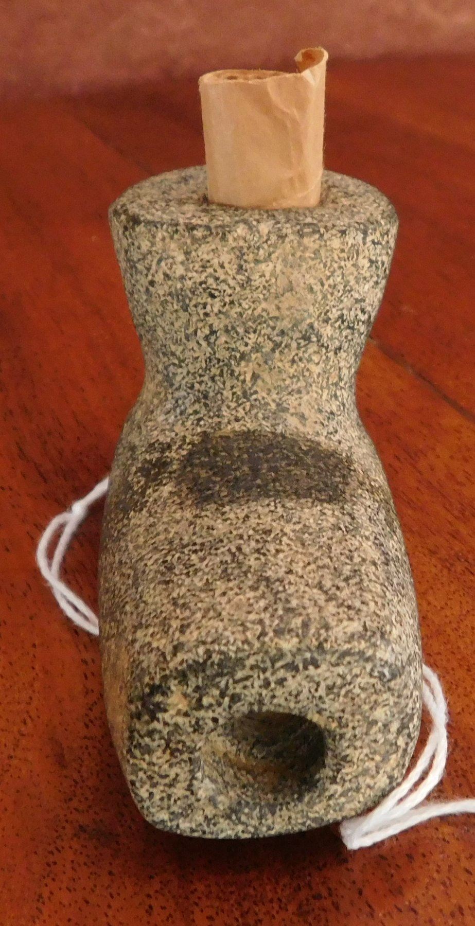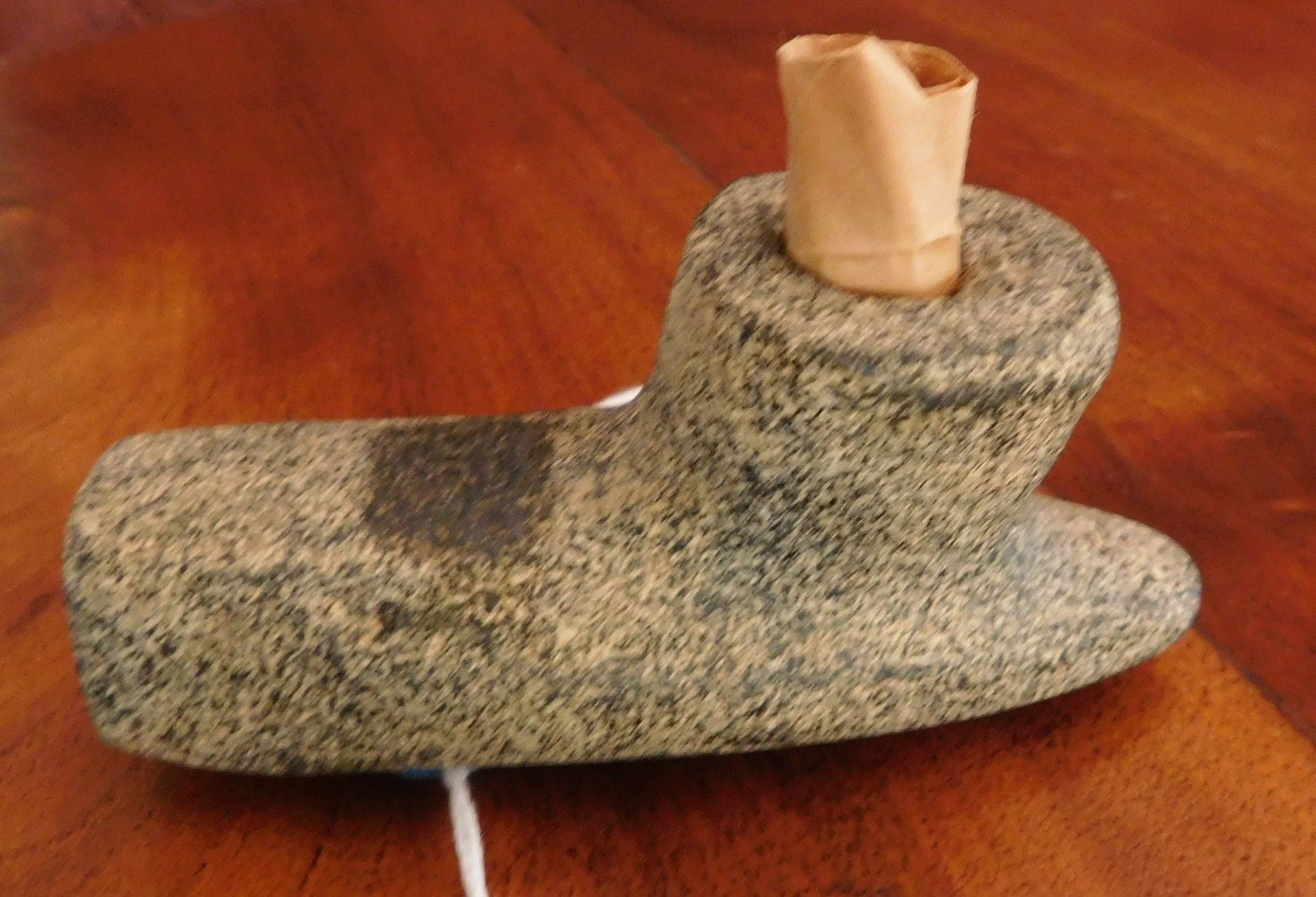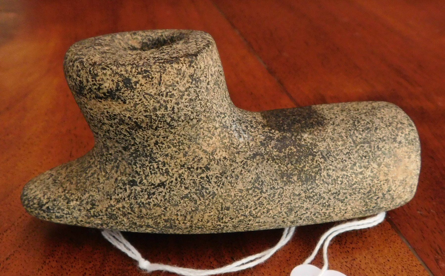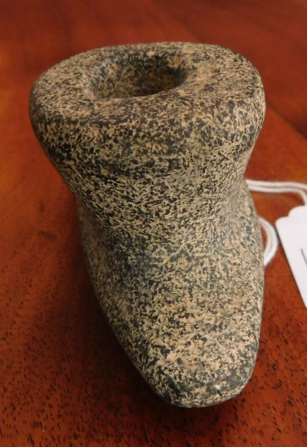 Stone Pipe, pre-historic item. Made of granite, the item measures 4" x 2" x 1 7/8". Jasper County, Illinois. From an old, 1960s California collection. Condition: As found, good, see images. Shipping: $20.00 w/insurance and signature, due to value.