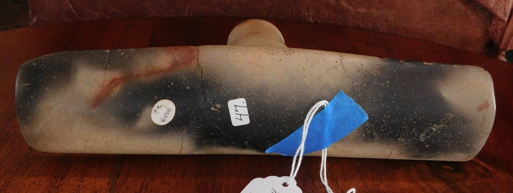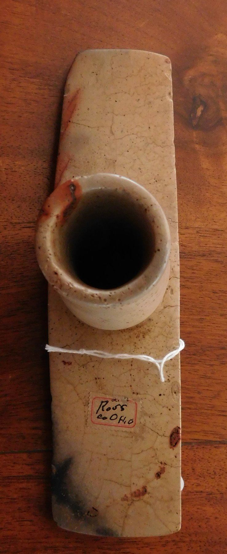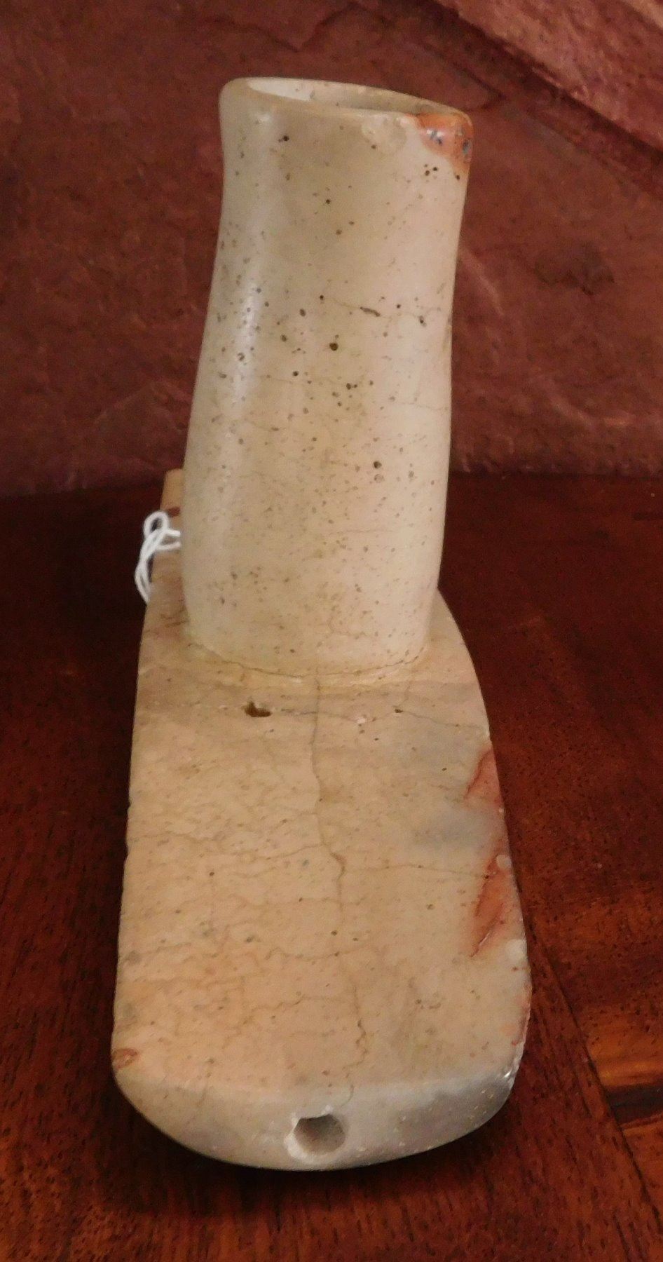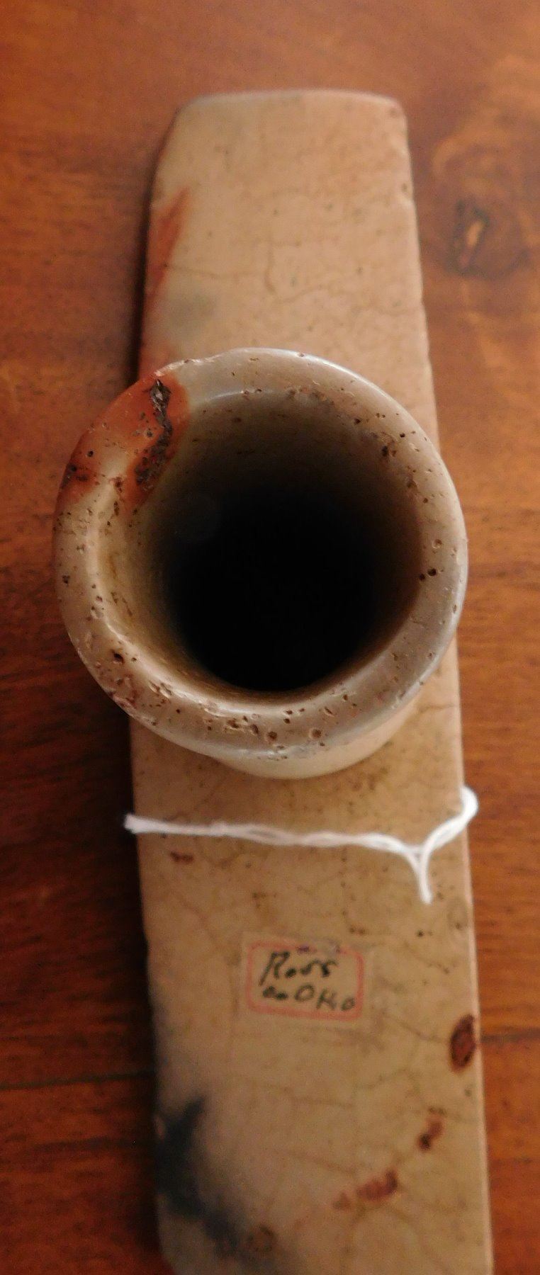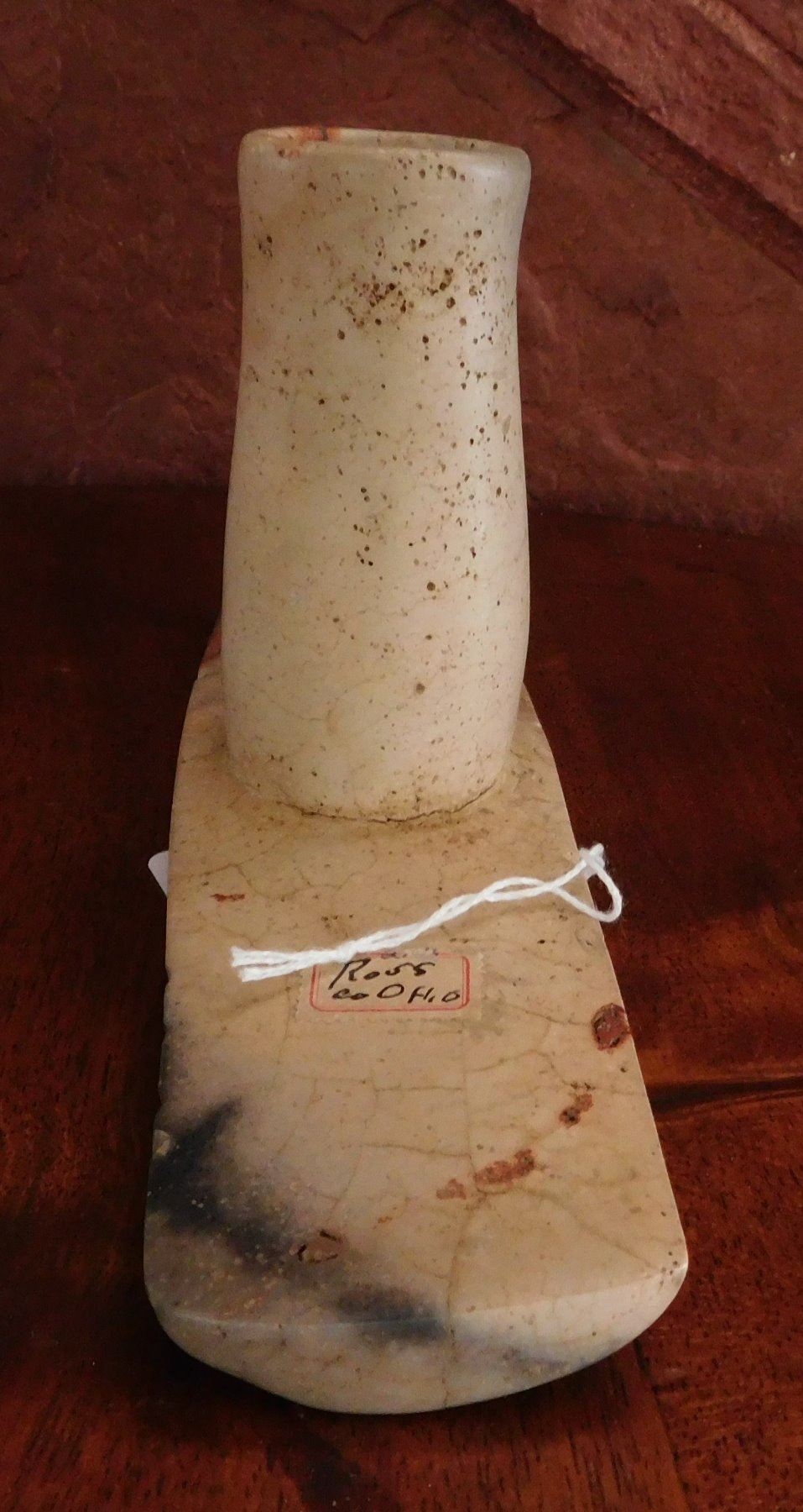 Stone Platform Pipe, pre-historic item. Made of Ohio pipestone, the item measures 8 1/2" x 4". From an old, 1960s California collection. Ross County, Ohio. Condition: Some old nicks and cracks, see images. Shipping: $30.00 w/insurance and signature