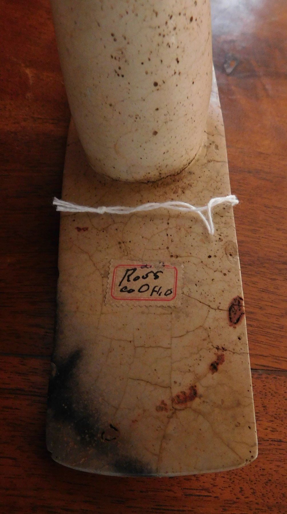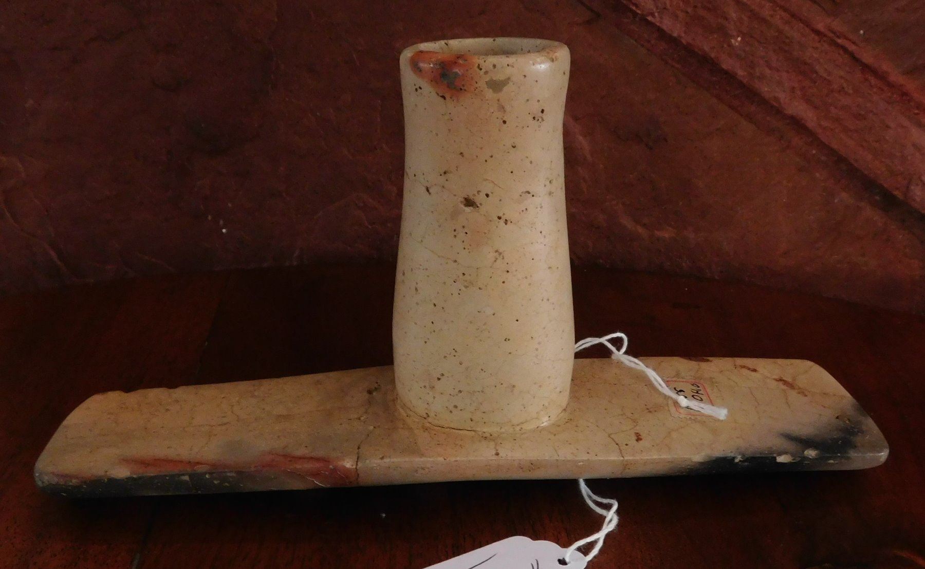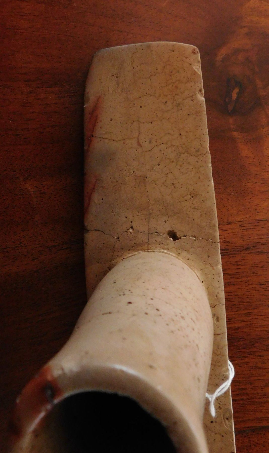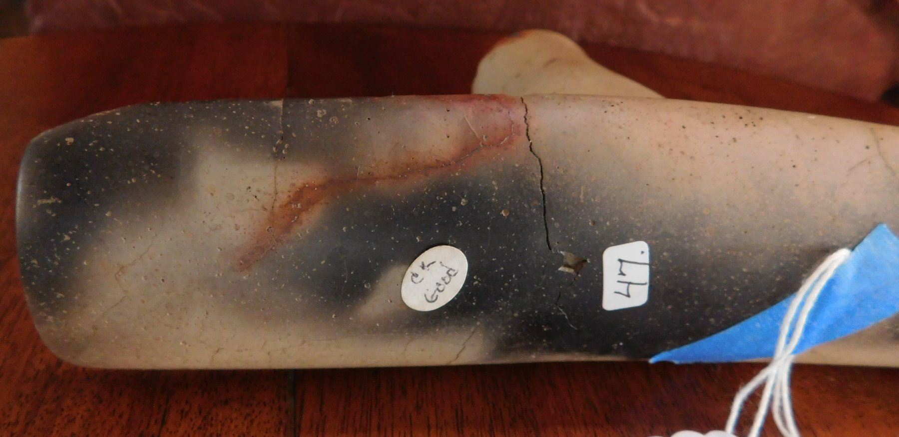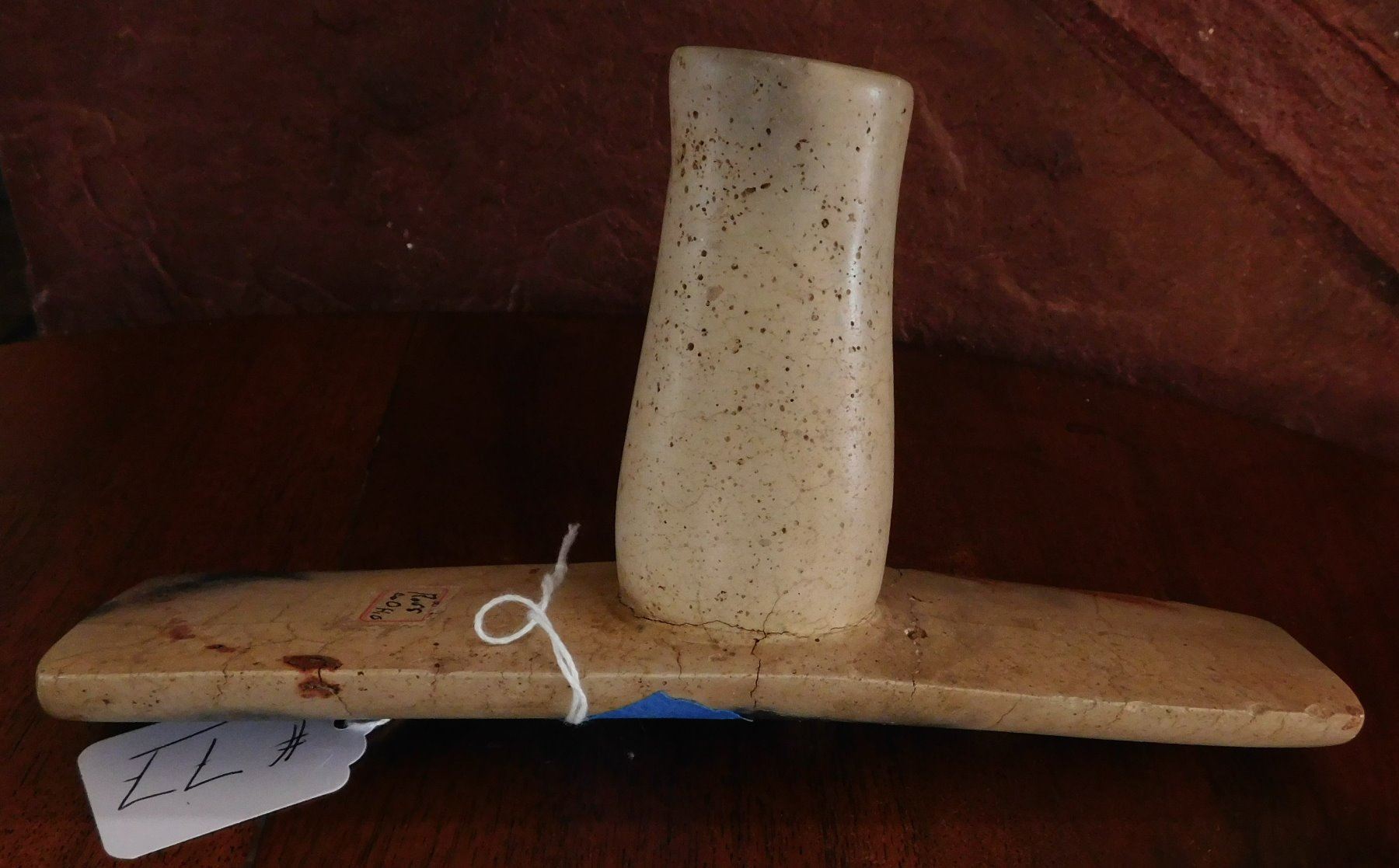 Stone Platform Pipe, pre-historic item. Made of Ohio pipestone, the item measures 8 1/2" x 4". From an old, 1960s California collection. Ross County, Ohio. Condition: Some old nicks and cracks, see images. Shipping: $30.00 w/insurance and signature