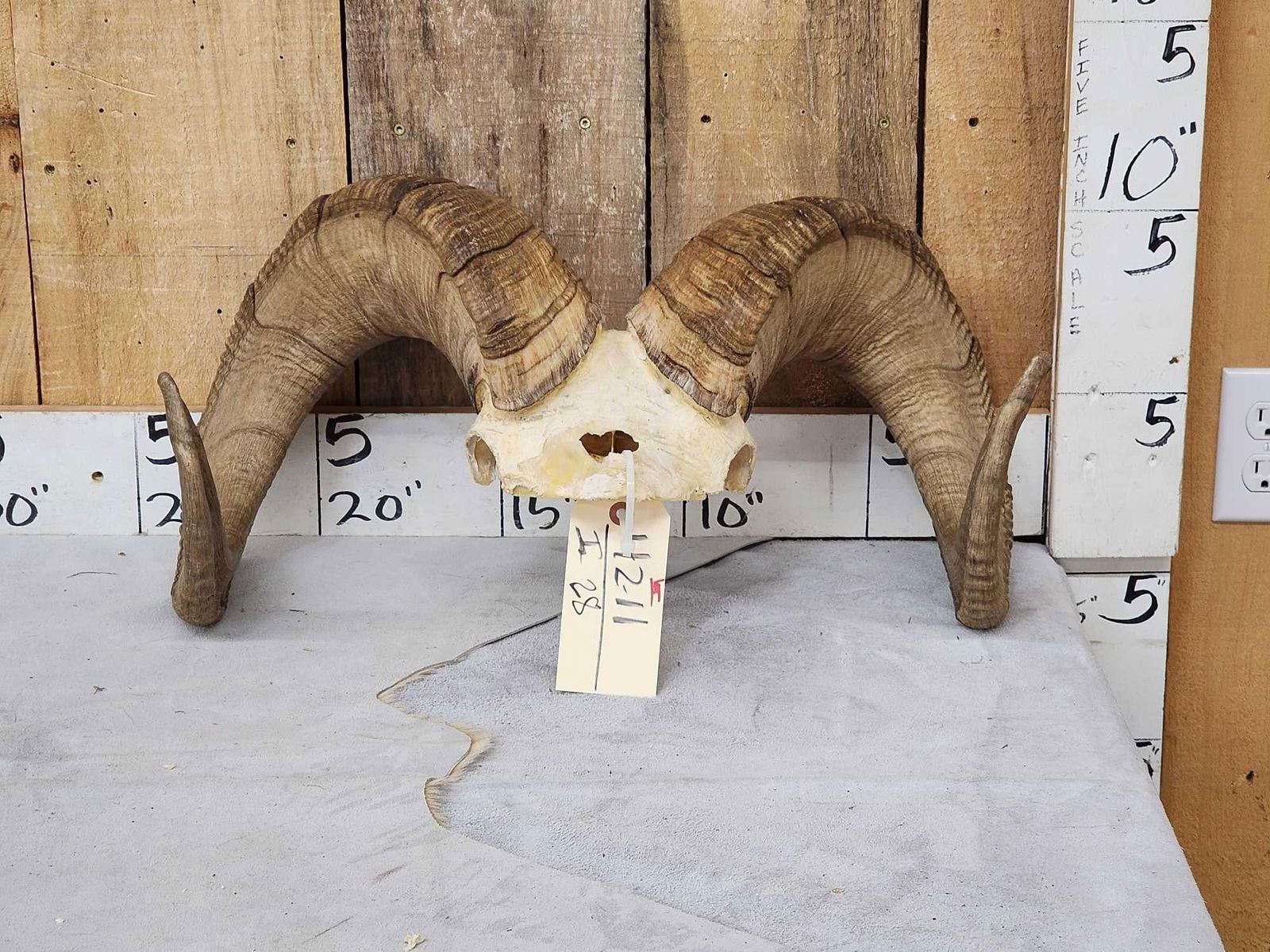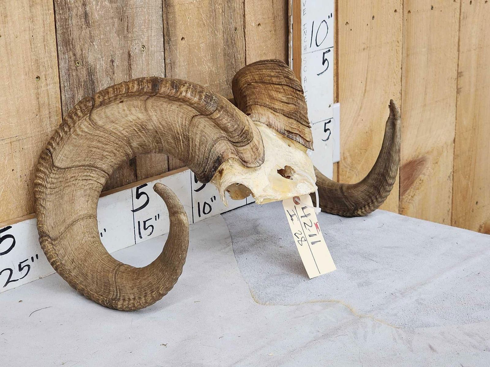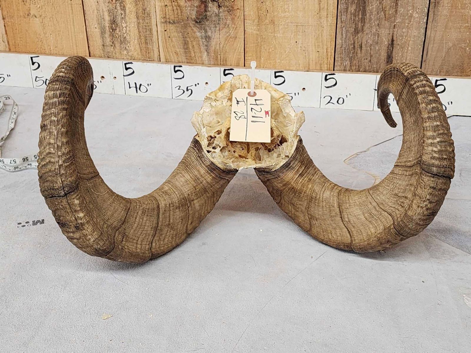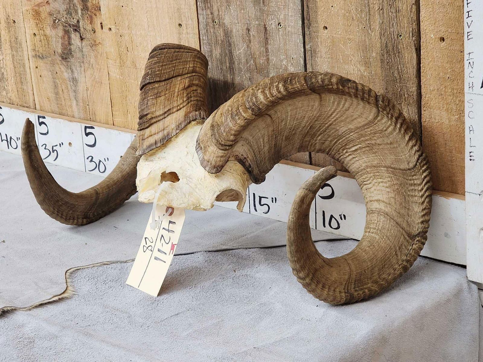 42.11 Big full curl horns Right horn length about 37" with 14" baseLeft 36 3/8" with 13 7/8" base