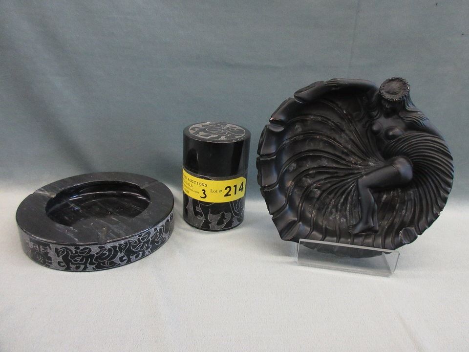Smoking set contains a 6" ashtray & 4" cigarette jar. Cigarette has chips inside the rim.