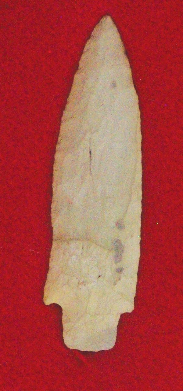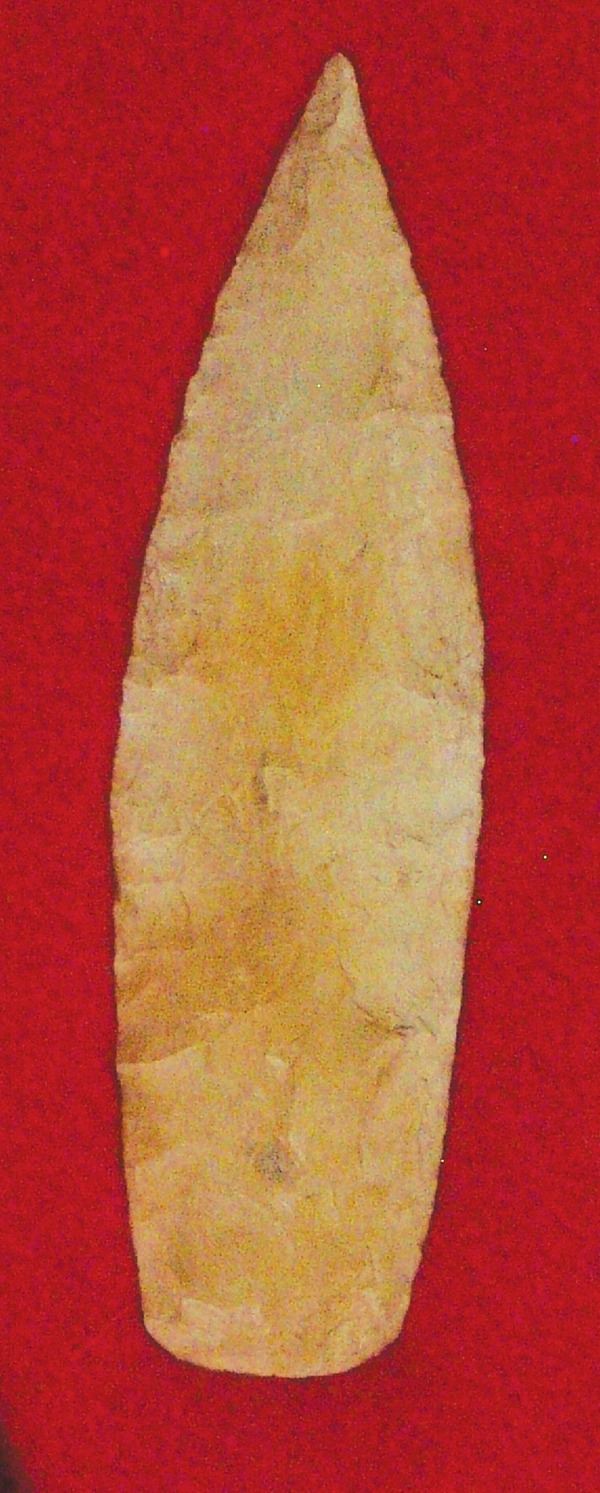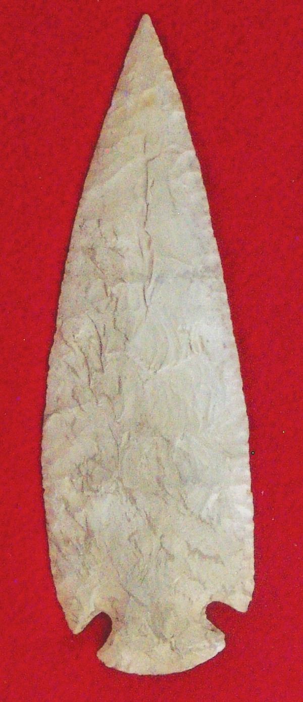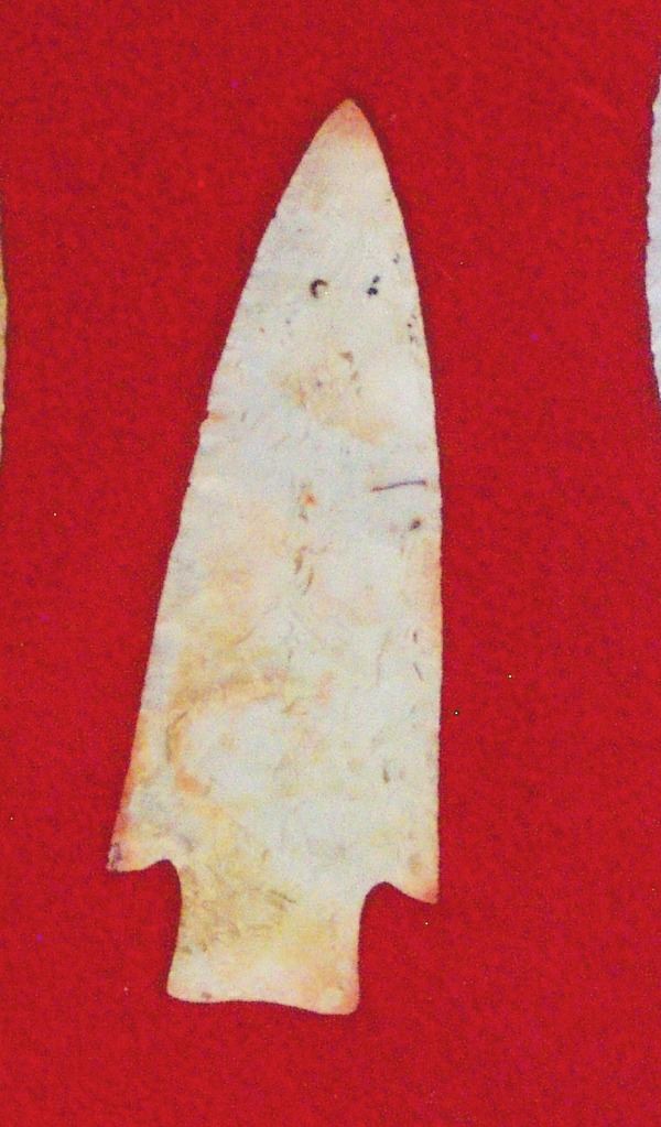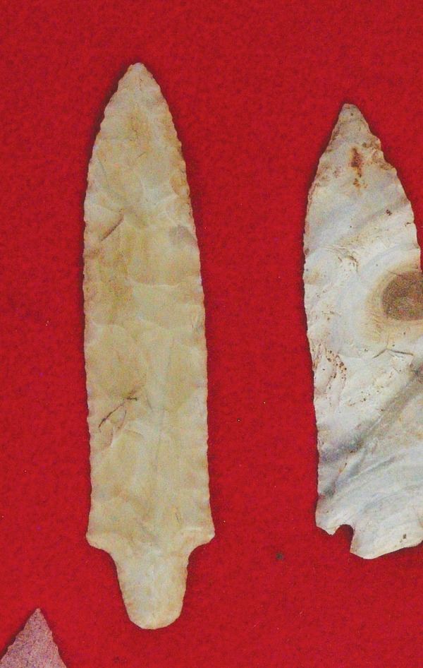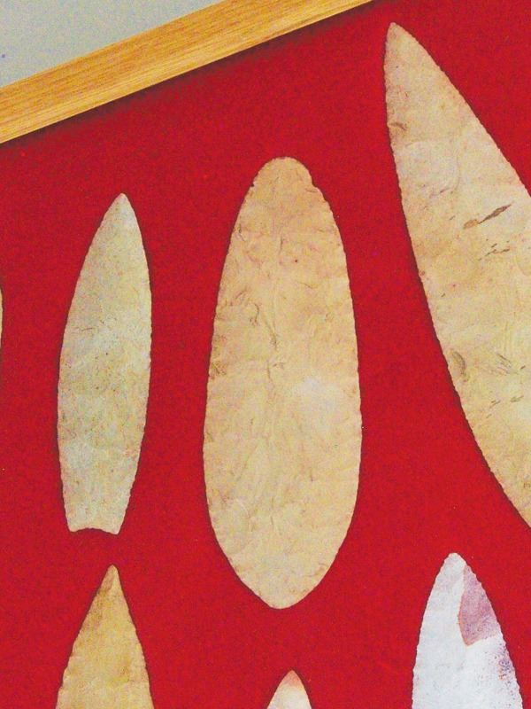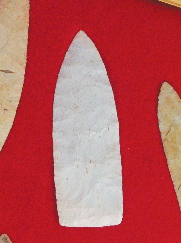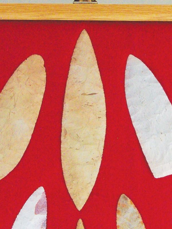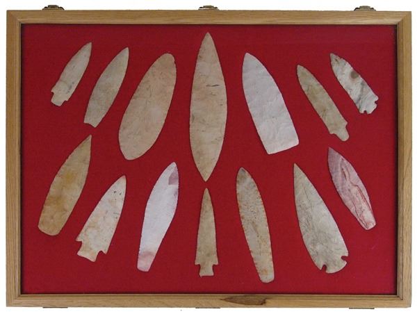 Large display case loaded with 14, expertly knapped white stone spear points, blades etc. Excellent condition.Late 1900s18" x 24"
