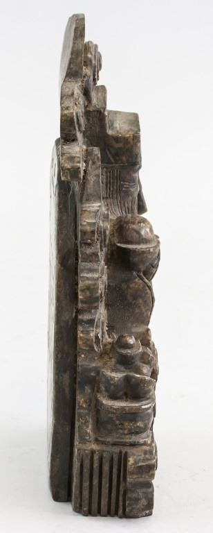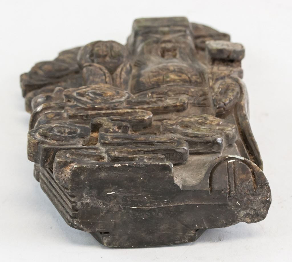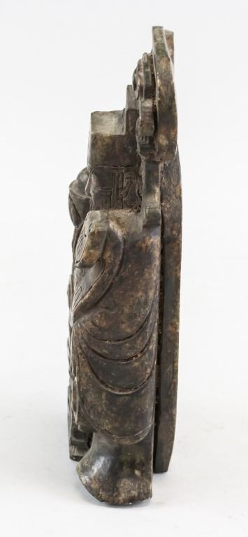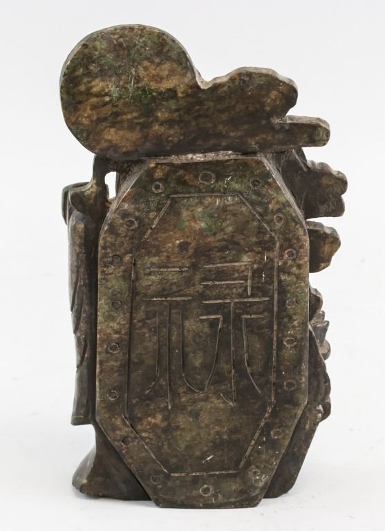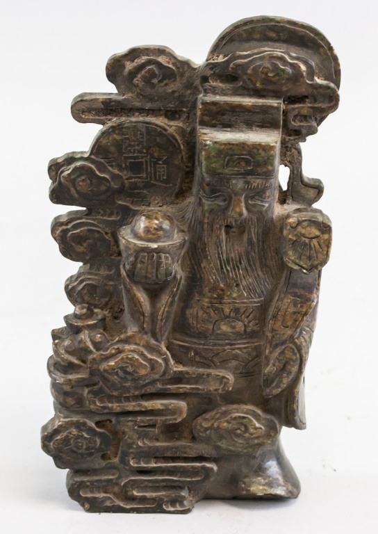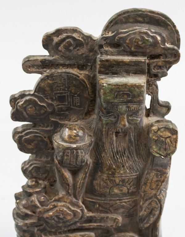 Chinese stone statue. Of brown tone. Featuring old man holding a tongbao in his hand, standing on a wreath of clouds. 10 x 19 cm. 1,438 grams.