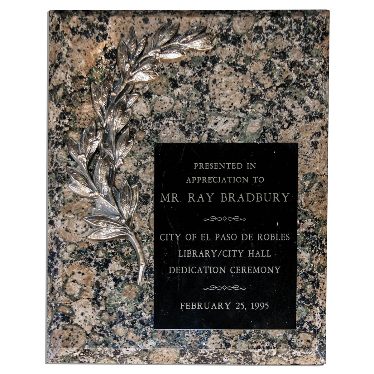 Ray Bradbury's award from the City of Paso Robles Library. Bradbury frequently mentioned in interviews the extensive time he spent in libraries during his childhood, and his love for them. Award in the form of a marble or granite tablet features an applied metal laurel sprig to the left side and dedication plate to right. Dedication is dated 25 February 1995. Measures 9'' x 11.5'' x 0.75''. Weighs 8 pounds, 8 ounces. Laurel sprig is detached, else near fine. With a COA from the Ray Bradbury estate.