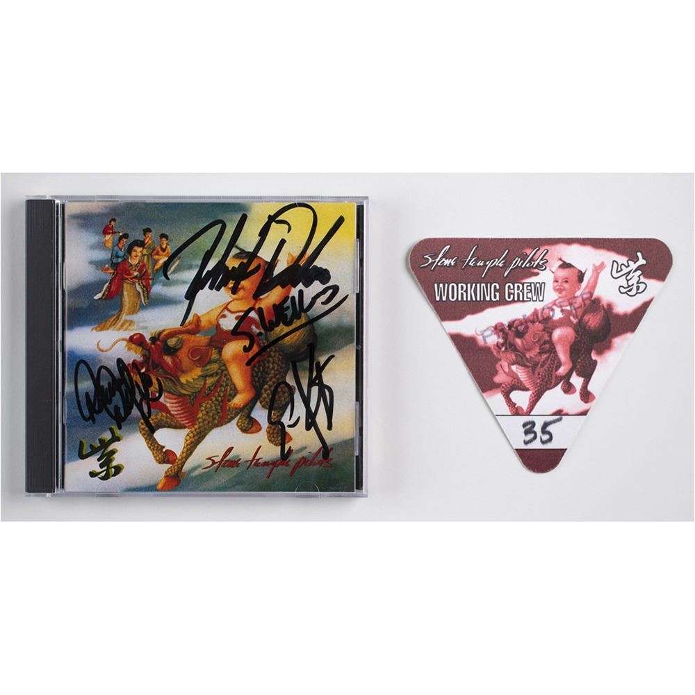 Purple CD by the Stone Temple Pilots, signed on the front cover in black felt tip by Scott Weiland, Dean DeLeo, Robert DeLeo, and Eric Kretz. In fine condition. The CD is included. Accompanied by an unused 'working crew‰Ûª backstage pass for a Stone Temple Pilots concert stamped ‰ÛÏPromoter.‰Û