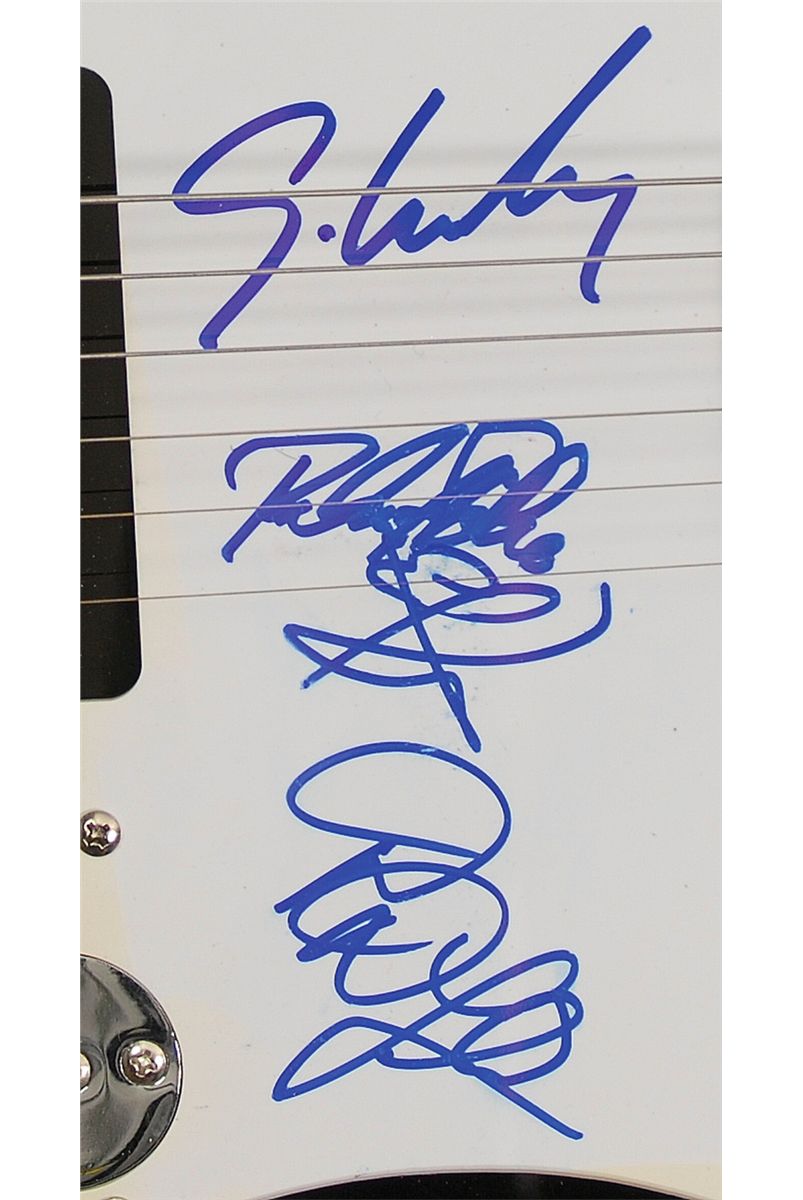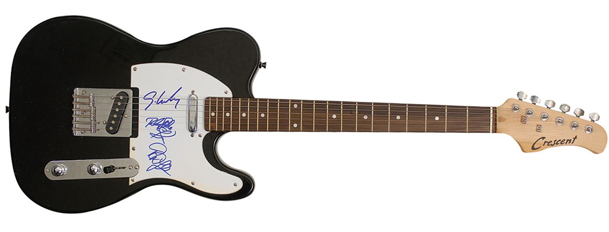 Black-bodied Crescent ‘telecaster-style’ electric guitar, signed on the white pickguard in blue felt tip by Scott Weiland, Dean DeLeo, Robert DeLeo, and Eric Kretz. In fine condition, with slight brush to a couple of signatures and some light yellowing to two edges of pickguard. Oversized.