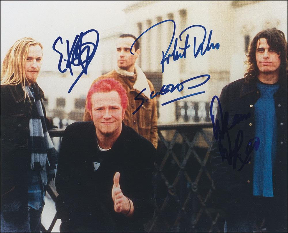 Color glossy 10 x 8 group photo, signed in blue felt tip by Scott Weiland, Robert DeLeo, Dean DeLeo, and Eric Kretz. In fine condition, with light contrast to Dean’s signature. RRAuction COA.
