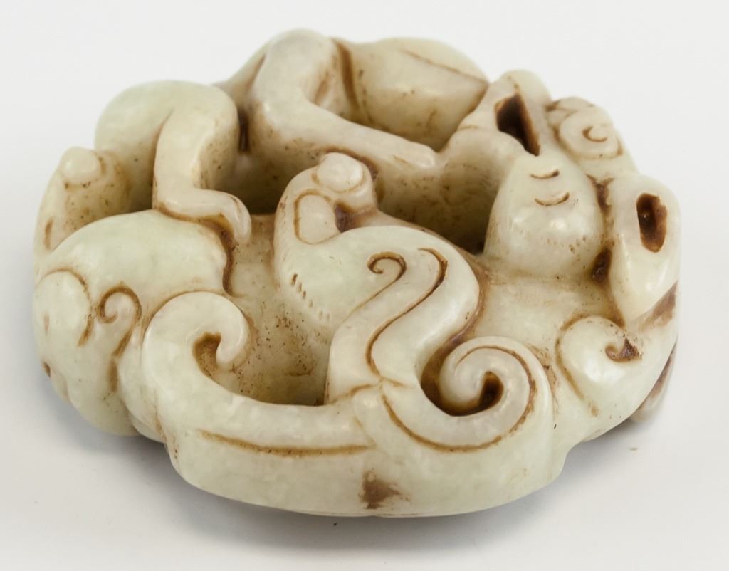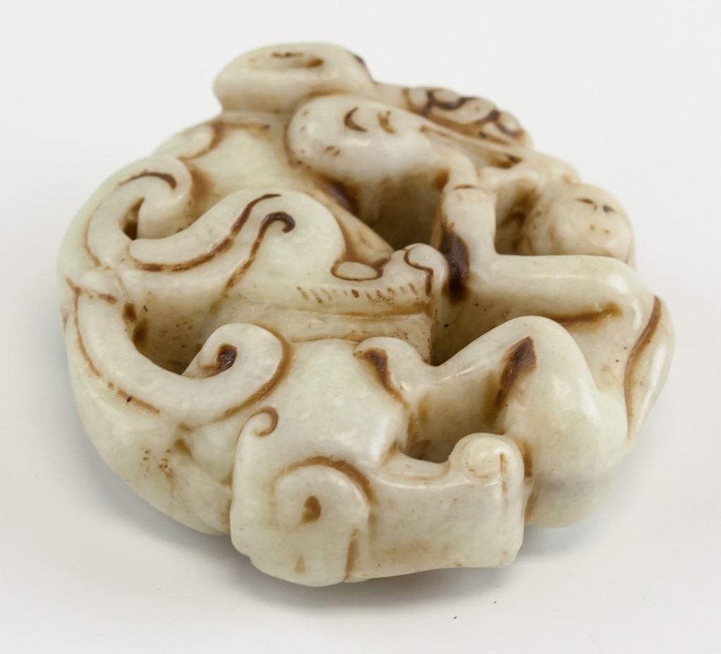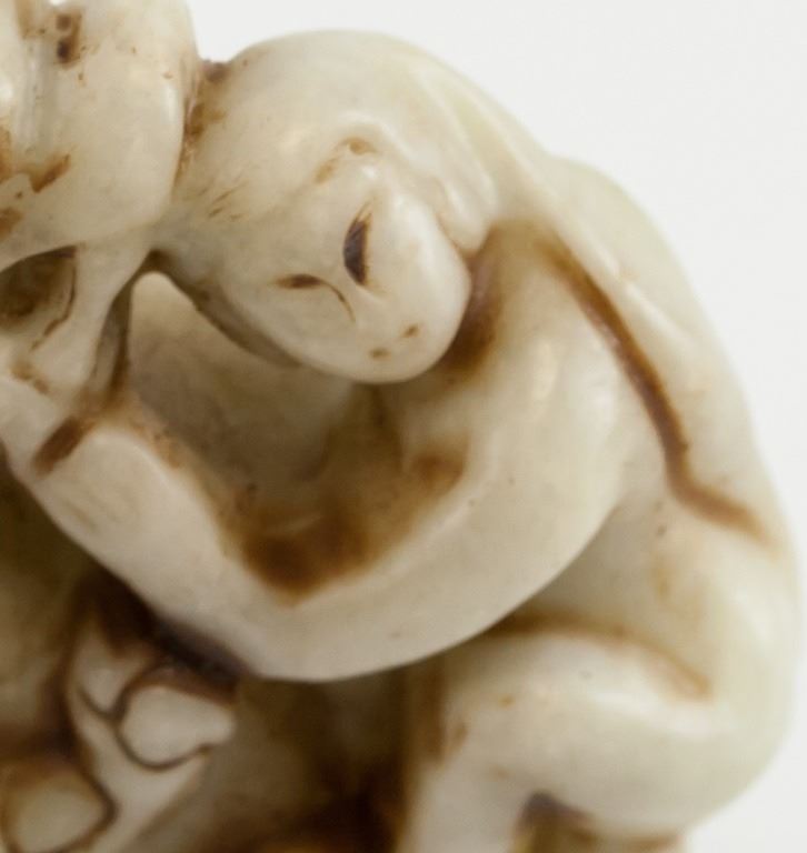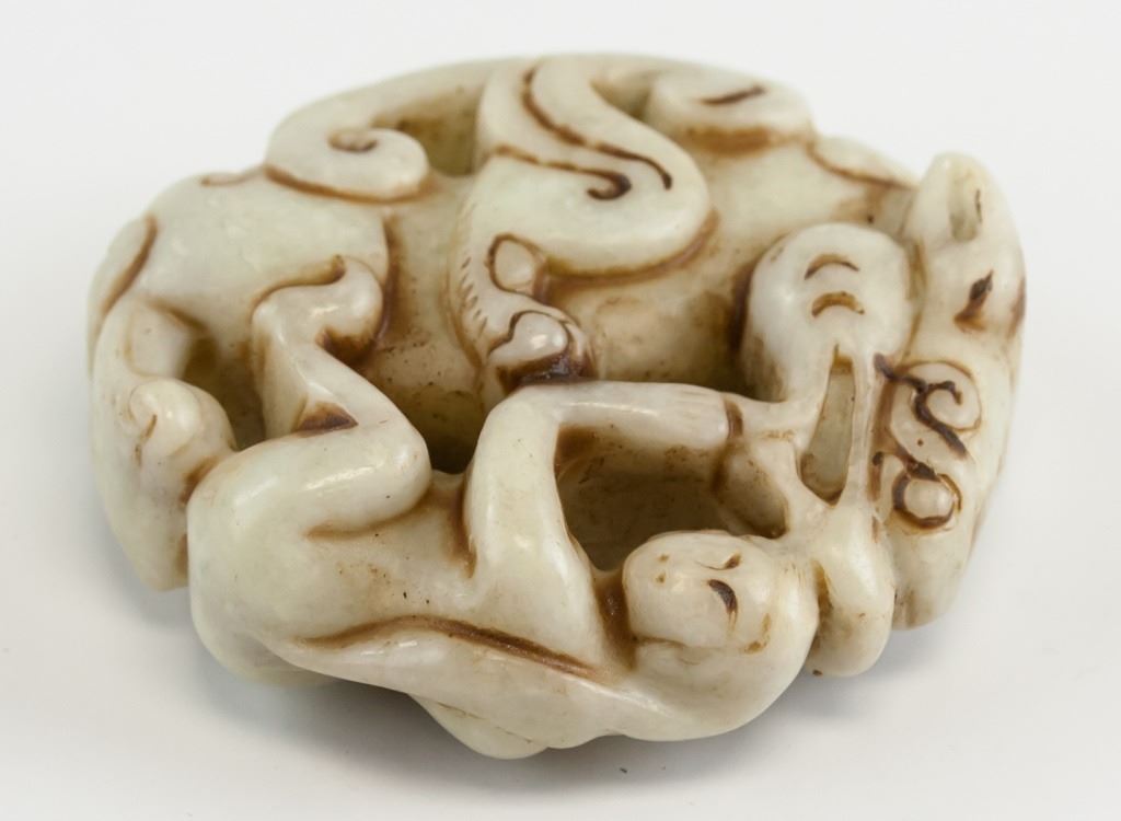 Stone toggle. Of white tone. Carved with dragon and person. 6 x 5 cm. 64 grams. Density: 2.64